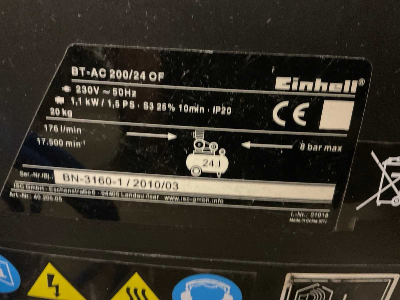 Inclusief luchtslang. Type: BT-AC 200/24 Bouwjaar: 2010 Capaciteit.: 8bar Luchtstroom: 175l/min Vermogen: 1.1kW Buffertank inhoud: 24l Aansluiting: 230V Totale afmeting L: 500mm Totale afmeting Breedte: 250mm Totale afmeting Hoogte: 450mm