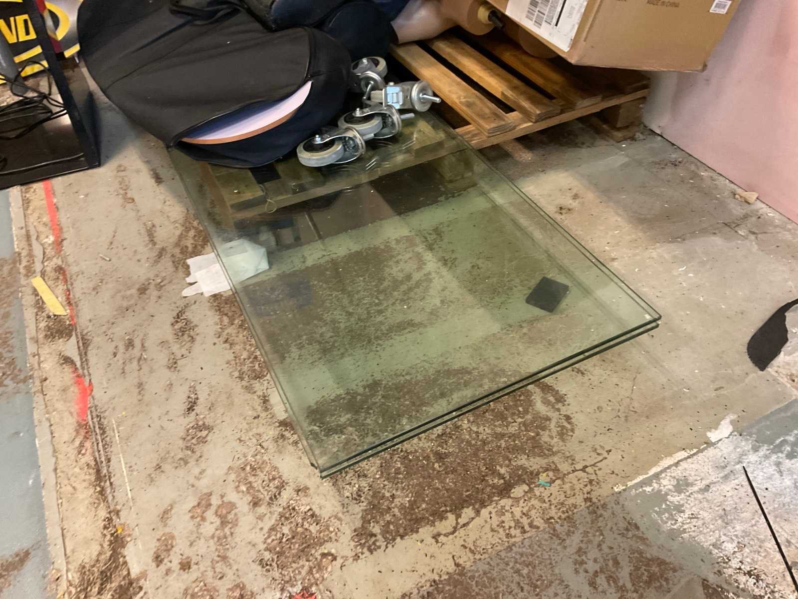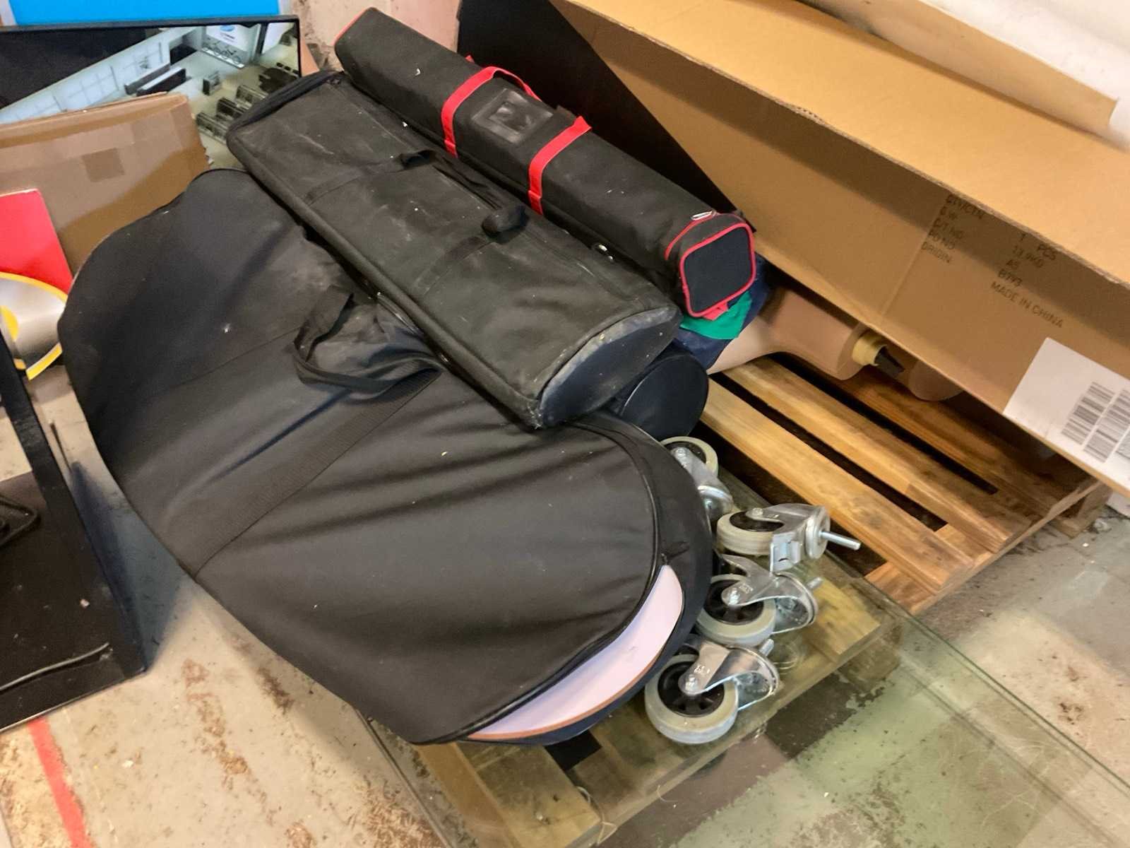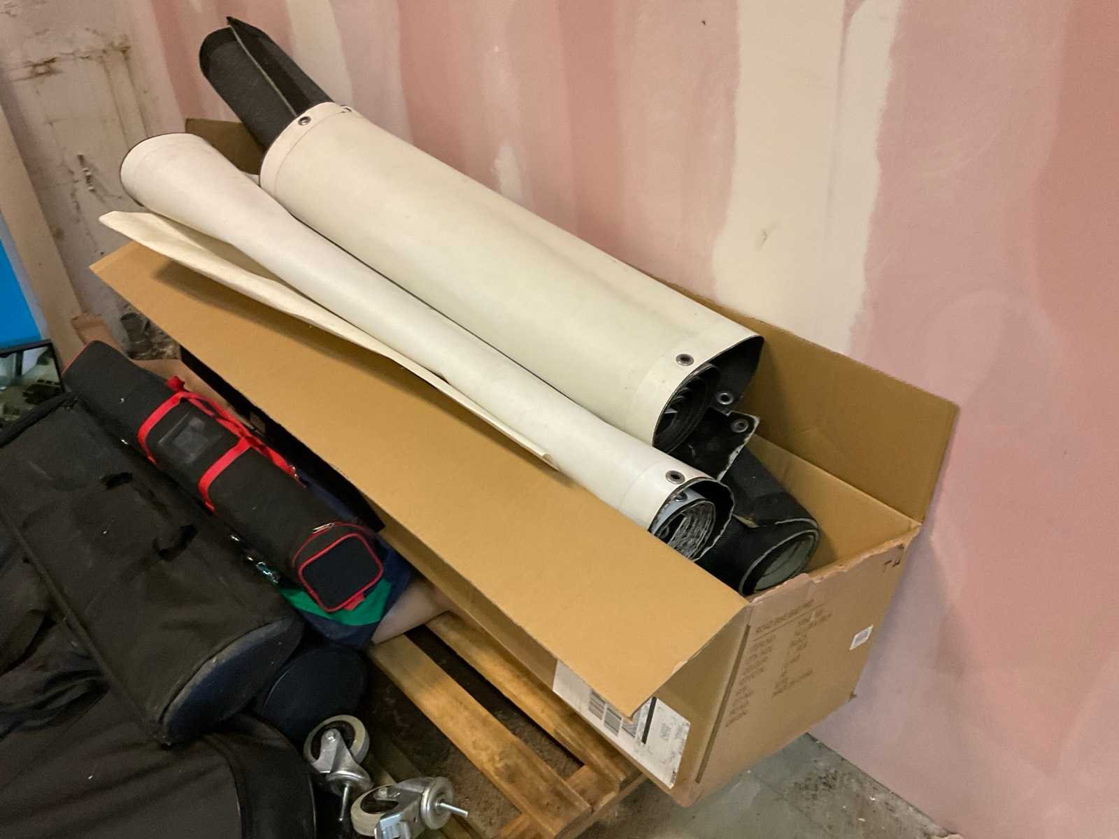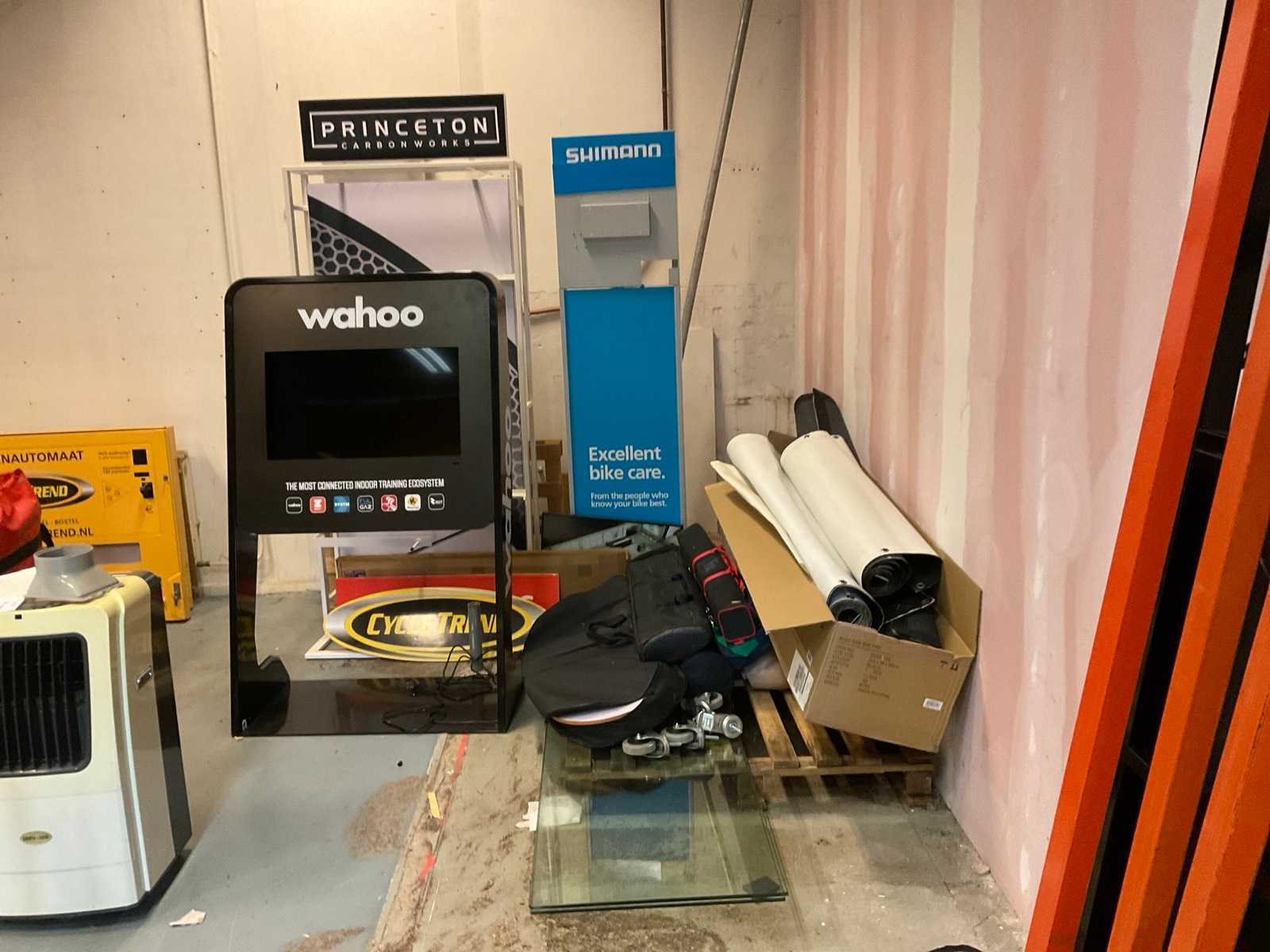 Wahoo reclame banner met televisie, Princeton en Shimano display, diverse borden, displays in zak, posters op kanvas, glazen platen en wielen.