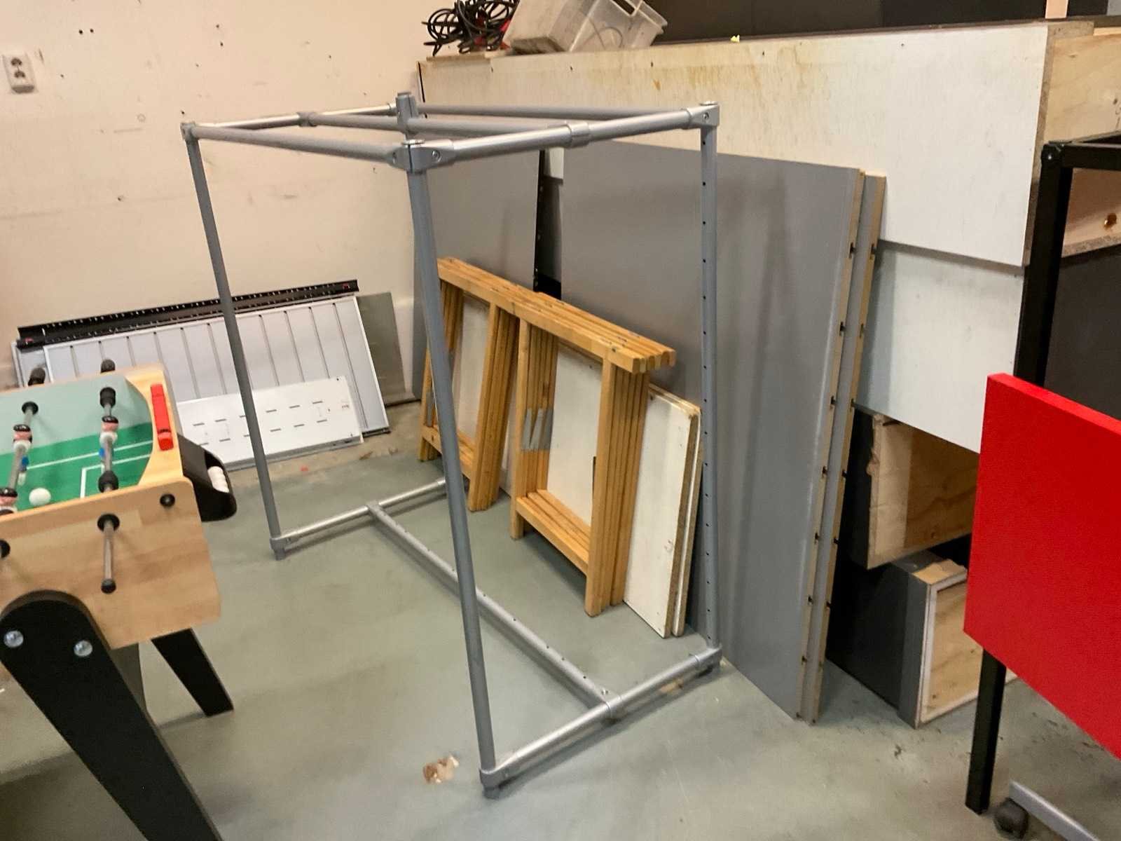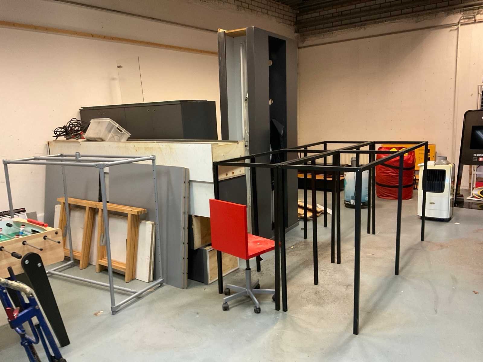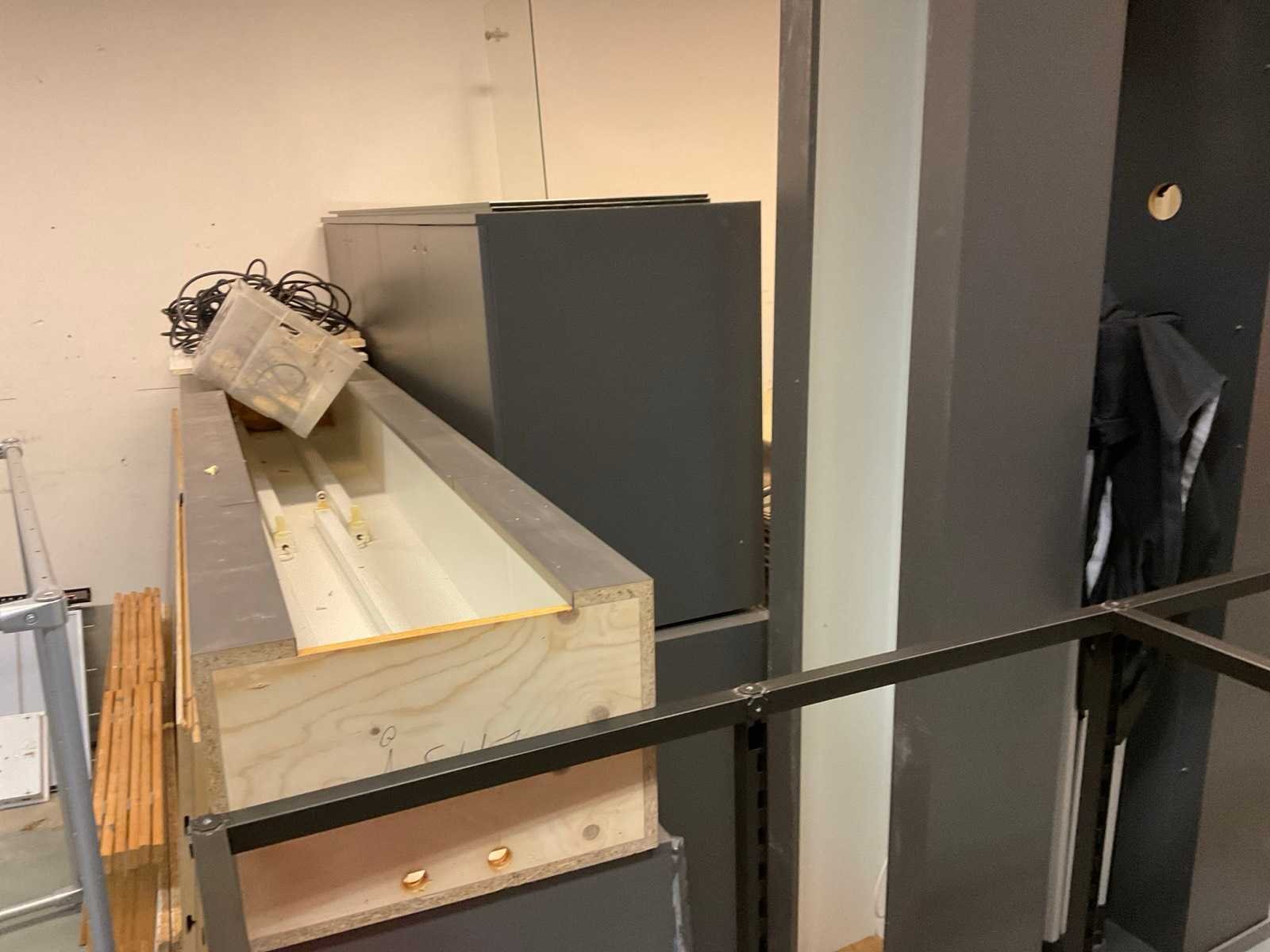 Bestaande uit onder andere: diverse kasten, stellages, platen, stoel, 3x podium.