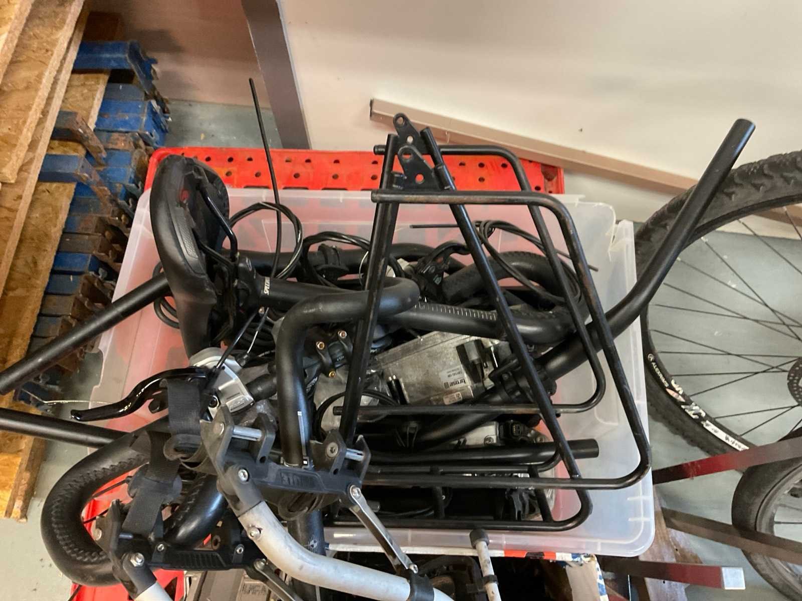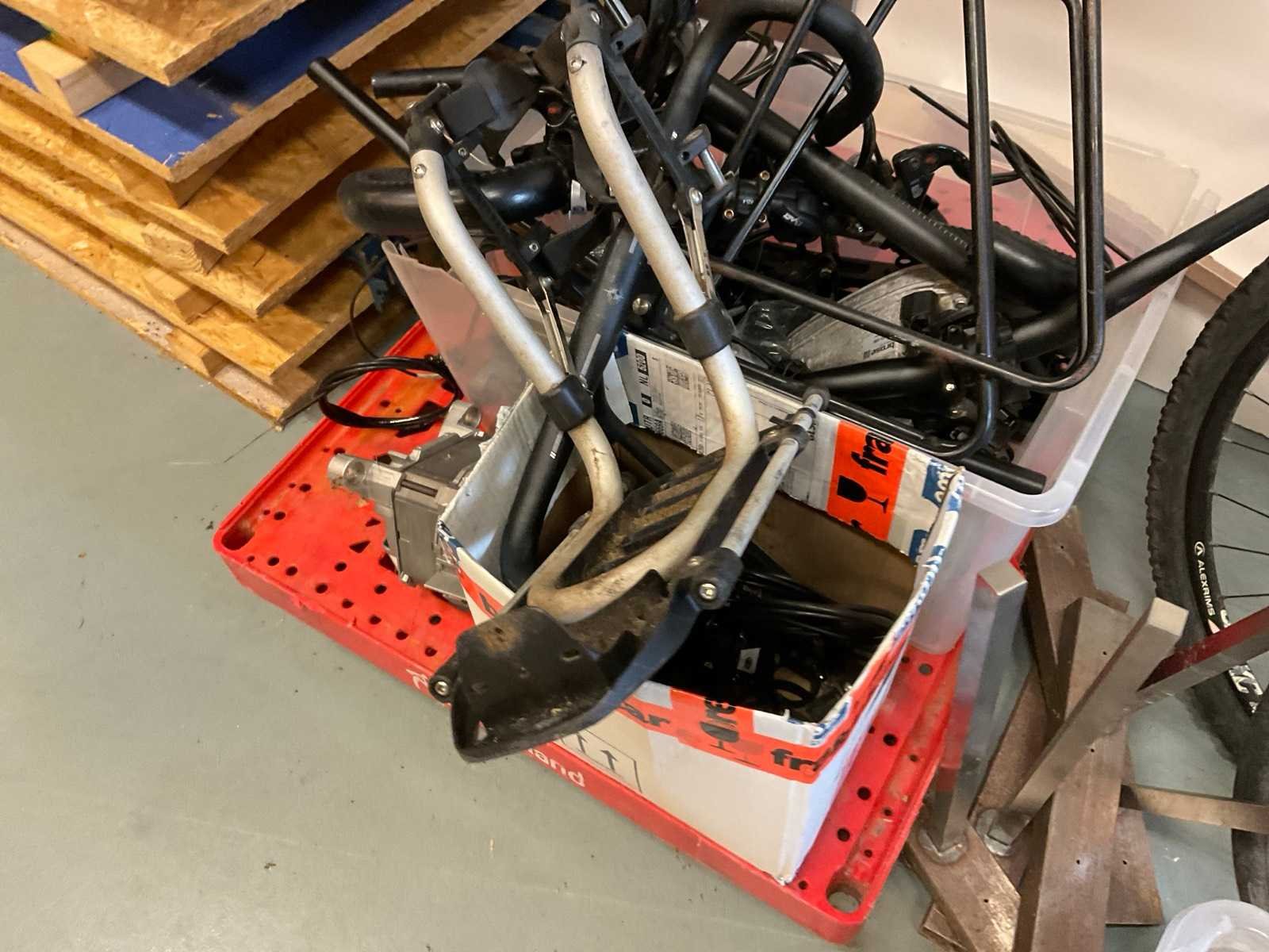 Bestaande uit onder andere: twee fietsen voor onderdeken, bakken onderdelen, banden.