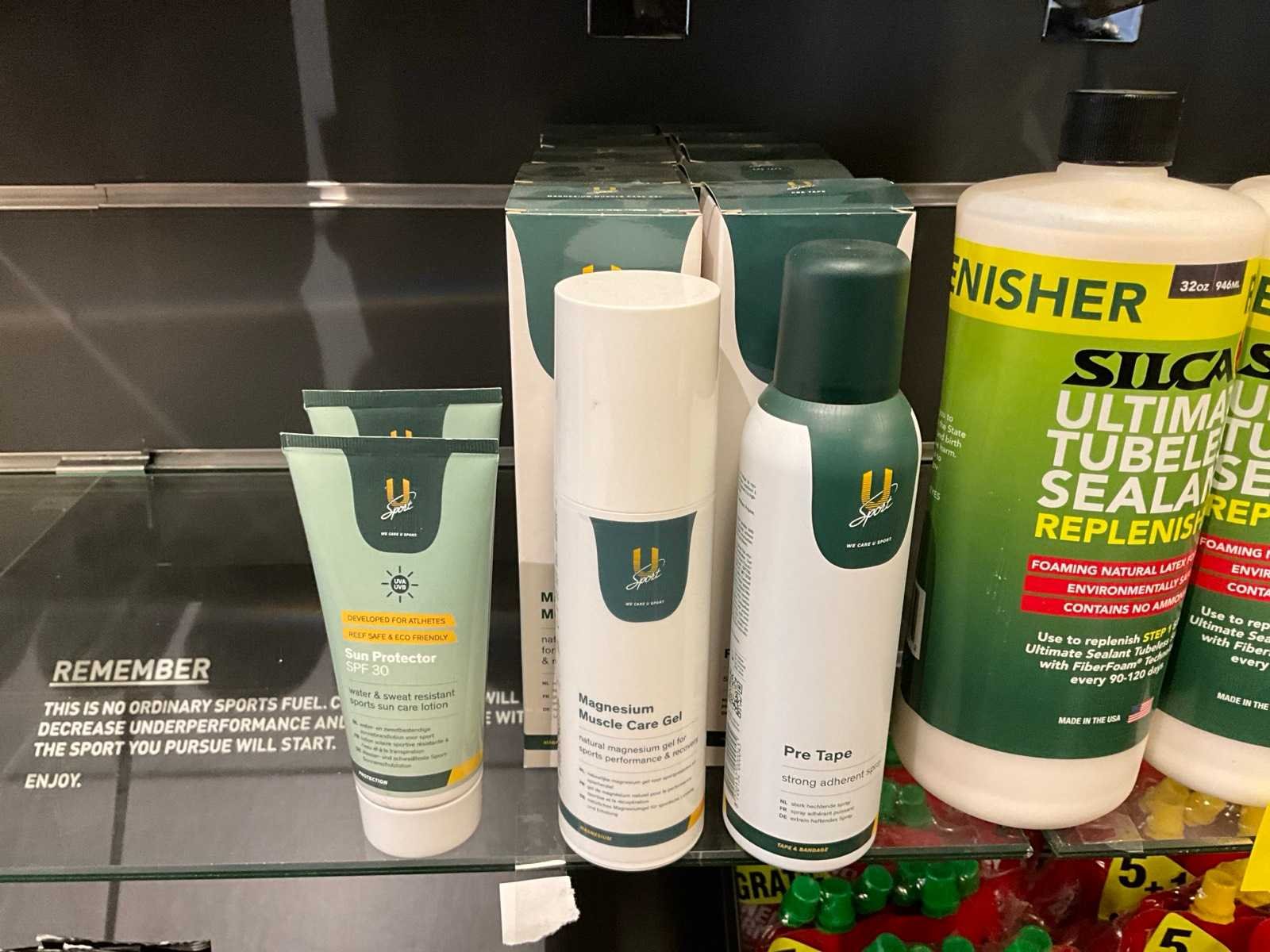 Op 1 plank; bestaande uit onder andere: zonnebrandcrème, magnesium muscle care gel, spray wax, funky feet, etc