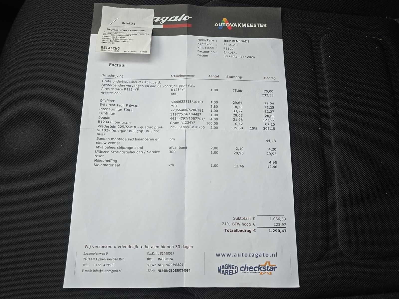 Hoofdairbag Zij-airbags 1368ccm 103/18/25kw 2-lagen mica 6 luidsprekers 6-versn wisselbak Airconditioning Banden 225/55 r 18 Bu-spieg best asph Bu-spiegel gespoten Bu-spiegel verwarmd Cruise control Dakreling Dashboard leeroptiek Grille zilver Keyless entry Mistlampen Mistlampen achter Navigatiesysteem Noodwiel Parkeerhulp a Port-grepen gespoten Prod-land italie Radio met cd / mp3 Ruiten donker getint Sleepoog v/a Snelheidsbegrenzer Stoelverst 6-voud hm Stuurwiel leer Systeem start & stop Treeplanken zijkant Va model 2017 Velgen 7 j x 18 lm Verwarming verzwaard Voorwielaandrijving Merkspecifieke pakketten & opties 8DV : Infotainment Systeem met 5-inch Touchscreen, Navigatie, Uconnect LIVE® en Bluetooth®(Remote USB vereist) Standaard opties Airbag bestuurder Airbag passagier Airbag(s) hoofd voor Airbag(s) side voor Airco Alarm klasse 1(startblokkering) Anti Blokkeer Systeem Anti doorSlip Regeling Armsteun voor Audio installatie Bandenspanningscontrolesysteem Bestuurdersstoel in hoogte verstelbaar Bluetooth Buitenspiegels elektrisch verstel- en verwarmbaar Buitenspiegels in carrosseriekleur centrale vergrendeling met afstandsbediening Cruise control Dakrails Elektrische ramen voor en achter Elektronisch Stabiliteits Programma extra getint glas achter Hill hold functie Lichtmetalen velgen 18" mistlampen voor Multimedia-voorbereiding Navigatiesysteem Parkeersensor achter Start/stop systeem stuur leder stuur multifunctioneel Stuur verstelbaar Stuurbekrachtiging Kenteken: PP-917-J Merk: Jeep Model: Renegade Type: 1.4 MA Night Eagle 2 Bouwjaar: 2017 Afgelezen kilometerstand: 88900km Cilinderinhoud: 1368cc Vermogen (kW): 103kW Brandstof: Benzine Chassisnummer: 1C4BU0000HPF70240 Datum eerste toelating: 2017-08-17 Datum eerste toelating (NL): 2017-08-17 APK vervaldatum: 2026-06-08 Vermogen (pk): 141hp Aandrijving: Start en rijdt Aantal zitplaatsen: 5 Kleur: grijs Transmissie: Handgeschakeld Emissieklasse: 6 Aantal deuren: 5 Aantal sleutels: 1 Ledig gewicht: 1295kg Bruto BPM (NL): 7731€ Aantal cilinders: 4 Carrosserie: mpv Carfax Link: https://was.carfax.eu/v0/api/ccdid/5100016408/svc/201/vinreg/PP917J/checksum/eyJhbGciOiJIUzI1NiIsInR5cCI6IkpXVCJ9.eyJleHAiOjE3NzA2NDY3OTJ9.Ki2oUQpUQGA1hlNUT82iZrnQk67WlCSgiLNWT-gzxHw Start en rijdt: Start and drive startinformatie : Start en rijdt Self drive export possible : true Airconditioning: true
