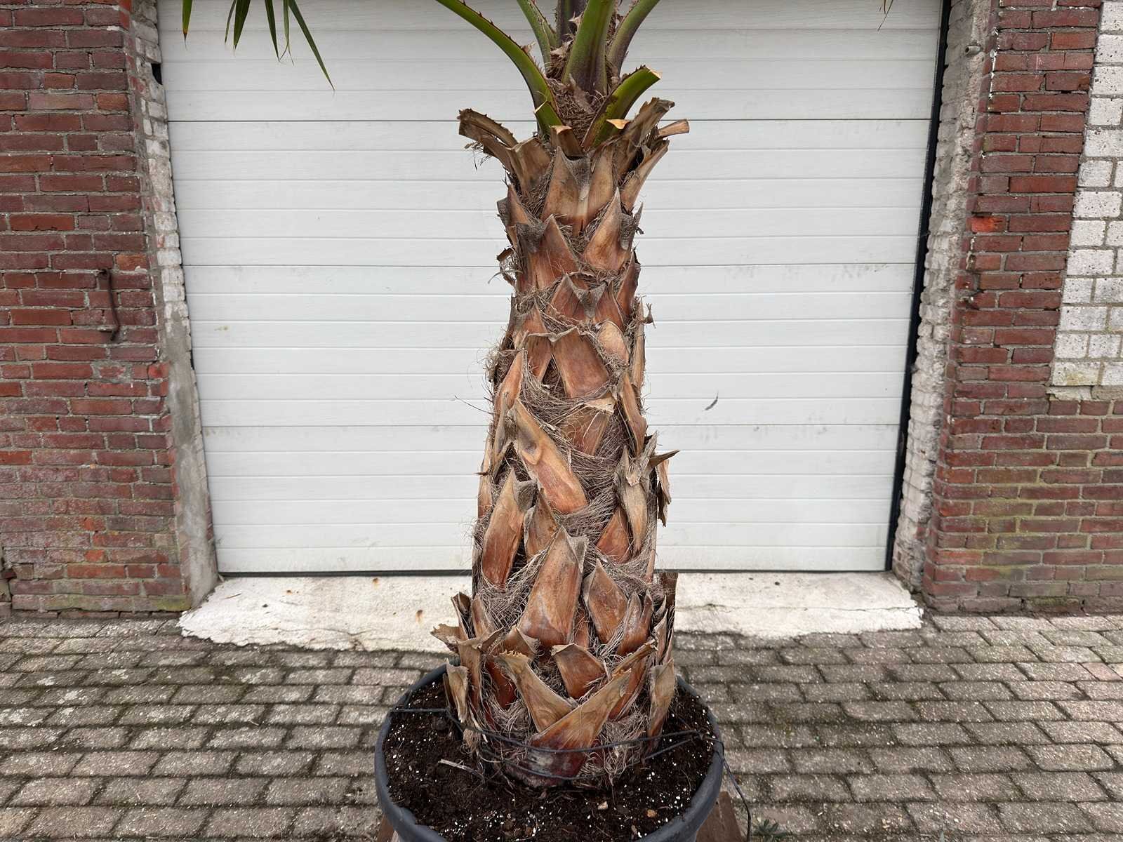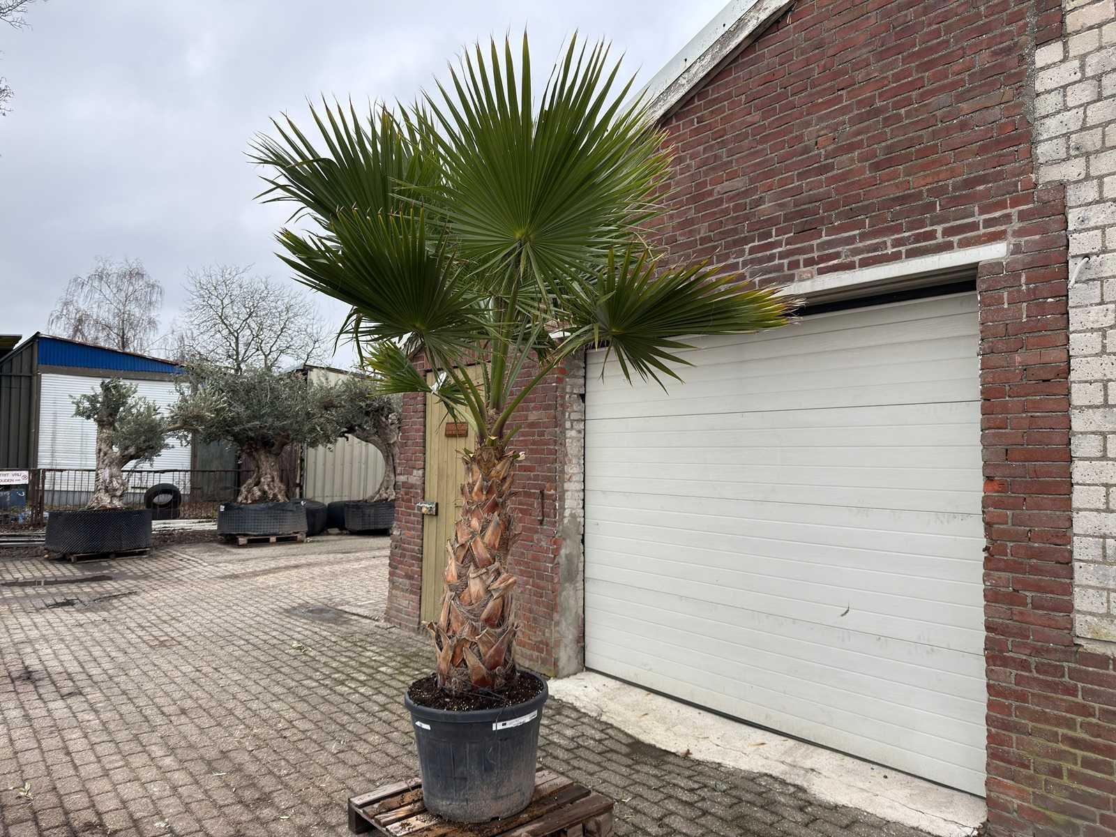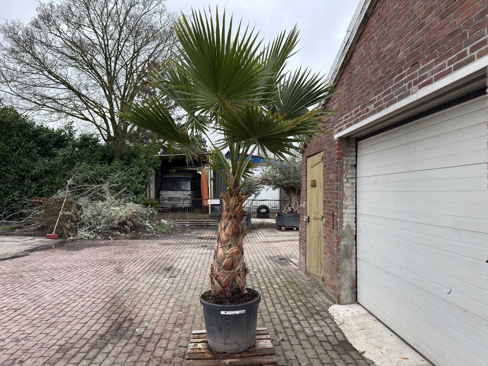 Type: Mexicaanse Waaierpalm Latijnse benaming: Washingtonia Robusta Hoogte ca.: 280cm In pot: true Diameter ca.: 300cm Stamdikte: 100cm Leeftijd: 200 Eigen gewicht: 2000