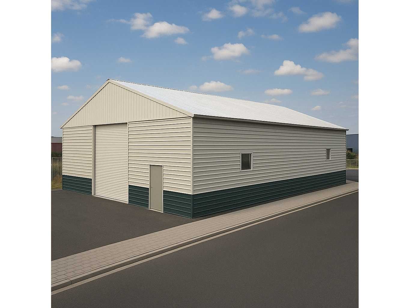 Voorzien van 50x50x1,5 mm en 40x40x1,2 mm stalen buizenframe, automatische elektrische roldeur en zijdeur, vier ramen, afmetingen binnenzijde: 1496x1255x635 cm, wandhoogte: 417 cm, elektrische voorziening roldeur: 230 Volt, kleuren plaatwerk RAL9001+RAL7016. Merk: Field Industries Materiaal: Metaal Type: 4350 Bouwjaar: 2025 Totaal oppervlakte: 195m² Totale afmeting L: 14960mm Totale afmeting Breedte: 13030mm Totale afmeting Hoogte: 6350mm Eigen gewicht: 3900kg