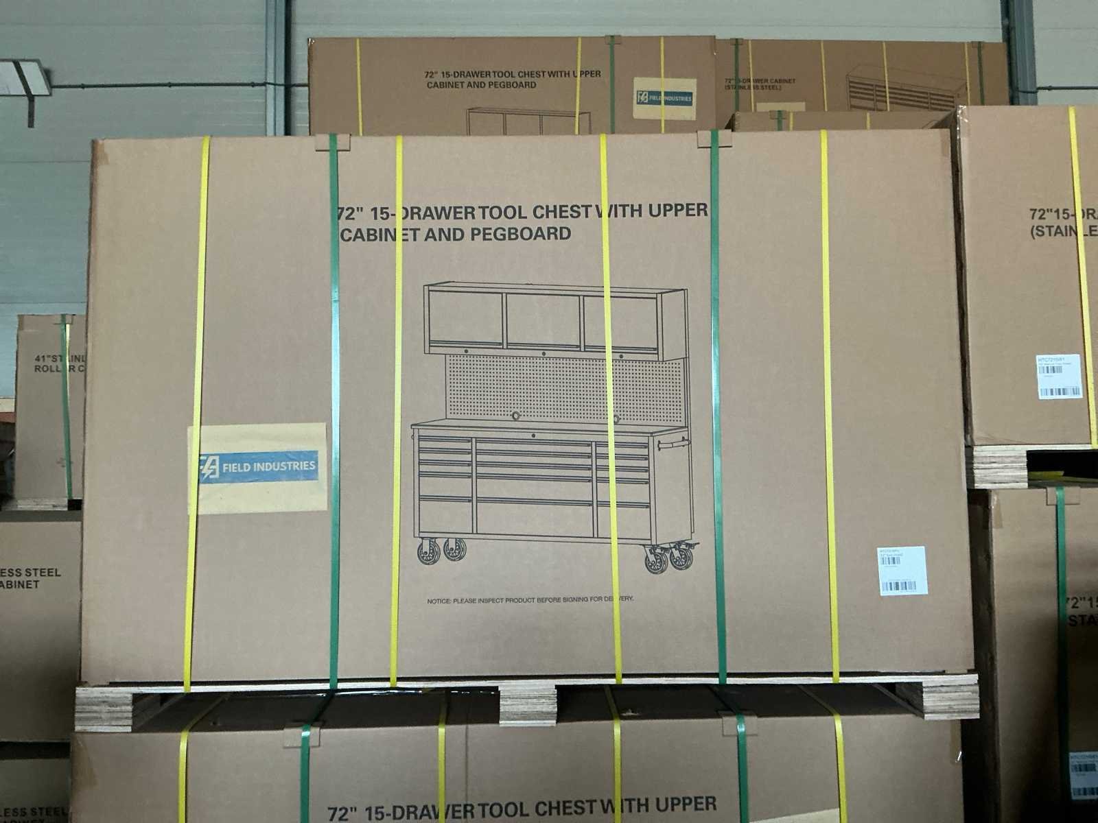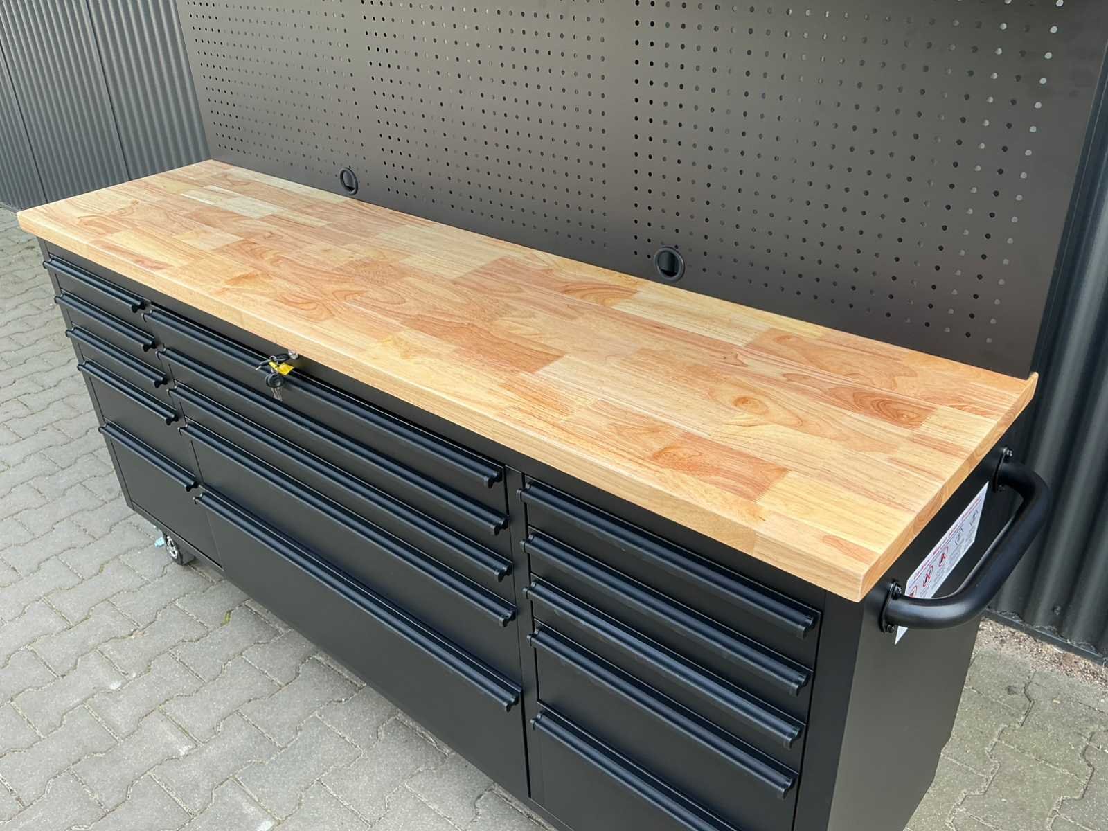Breedte 180 cm Voorzien van poedercoating, luxe afgewerkt houten werkblad (dik 35 mm), 15 laden, 3 bovenkasten, achterwand, 4 zwenkwielen (2 voorzien van rem), afsluitbaar met sleutels, ongebruikt in doos. Merk: Field Type: 7218 Black Bouwjaar: 2025 Totale afmeting Breedte: 1828mm Totale afmeting Hoogte: 1869mm