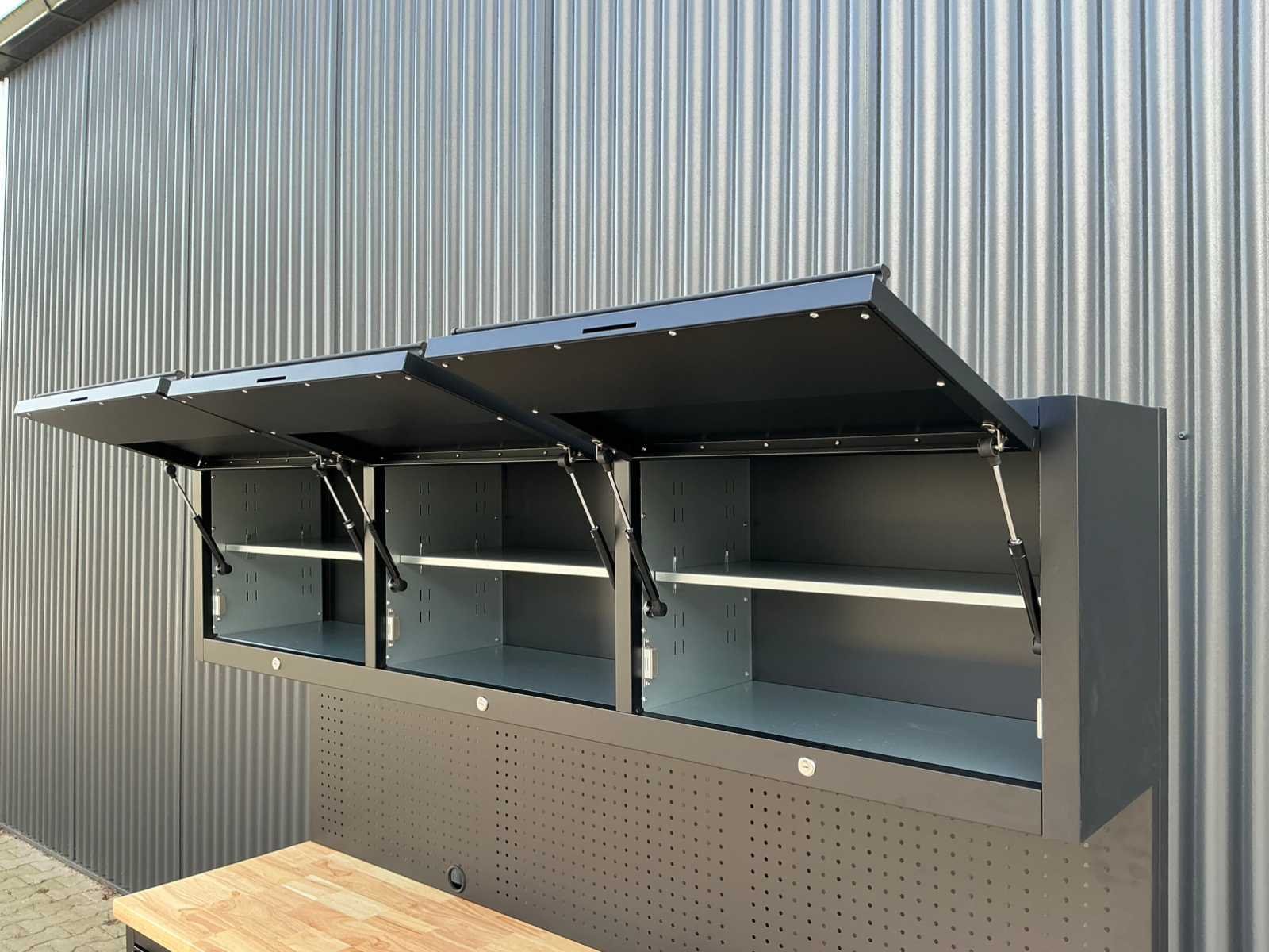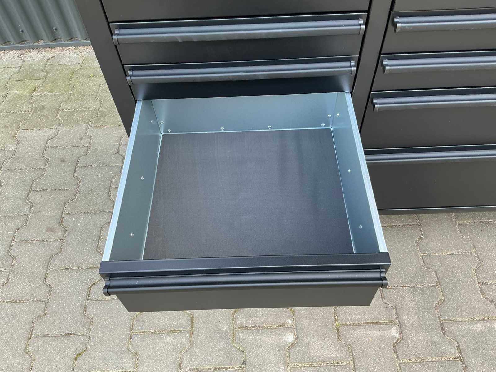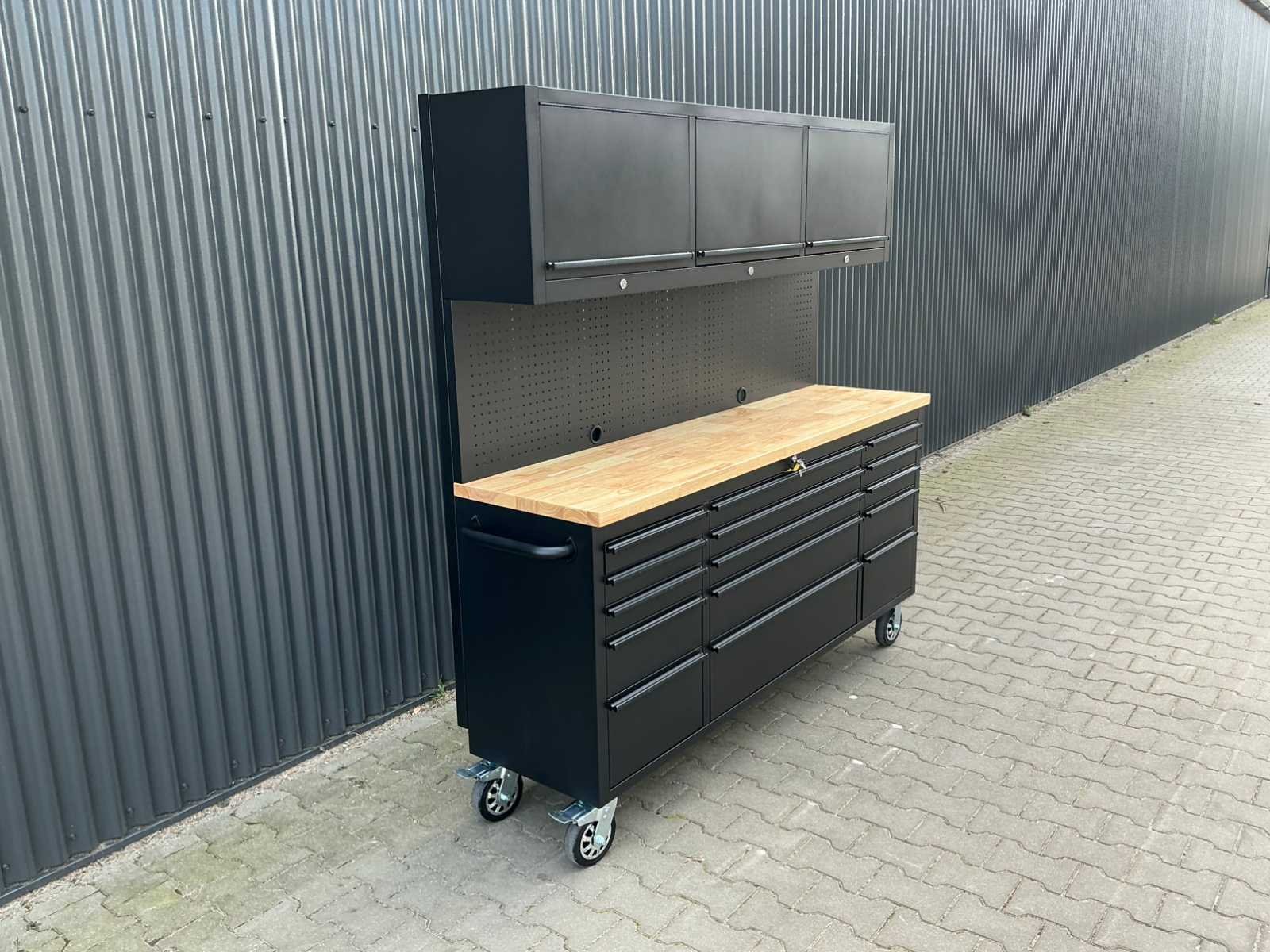 Breedte 180 cm Voorzien van poedercoating, luxe afgewerkt houten werkblad (dik 35 mm), 15 laden, 3 bovenkasten, achterwand, 4 zwenkwielen (2 voorzien van rem), afsluitbaar met sleutels, ongebruikt in doos. Merk: Field Type: 7218 Black Bouwjaar: 2025 Totale afmeting Breedte: 1828mm Totale afmeting Hoogte: 1869mm