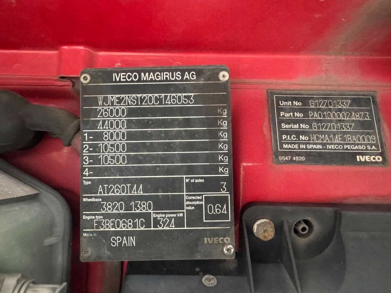 Aangeboden: robuuste Iveco Stralis AT260T44 6x4 kipper met kraanopbouw. Deze veelzijdige vrachtwagen is uitgerust met een Palfinger 16052 autolaadkraan en hydraulische kipper, waardoor hij breed inzetbaar is voor bouw, infra, transport en grondverzet. De krachtige 324 kW dieselmotor in combinatie met automatische transmissie zorgt voor comfortabel rijden en voldoende vermogen onder zware omstandigheden. Met een laadvermogen van circa 11 ton en een GVW van 26.000 kg is deze Stralis geschikt voor professioneel gebruik. Specificaties Merk en type: Iveco Stralis AT260T44 Configuratie: 6x4 kipper met kraan Bouwjaar: 2005 Kilometerstand: ca. 381.552 km Motorvermogen: 324 kW Brandstof: Diesel Transmissie: Automaat Emissieklasse: Euro 3 GVW: 26.000 kg Ledig gewicht: ca. 14.995 kg Laadvermogen: ca. 11.005 kg Kraan: Palfinger 16052 Airco, ABS, trekhaak aanwezig Algemene staat Gebruikte vrachtwagen met normale gebruikssporen passend bij leeftijd en kilometerstand. Duits geregistreerd Ideaal voor Bouwsector, hoveniers, transportbedrijven, infra, containerwerk en allround inzet waar zowel kipper als kraan nodig is. Bezichtiging op afspraak mogelijk. Transport in overleg. Kenteken: duits Merk: Iveco Type: Stralis Bouwjaar: 20005 Kilometerstand bij opname: 381.551km Datum eerste toelating (NL): 2005 Asconfiguratie: 6x4 Fuel Type: Diesel Laadvermogen: 11000kg Aantal sleutels: 2 Emissieklasse: 3 Laadkraan: true Eigen gewicht: 15000kg Nationaliteit documenten: Duits Automaat: true Diesel: true
