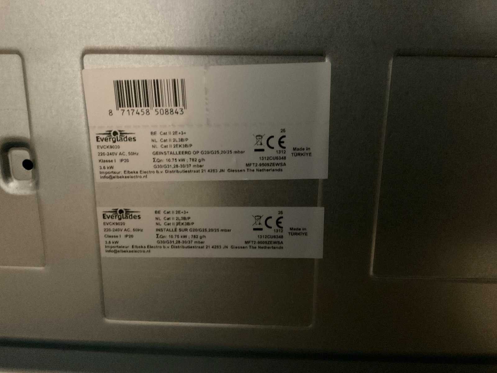 Merk: Everglades Model: EVCK9020 Kookzones: 5 Oven Inhoud: 98l Oven: true Vermogen: 3400W Spanning: 240V Energielabel: A Kleur: Zwart Gewicht: 64kg Lengte: 570mm Breedte: 900mm Hoogte: 890mm