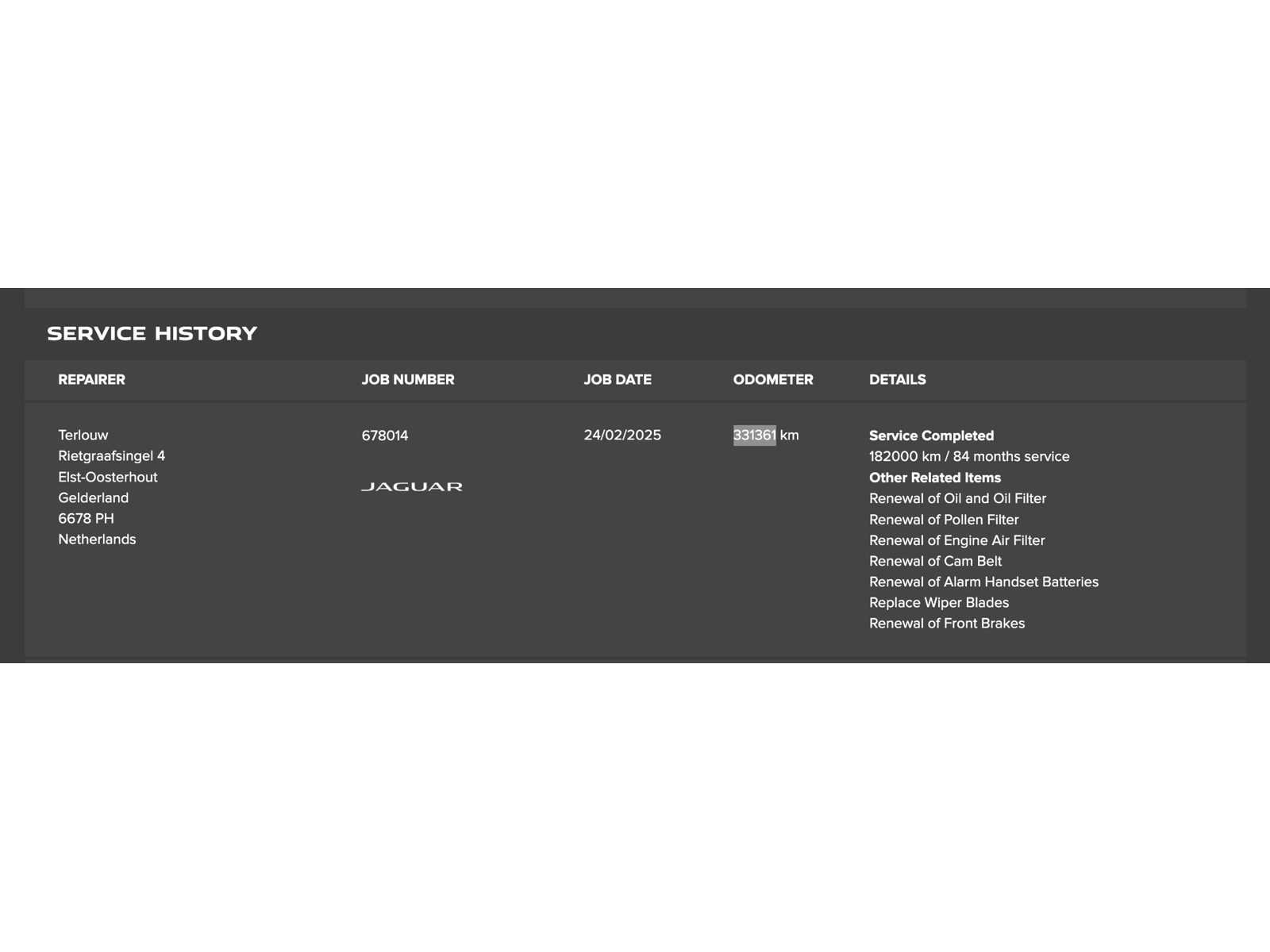 Merk: Jaguar Model: XJ Type: 3.0 V6D Portfolio Afgelezen kilometerstand: 340089km Cilinderinhoud: 2993cc Vermogen (kW): 202kW Brandstof: Diesel Chassisnummer: SAJAA1826CNV35825 Laadvermogen: 0kg NAP status: Logisch Datum eerste toelating: 2012-08-07 Datum eerste toelating (NL): 2012-08-07 APK vervaldatum: 2026-02-25 Vermogen (pk): 275hp Energielabel: C Aandrijving: RWD Aantal zitplaatsen: 5 Kleur: grijs (STRATUS GREY) Transmissie: Automaat Stuurwiel: Links gestuurd Emissieklasse: 5 Aantal deuren: 4 Ledig gewicht: 1743kg Aantal cilinders: 6 Carrosserie: sedan Nationaliteit documenten: Duitse kentekendocumenten CO2-uitstoot NEDC: 184 Onderhoudshistorie: ja gedeeltelijk Carfax Link: https://was.carfax.eu/v0/api/ccdid/5100016408/svc/201/vinreg/70XSG8/checksum/eyJhbGciOiJIUzI1NiIsInR5cCI6IkpXVCJ9.eyJleHAiOjE3NjI1ODY2Mjd9.hZBBSmmeWSHLPxtXGiJP1SHgkQ1zmUTBrGmXHbZHCso
