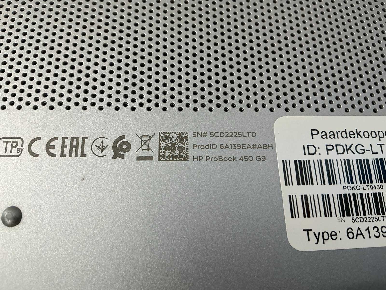 Merk: HP Type: HP ProBook 450 15.6 inch G9 Notebook PC Serienummer: 5CD2225LTD Processor type: 12th Gen Intel(R) Core(TM) i5-1235U,x86_64 @ 4.4GHz, logical CPUs: 20, Speed: 4400MHz RAM Geheugen Type: 16GB Type datadrager: SSD/NVME 256.1GB