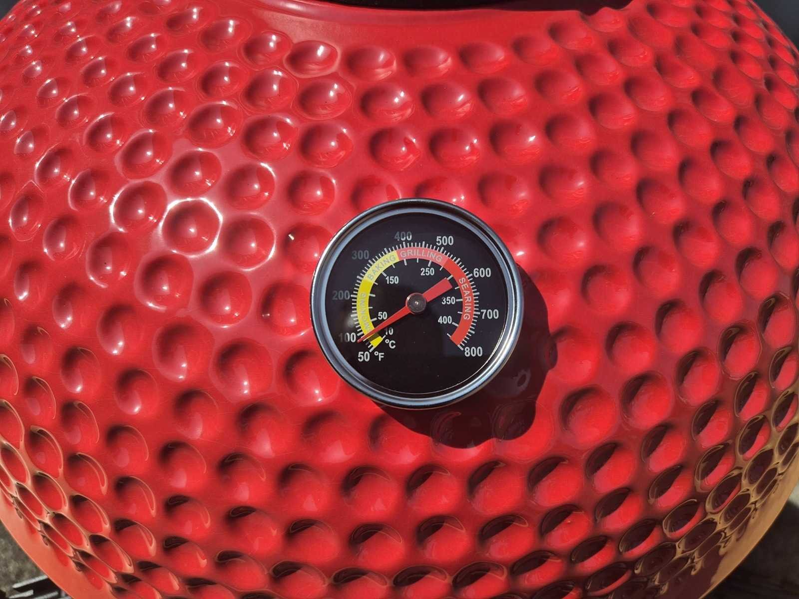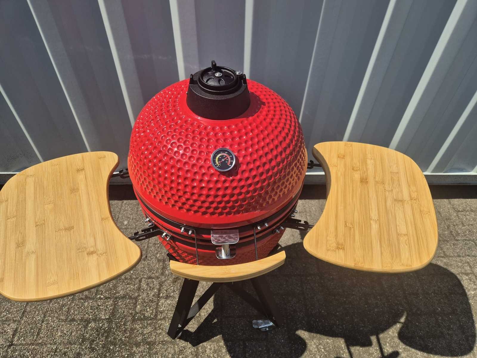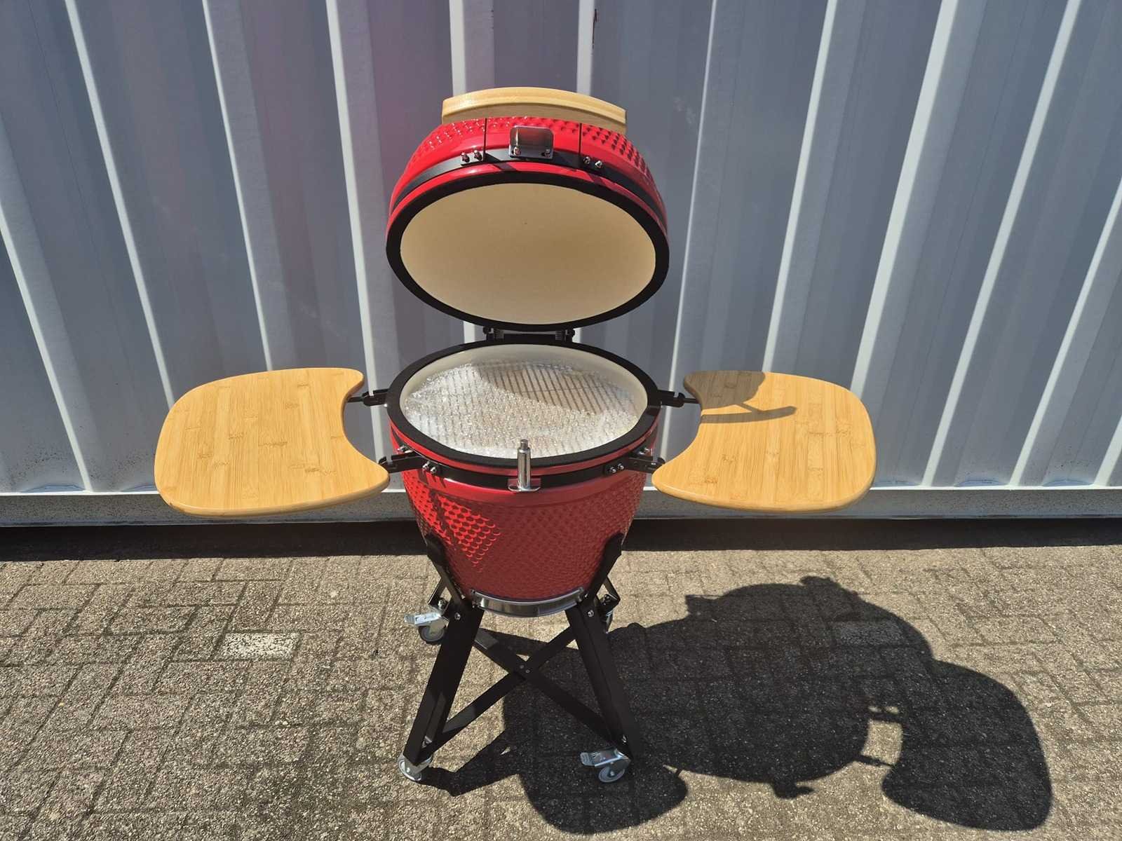 21 inch rode kamado bbq, voorzien van deflector voor indirect grillen, ongebruikt in doos. Model: 2025 Kleur: rood Gewicht: 120kg