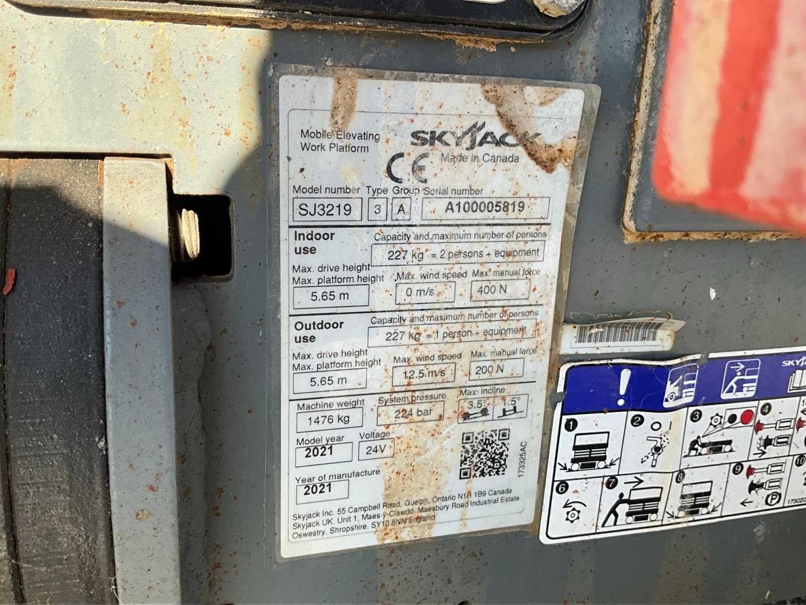 Platformhoogte 5650 mm; v.v. non-marking banden Merk: Skyjack Type: SJ 3219 Bouwjaar: 2021 Serienummer: A100005819 Elektrisch: true Schaarhoogwerker: true Werkhoogte: 7800mm Plateau afm. l: 1590mm Plateau afm. b: 710mm Platform capaciteit: 227kg Afgelezen urenstand: 97 Eigen gewicht: 1476kg Totale afmeting L: 1590mm Totale afmeting Breedte: 710mm