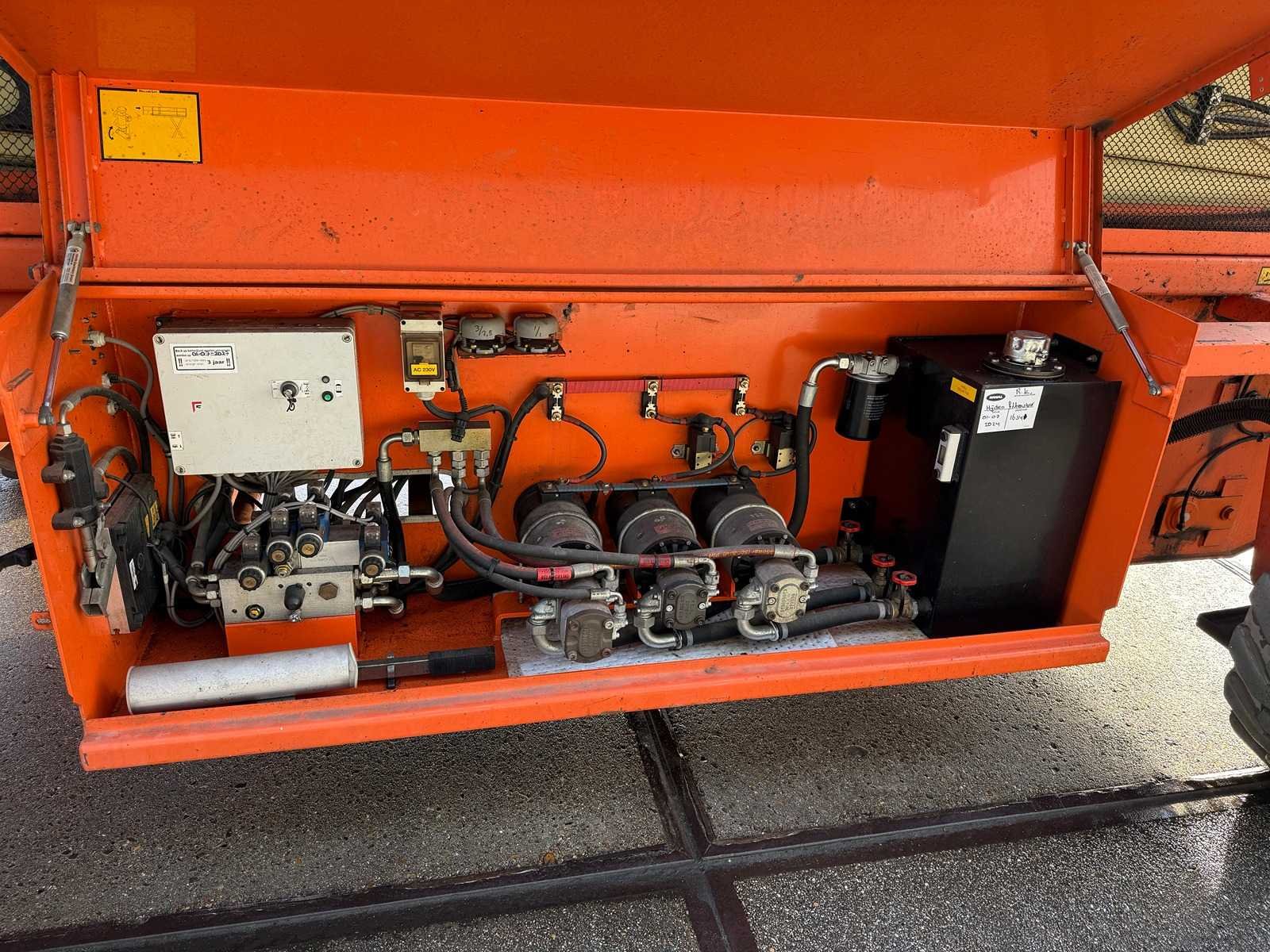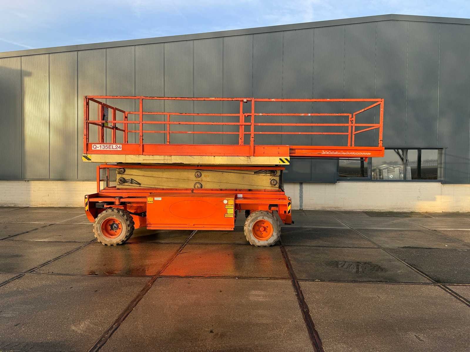Platformhoogte 13.500 mm; v.v. non-marking banden en uitschuifbaar platform Merk: Holland Lift Type: Q 135 EL 24 Bouwjaar: 2010 Serienummer: Q135 04 6921 Elektrisch: true Motorvermogen (kW): 11.1kW Schaarhoogwerker: true Werkhoogte: 15500mm Plateau afm. l: 4260mm Plateau afm. b: 2300mm Platform capaciteit: 750kg Eigen gewicht: 7590kg Totale afmeting L: 4640mm Totale afmeting Breedte: 2450mm Totale afmeting Hoogte: 3000mm