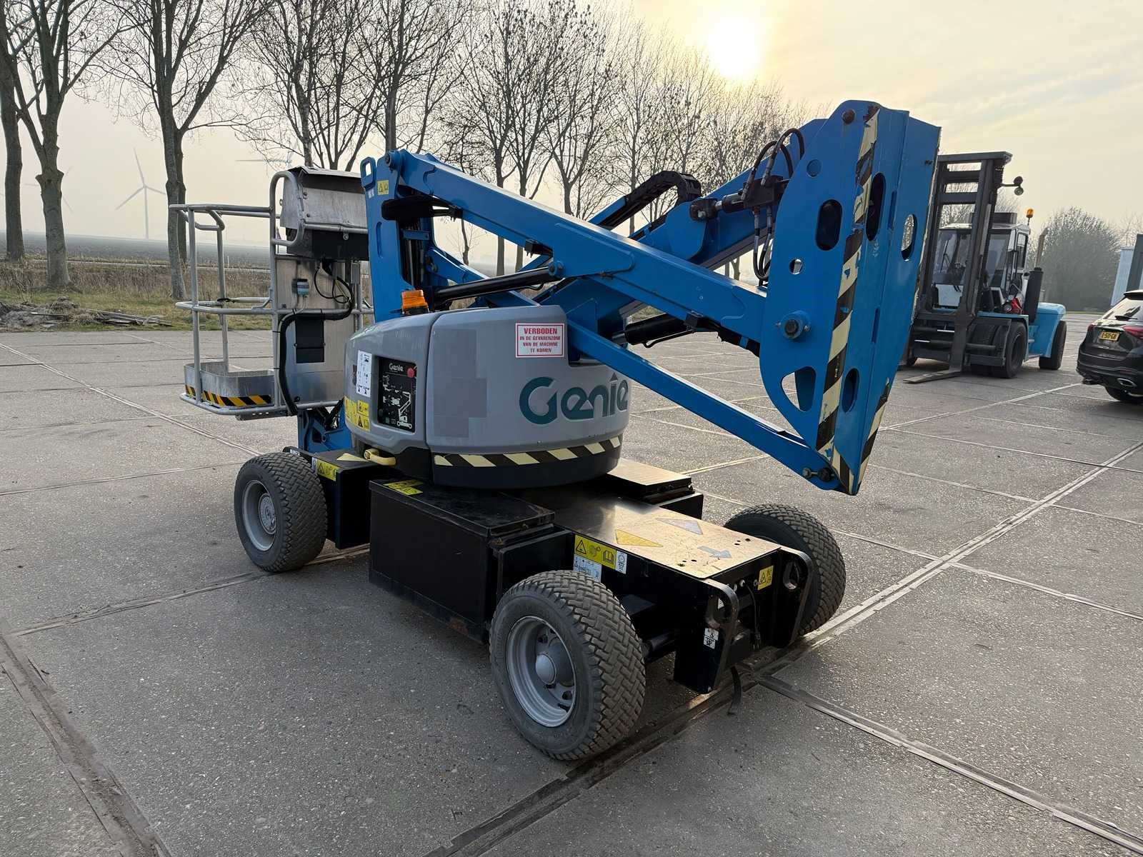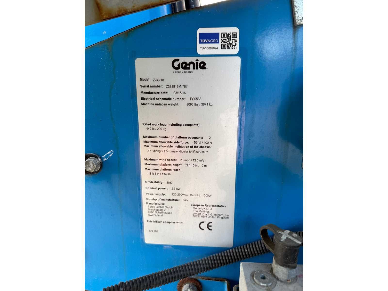Accu pakket vervangen in 2023 Merk: Genie Type: Z33/18 Bouwjaar: 2016 Serienummer: Z331816m-787 Elektrisch: true Knikarm hoogwerker: true Werkhoogte: 12000mm Horizontale rijkwijdte: 6000mm Plateau afm. l: 1150mm Plateau afm. b: 750mm Platform capaciteit: 200kg Afgelezen urenstand: 328 Eigen gewicht: 3671kg Totale afmeting L: 4170mm Totale afmeting Breedte: 1500mm Totale afmeting Hoogte: 1980mm