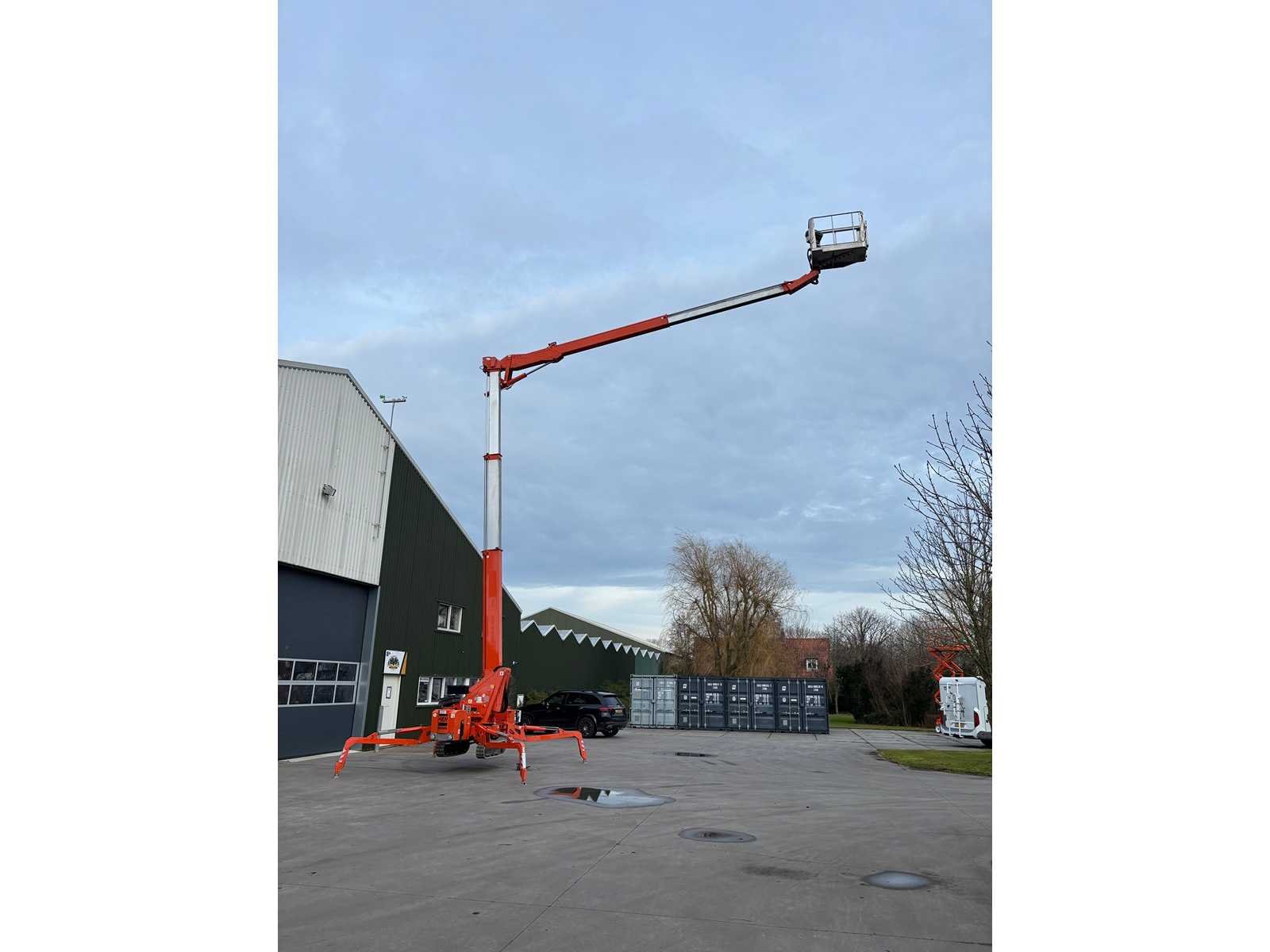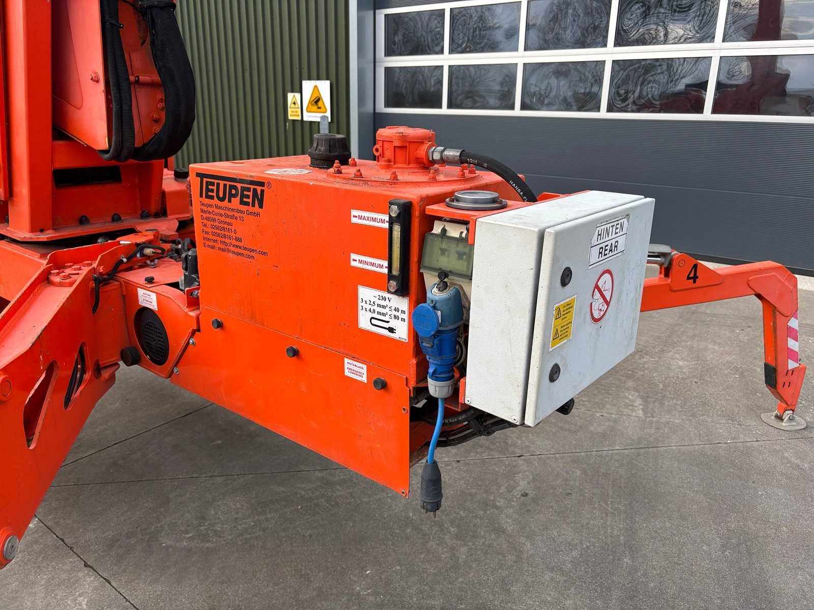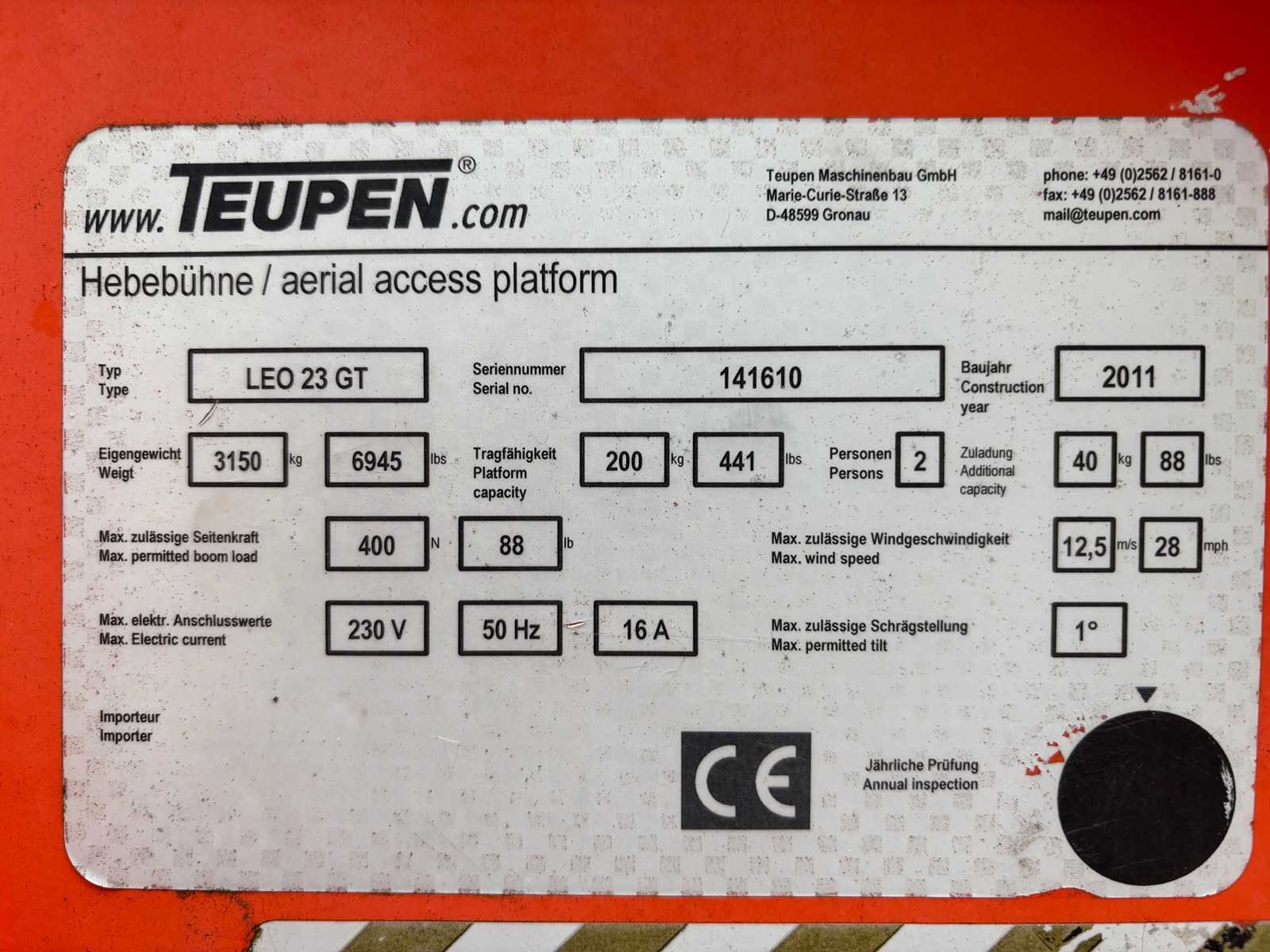 Platformhoogte 21000mm, voorzien van draaibare platformbak Merk: Teupen Type: LEO 23 GT Bouwjaar: 2011 Serienummer: 141610 Knikarm hoogwerker: true Werkhoogte: 23000mm Plateau afm. l: 1300mm Plateau afm. b: 670mm Platform capaciteit: 200kg Eigen gewicht: 3150kg Totale afmeting L: 7000mm Totale afmeting Breedte: 1200mm