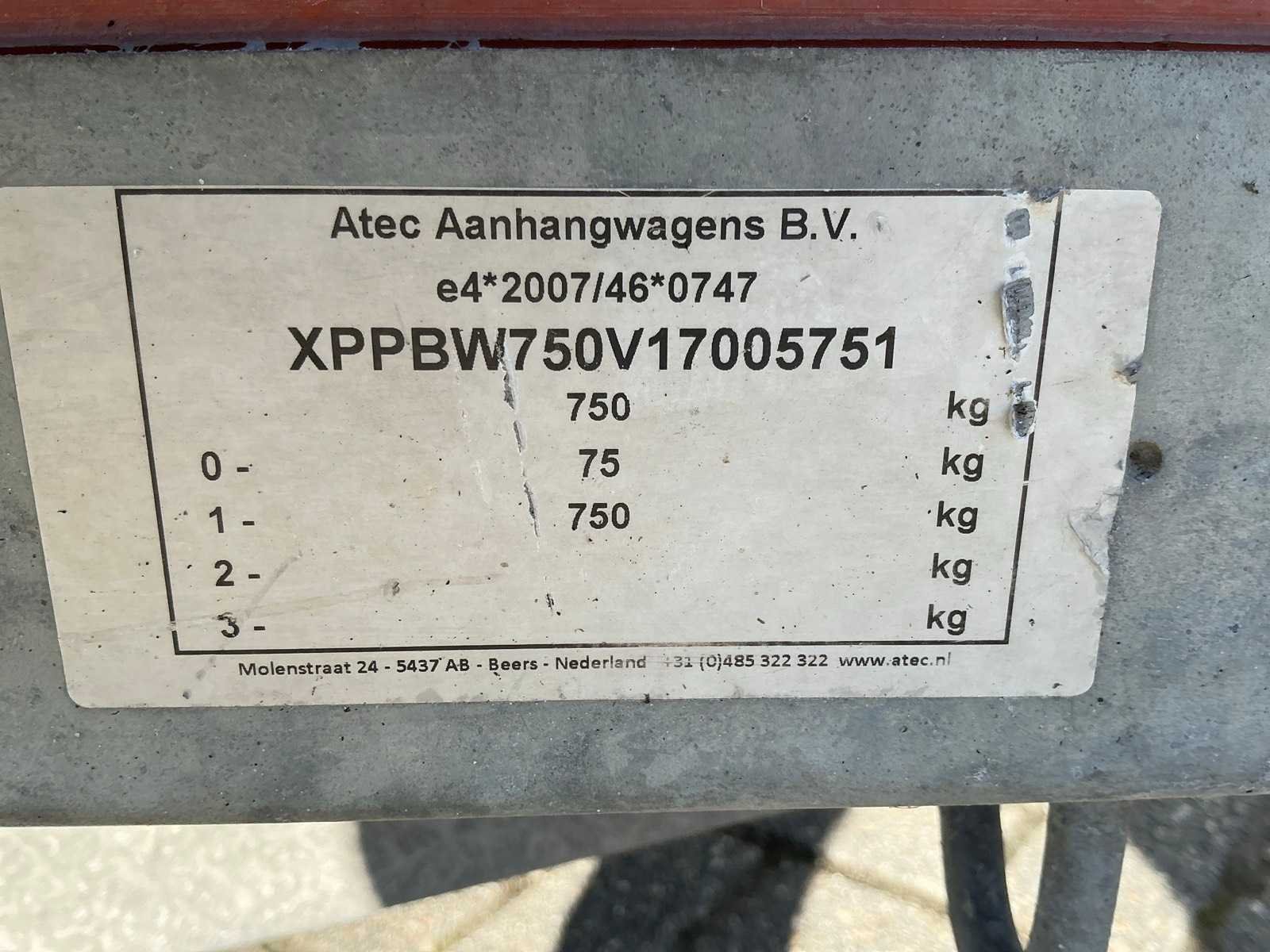Merk: Atec Type: EO1300 Chassisnummer: XPPBW750V17005751 Aantal assen: 1 Laadbak afmeting l: 250cm Laadbak afmeting b: 130cm Laadvermogen: 750kg Lengte: 390cm Breedte: 175cm