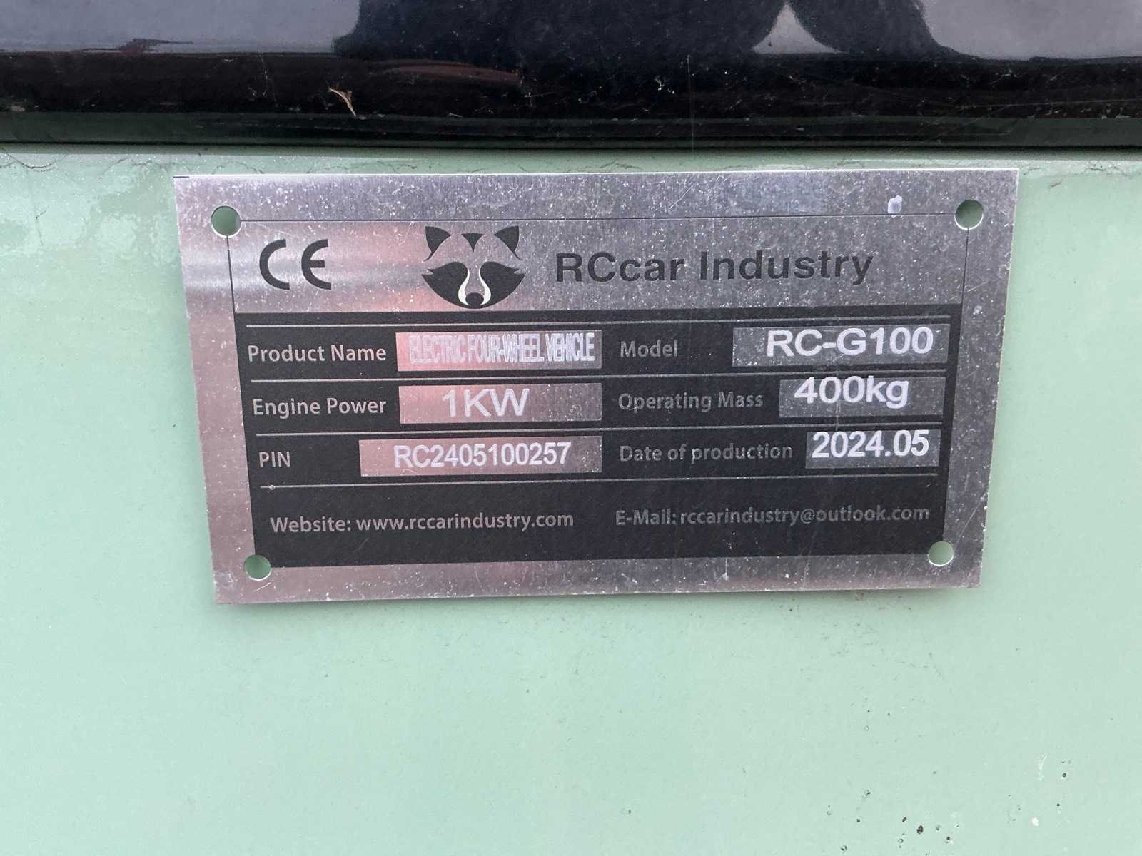 Let op; Voertuig heeft transport schade, Inclusief lader 110V, 60V accupakket, 4 zitplaatsen, digitale display, usb aansluiting, dakraam, Merk: RCcar Industry Model: RC-G100 Kleur: Wit/groen Bouwjaar: 2024 Serienummer: RC2405100257 Snelheid: 60km/h Gewicht: 400 Lengte: 2700 Breedte: 1600 Hoogte: 1600