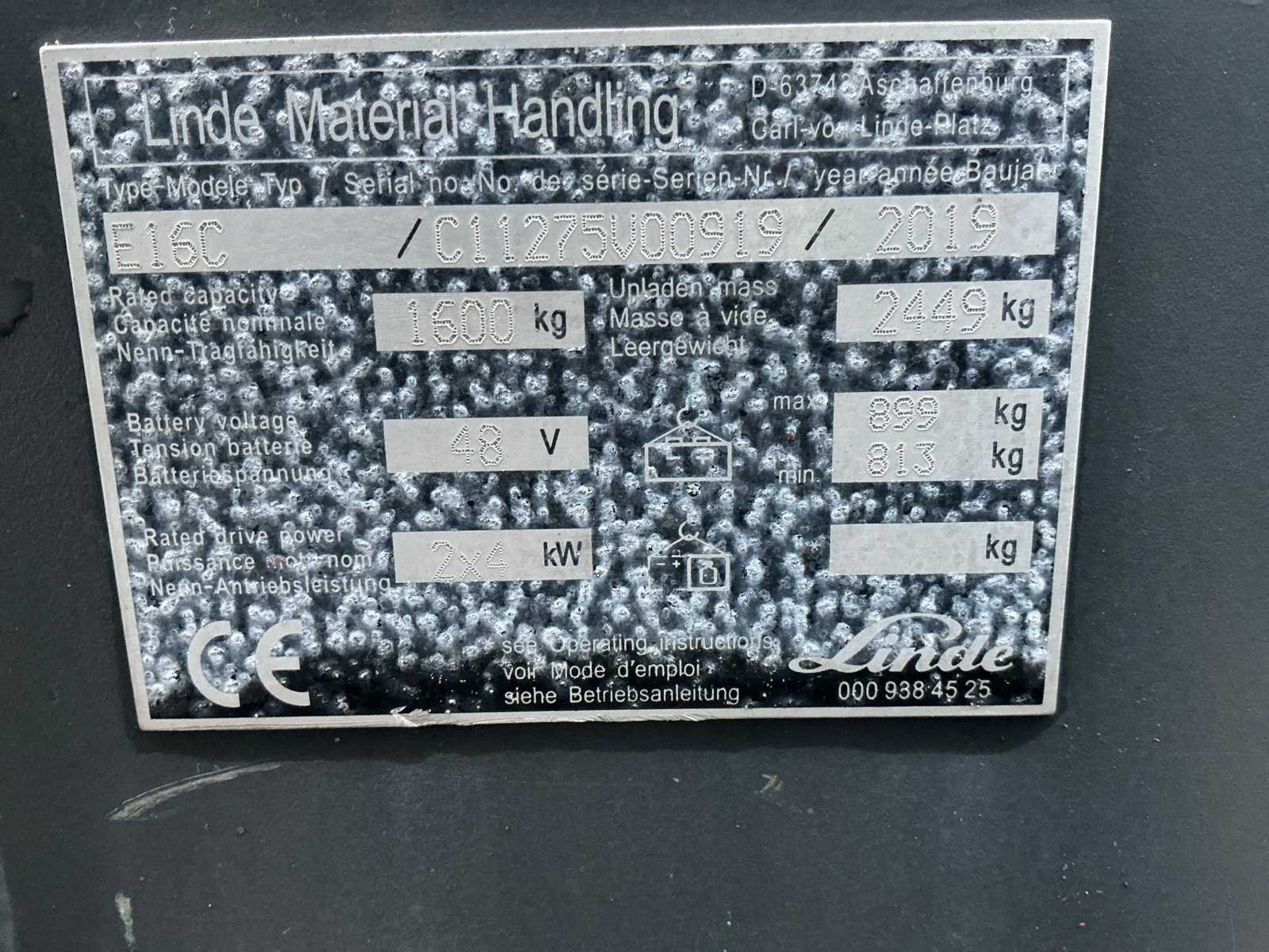 Lepels 1000mm, lepelbord 1050mm, duplex mast, side shift, led werkverlichting, trekoog met pin 25mm, 48V accupakket, max hefhoogte 3300mm, max hefvermogen 1600kg Merk: Linde Type: E16C Bouwjaar: 2019 Serienummer: C11275V00919 Brandstof: Elektrisch Mast: Duplex Soort band: Volrubber banden Aantal wielen: 3 Side-shift: true Duplex mast: true Eigen gewicht: 3350kg Hefvermogen: 1600kg Lepellengte: 1000mm Max. hefhoogte: 3300mm Vol rubber banden: true Minimale doorrijhoogte: 2300mm Totale afmeting L: 2900mm Totale afmeting Breedte: 1050mm Totale afmeting Hoogte: 2200mm
