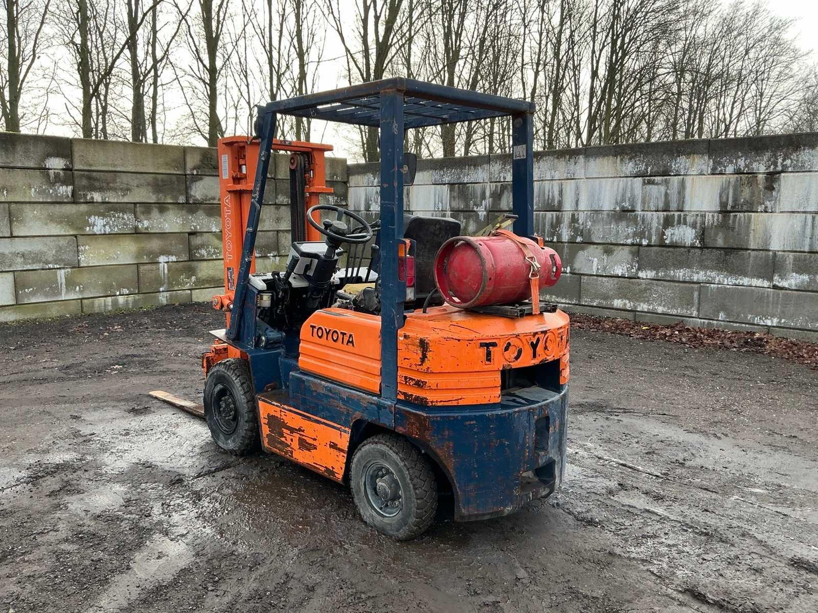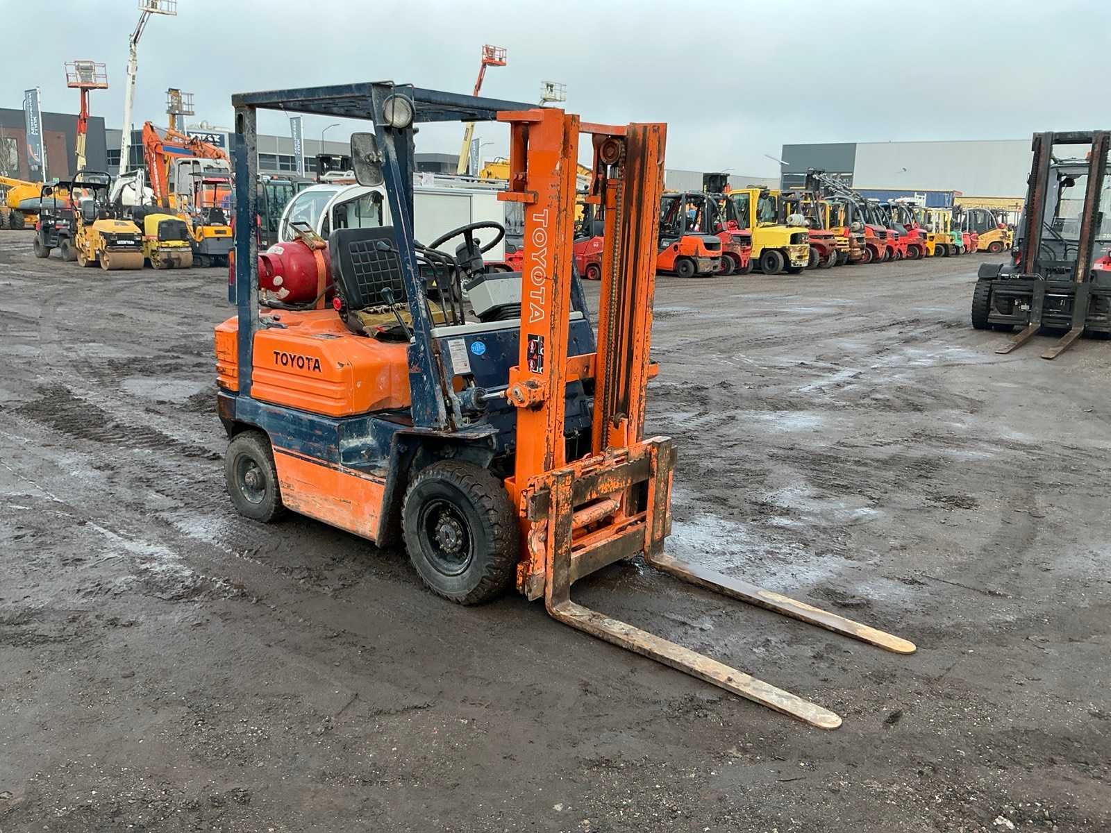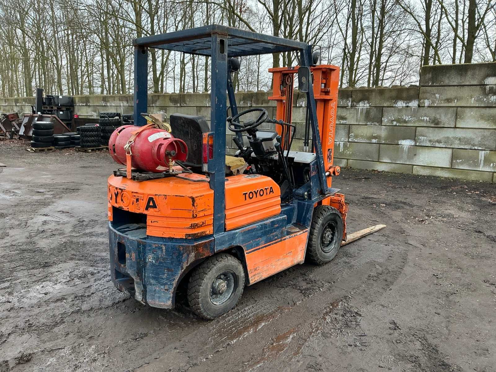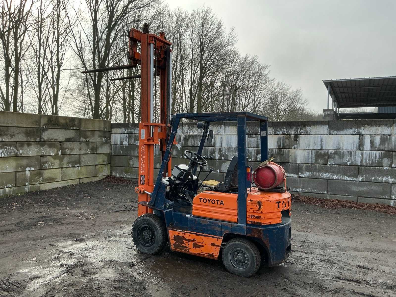Lepels 1000mm, lepelbord 950mm, duplex mast, side shift, werkverlichting, trekoog, max hefhoogte 2650mm, max hefvermogen 1750kg Merk: Toyota Type: 5 FG18 Bouwjaar: 1987 Serienummer: 11555 K Brandstof: LPG Mast: Duplex Soort band: Luchtbanden Aantal wielen: 4 Afgelezen urenstand: 3004 Side-shift: true Duplex mast: true Eigen gewicht: 2860kg Hefvermogen: 1750kg Lepellengte: 1000mm Max. hefhoogte: 2650mm Luchtbanden: true Minimale doorrijhoogte: 2000mm Totale afmeting L: 3100mm Totale afmeting Breedte: 1050mm Totale afmeting Hoogte: 1900mm LPG: true