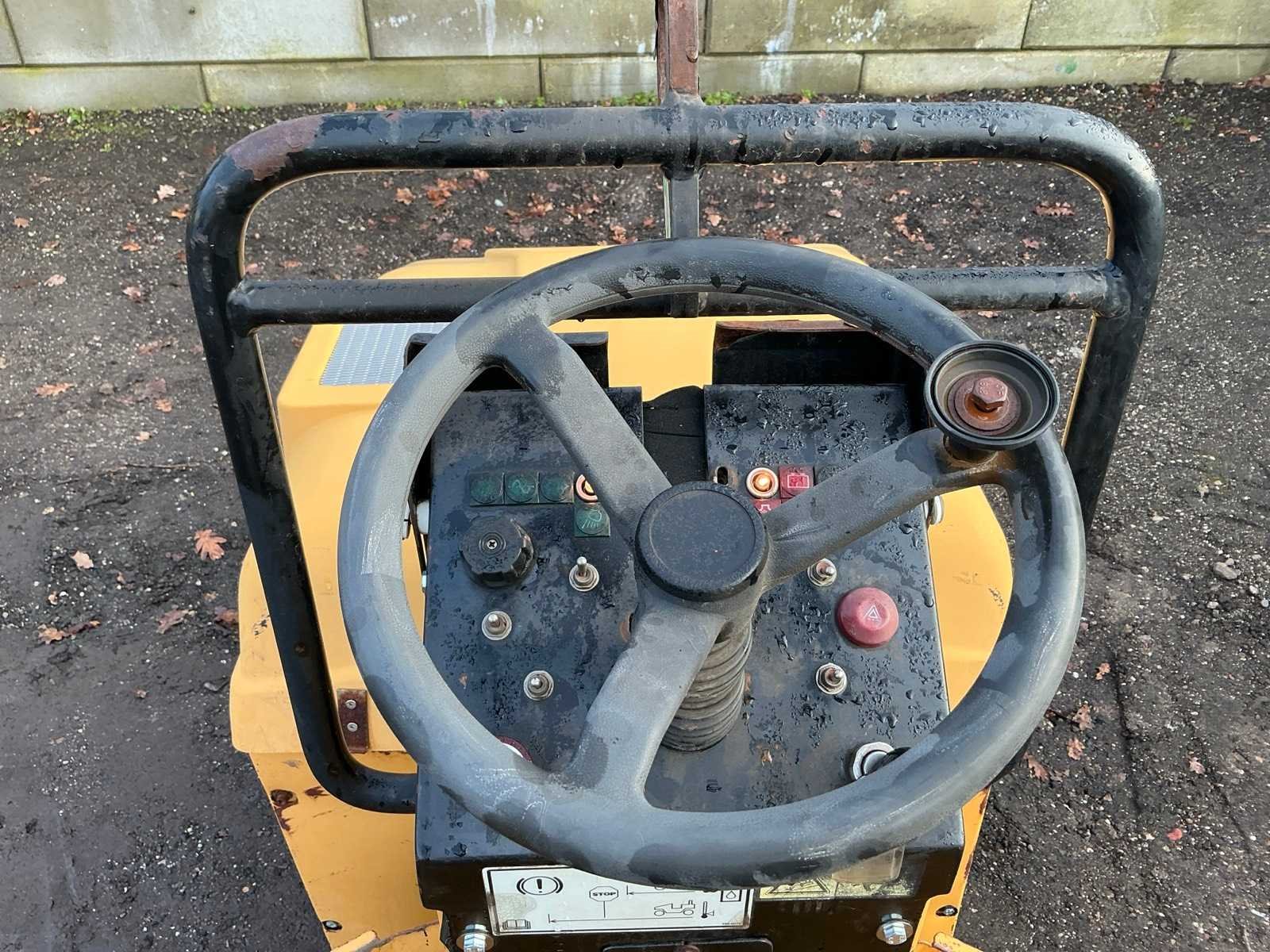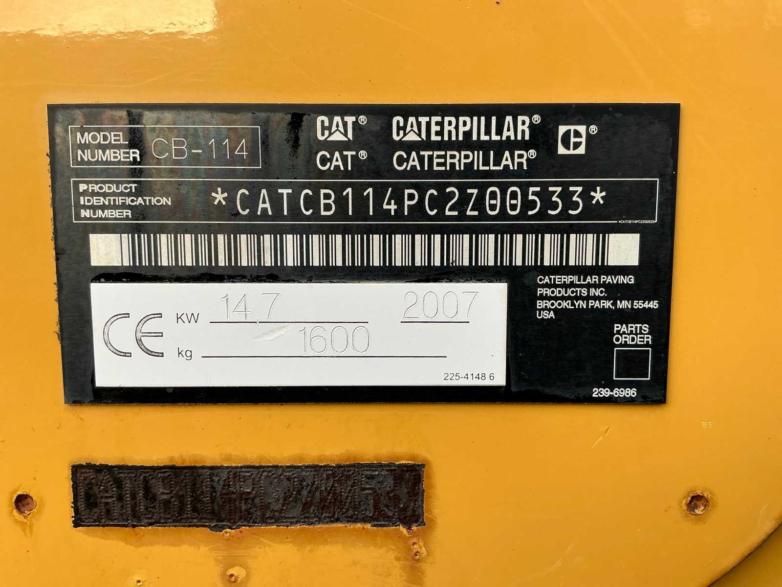 Werkbreedte 800mm, watertank, werkverlichting, kniksturing, neerklapbare beugel Merk: Caterpillar Model: CB114 Bouwjaar: 2007 Serienummer: CATCB114PC2Z00533 Merk motor: Hatz Motorvermogen (kW): 14.7kW Aantal cilinders: 2 Brandstof: Diesel Bedrijfsgewicht: 1600kg Trommeldiameter: 570mm Trommelbreedte: 800 Werkbreedte: 800 Afgelezen urenstand: 424 Eigen gewicht: 1600kg Totale afmeting L: 2200mm Totale afmeting Breedte: 880mm Totale afmeting Hoogte: 2400mm