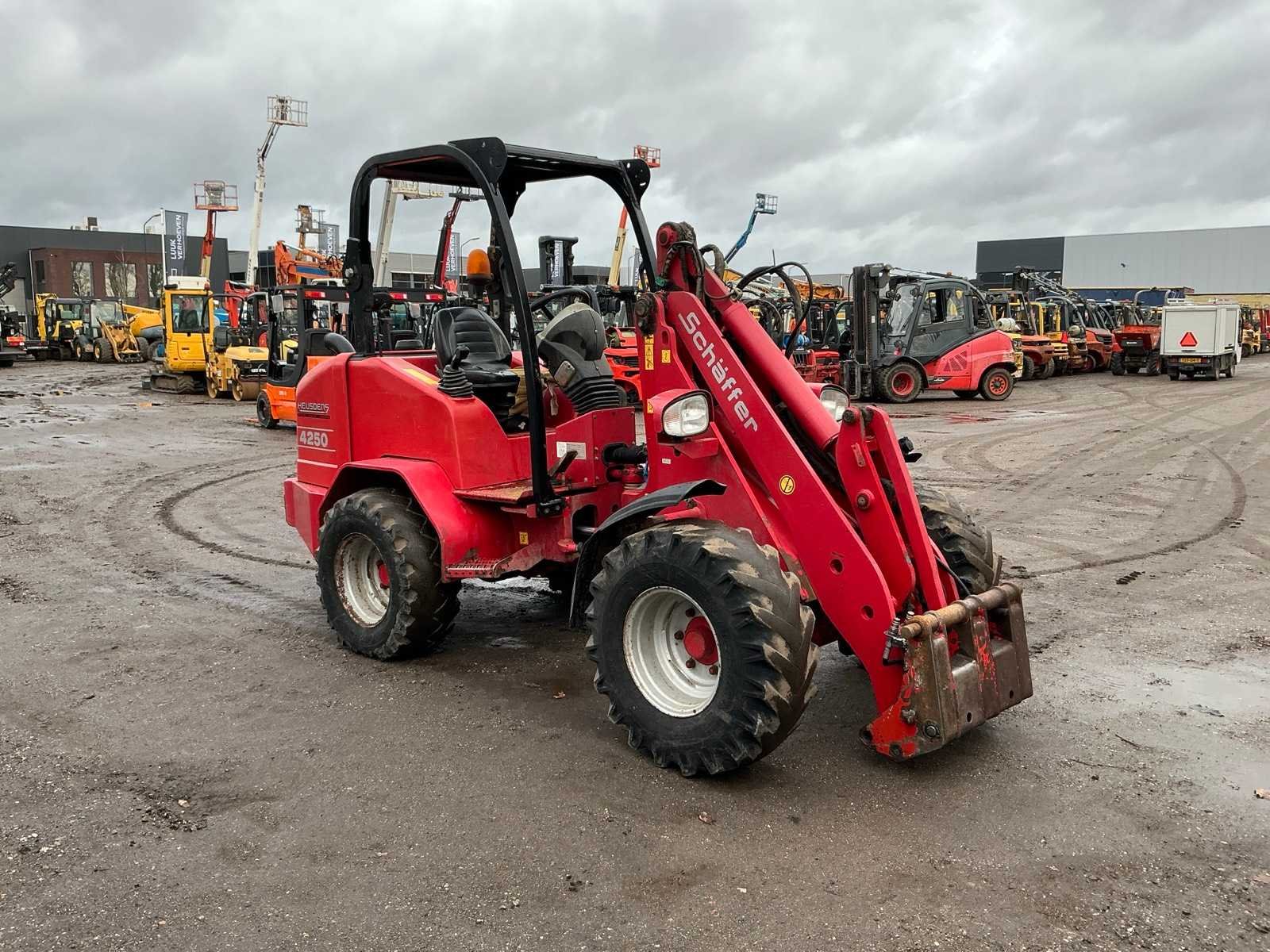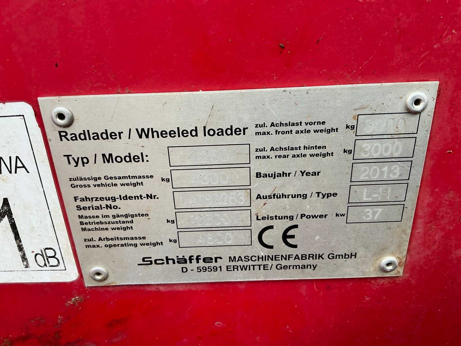 Let op; accu slecht, dient opgestart te worden, 4WD, Hydraulische wissel, 3e functie, 3 polige stekker, werkverlichting, trekoog Merk: Schaffer Type: 4250 Bouwjaar: 2013 Serienummer: 14080363 Merk motor: Kubota Motorvermogen (kW): 37kW Aantal cilinders: 4 Brandstof: Diesel Bedrijfsgewicht: 4600kg Bandenmaat: 11.5/80 R15.3 Afgelezen urenstand: 8056 Eigen gewicht: 3300kg Totale afmeting L: 3800mm Totale afmeting Breedte: 1600mm Totale afmeting Hoogte: 2250mm
