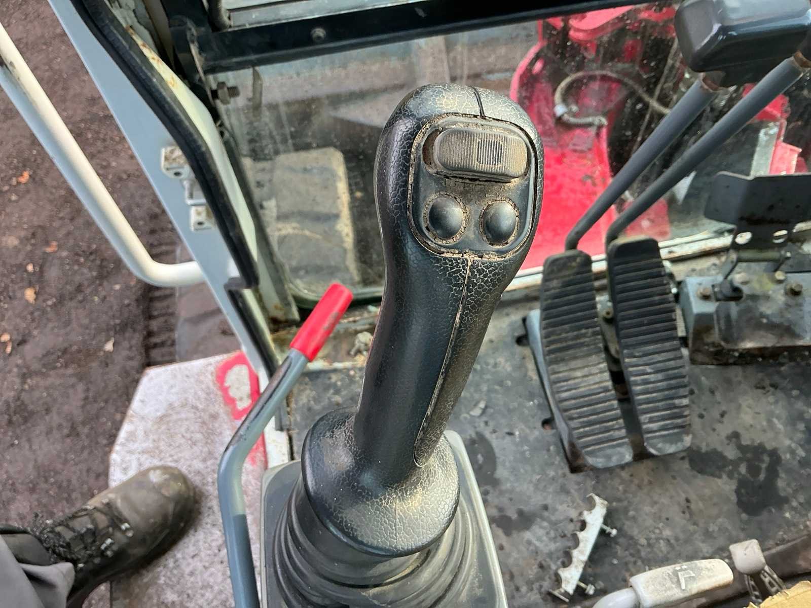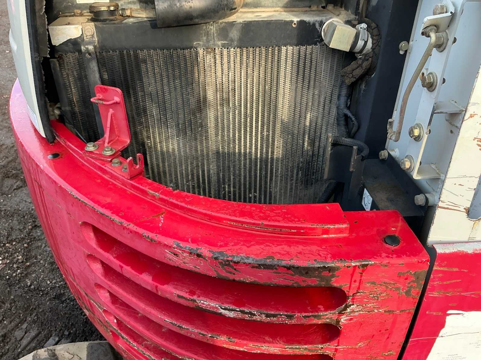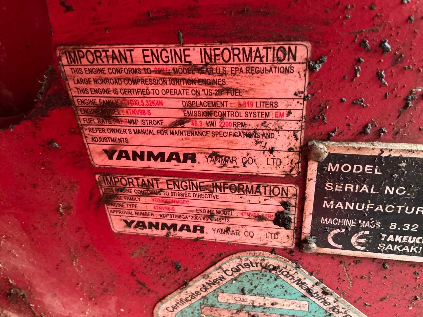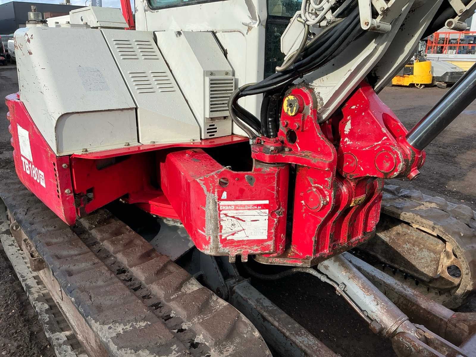 Let op; mast is een beetje krom, Dichte bak 1700mm, vaste pennen, 3e functie, verstelbare giek, blad 2300mm, verwarming, auto idle, radio, Merk: Takeuchi Type: TB 180FR Bouwjaar: 2008 Serienummer: 17830731 Merk motor: Yanmar Motorvermogen (kW): 45kW Aantal cilinders: 4 Brandstof: Diesel Bedrijfsgewicht: 8333kg Max. graafdiepte: 4200mm Graafbak afm. b: 1700mm Rups breedte: 450mm Afgelezen urenstand: 5775 Eigen gewicht: 8333kg Totale afmeting L: 6150mm Totale afmeting Breedte: 2300mm Totale afmeting Hoogte: 2800mm
