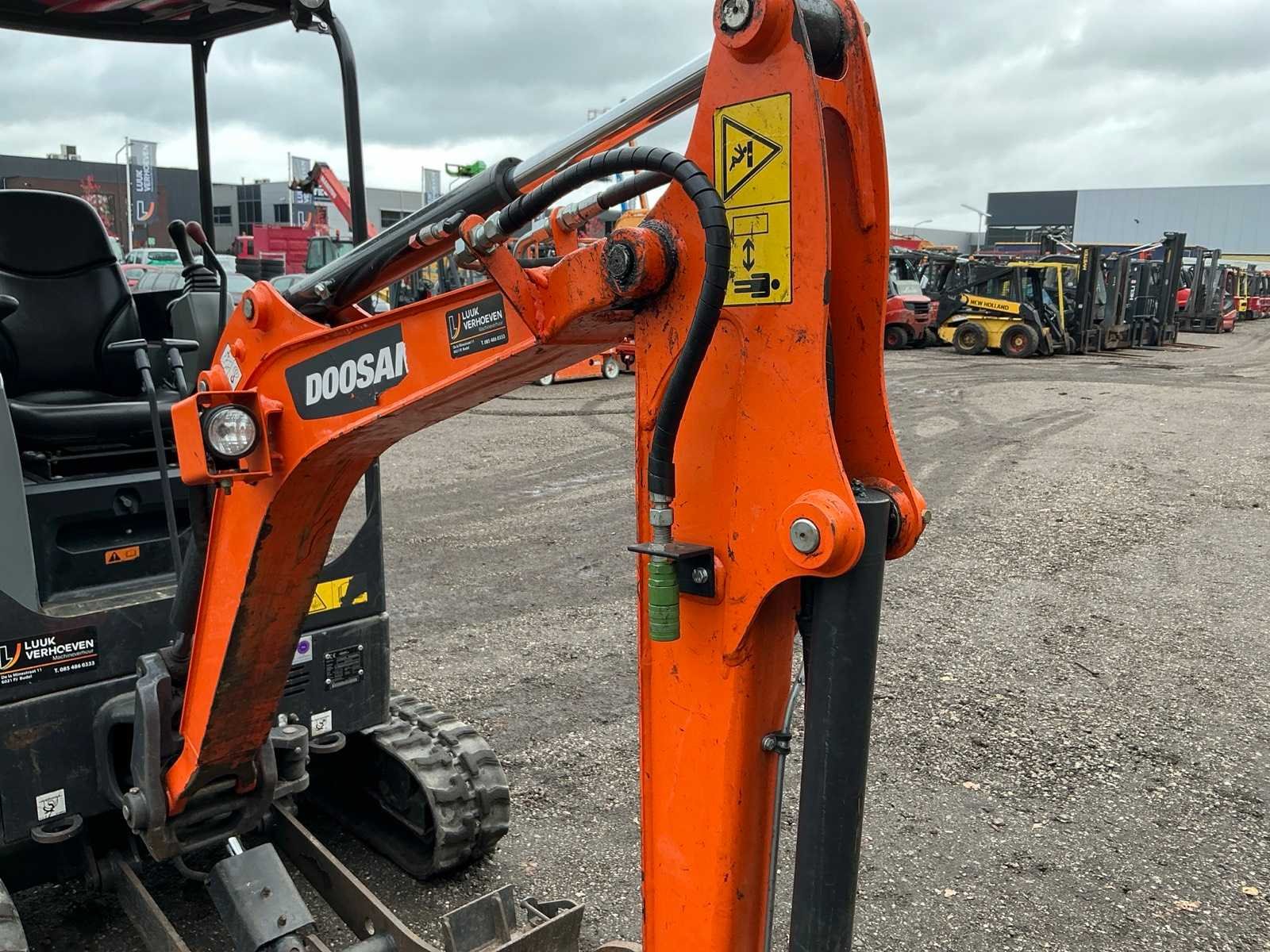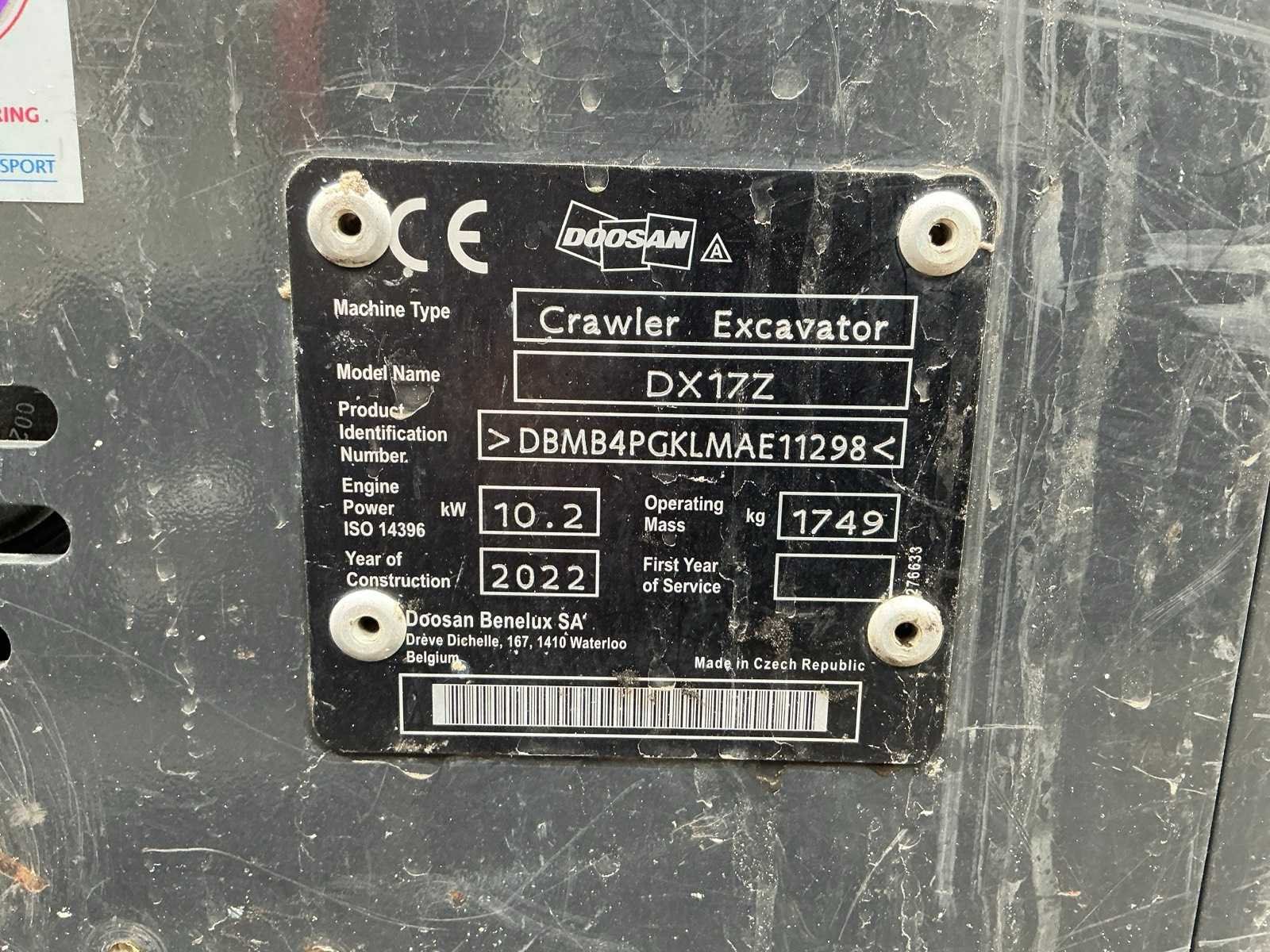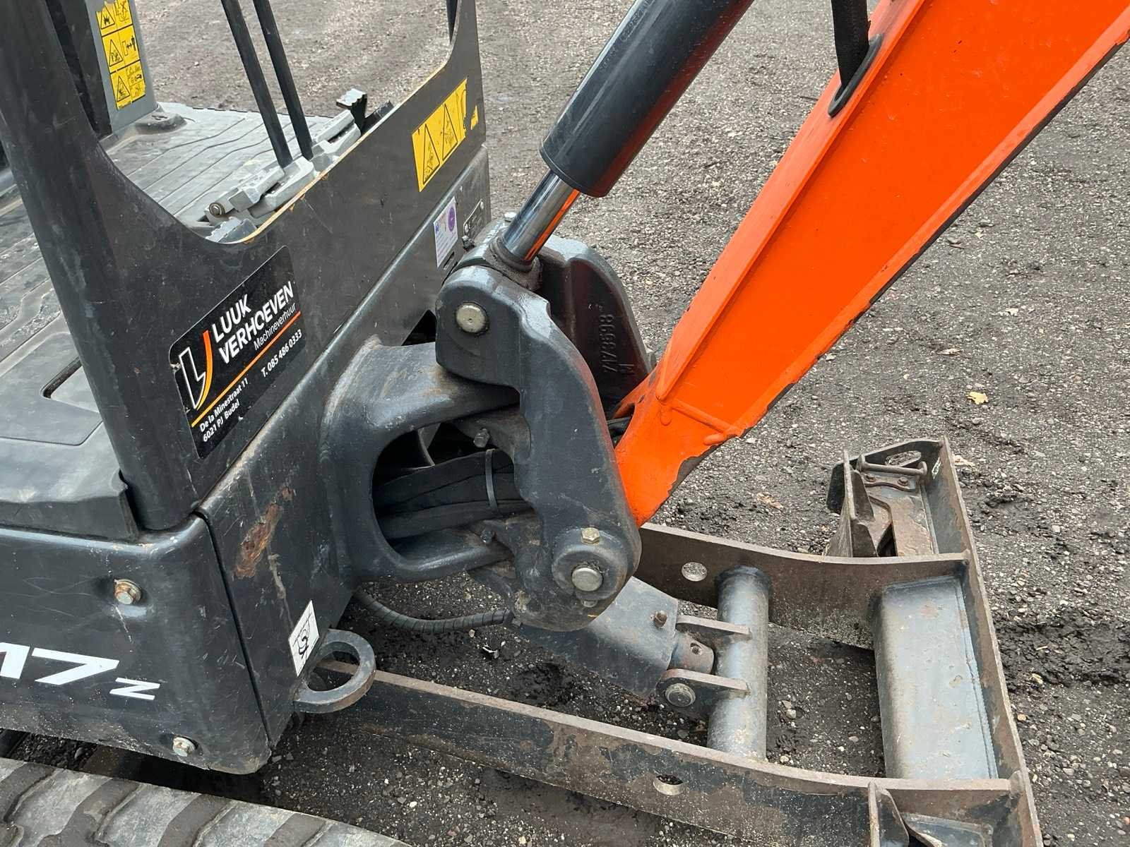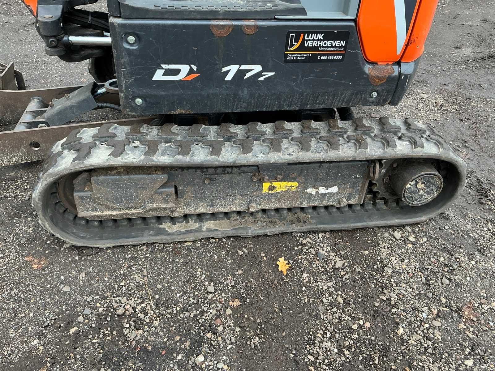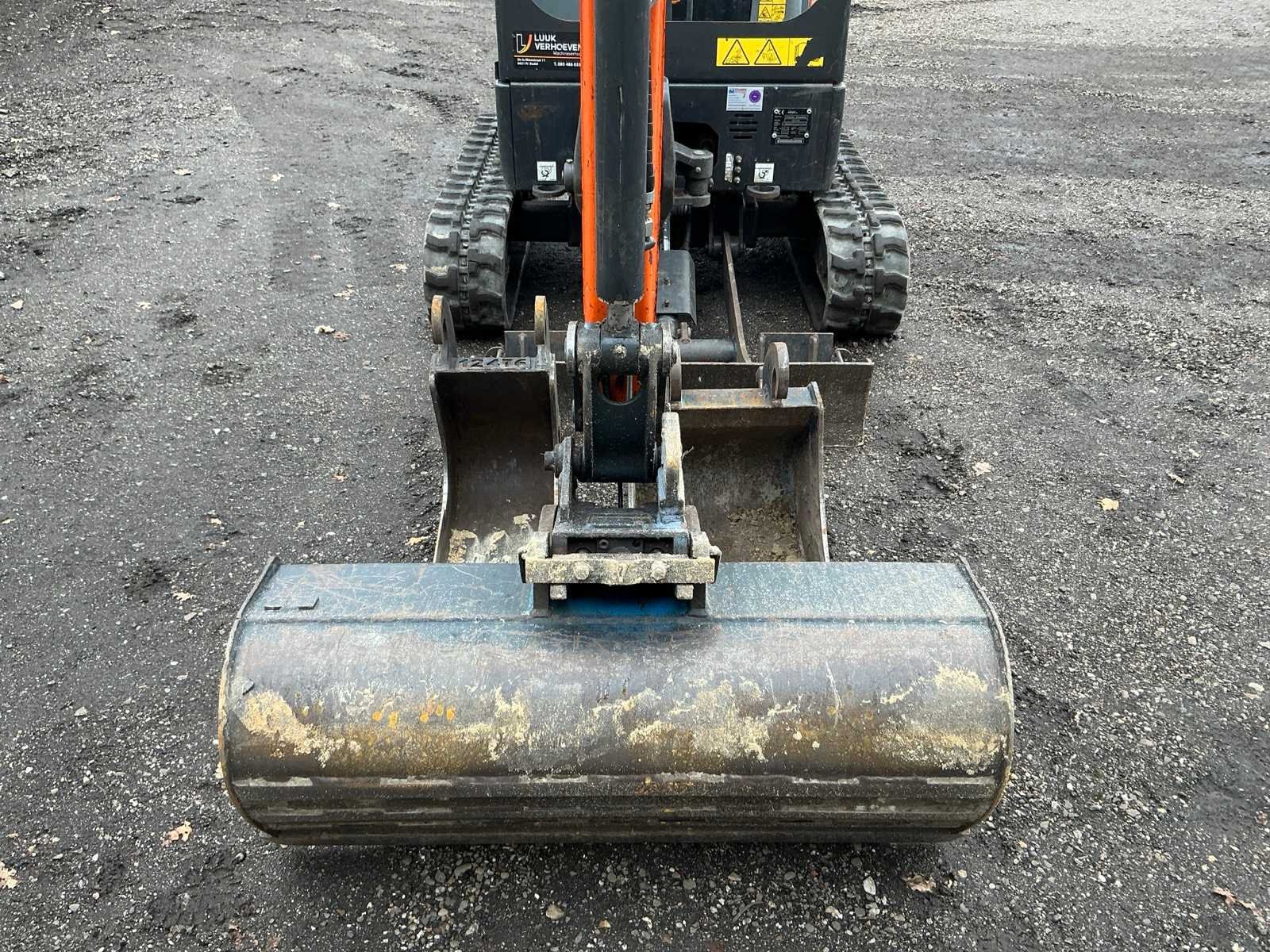 Inclusief CW05 banaanbak 250mm, dieplepel 400mm, slotenbak 1000mm, hydraulische snelwissel, 3e functie, werkverlichting, blad 980mm met 2x verbrekers 190mm, verstelbaar rijwerk 1000/1400mm Merk: Doosan Type: DX17Z Bouwjaar: 2022 Serienummer: DBMB4PGKLMAE11298 Merk motor: Kubota Motorvermogen (kW): 10kW Aantal cilinders: 3 Brandstof: Diesel Bedrijfsgewicht: 1749kg Gieklengte: 1400mm Inclusief graafbak: Yes Rups breedte: 230mm Afgelezen urenstand: 1039 Eigen gewicht: 1749kg Totale afmeting L: 3100mm Totale afmeting Breedte: 1000mm Totale afmeting Hoogte: 2250mm