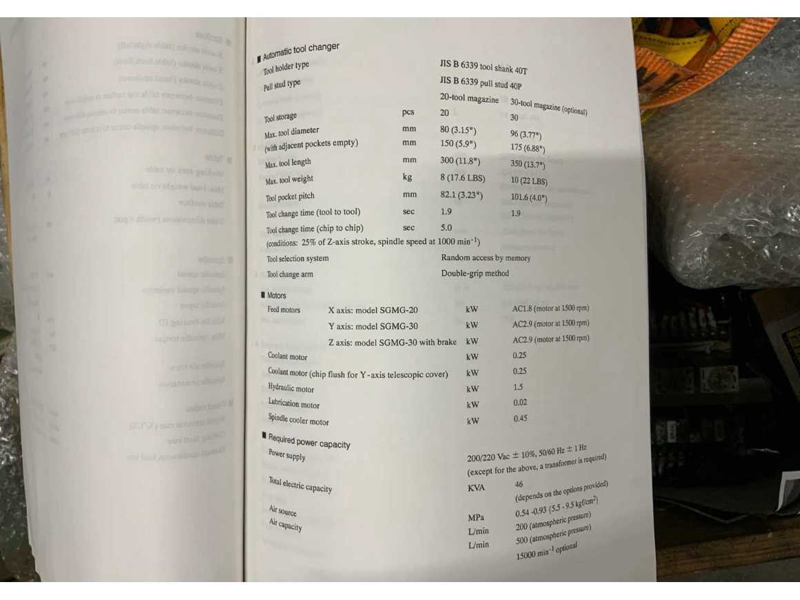 Let op!! uitlevering 15 December Merk: Masuura Type: MC-800 VG Bouwjaar: 1998 Serienummer: 980713212 Opname iso: JOS B 6339 tool scank 40T Verplaatsing x-as: 800mm Verplaatsing y-as: 510mm Verplaatsing z-as: 510mm Snelheid van n =: 30rpm Snelheid tot n =: 8000rpm Werkstuk gewicht max.: 700kg T-gleuf opspantafelafmeting B: 510mm T-gleuf opspantafelafmeting L: 1150mm Aansluiting: 400V Totale afmeting Hoogte: 2970mm Totale afmeting Breedte: 4245mm Totale afmeting L: 4410mm Machinegewicht: 6400kg