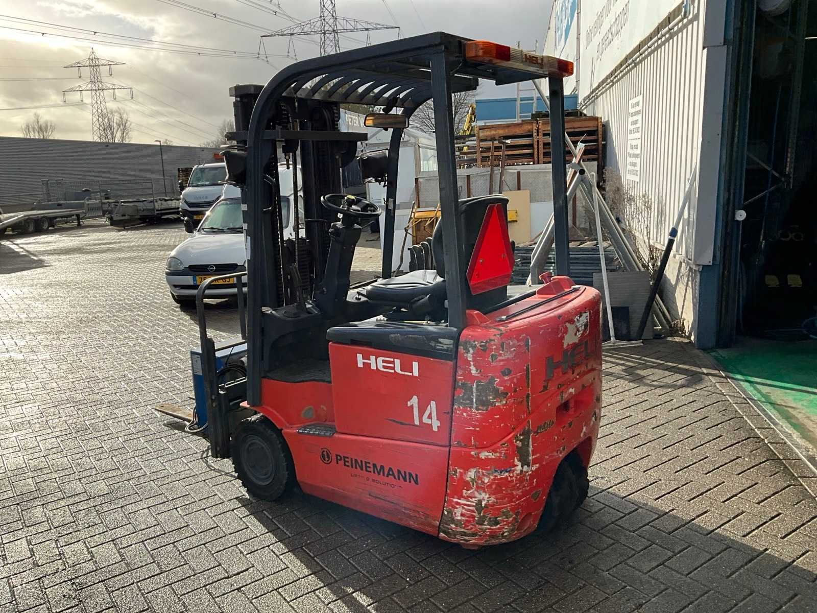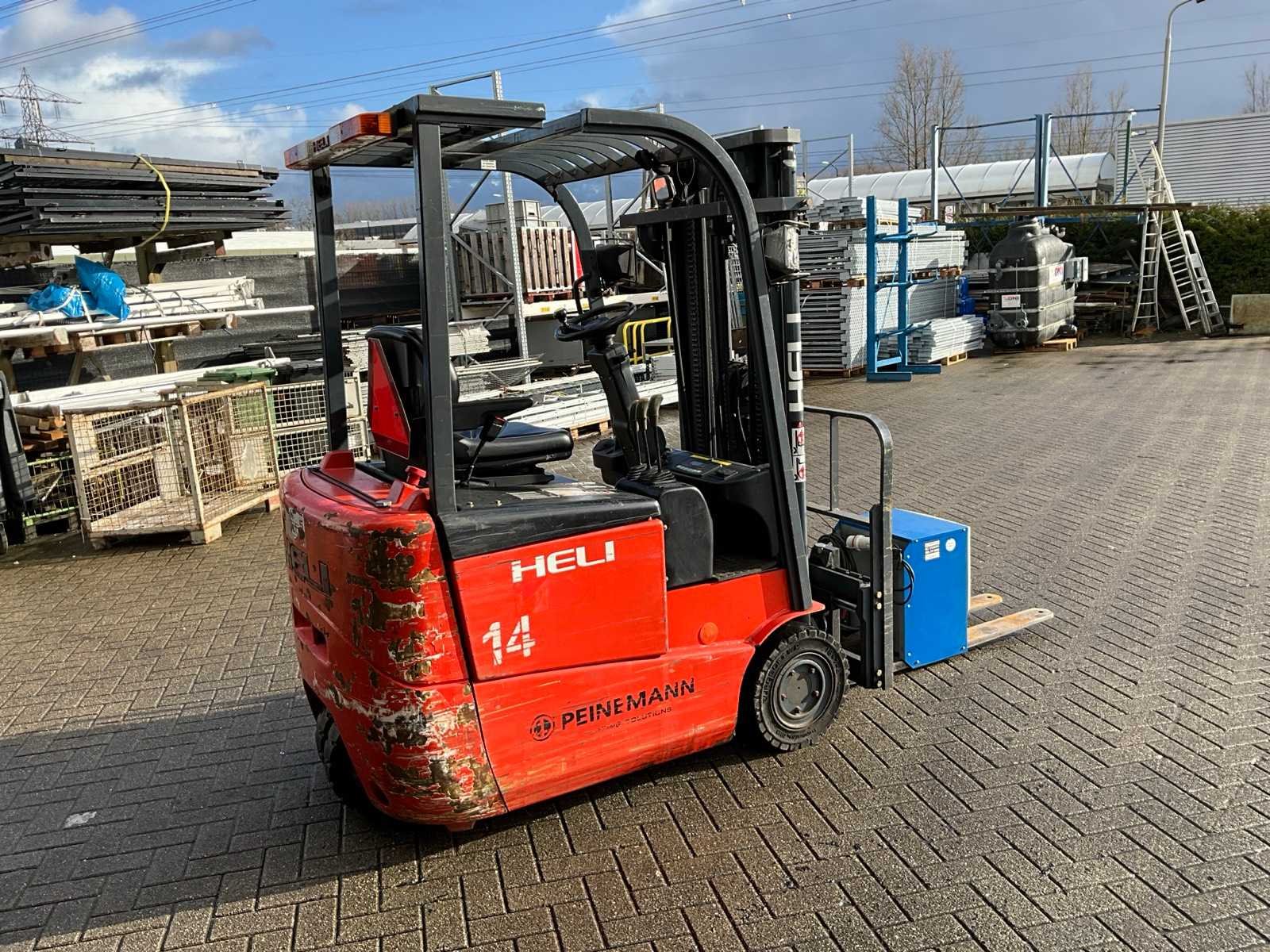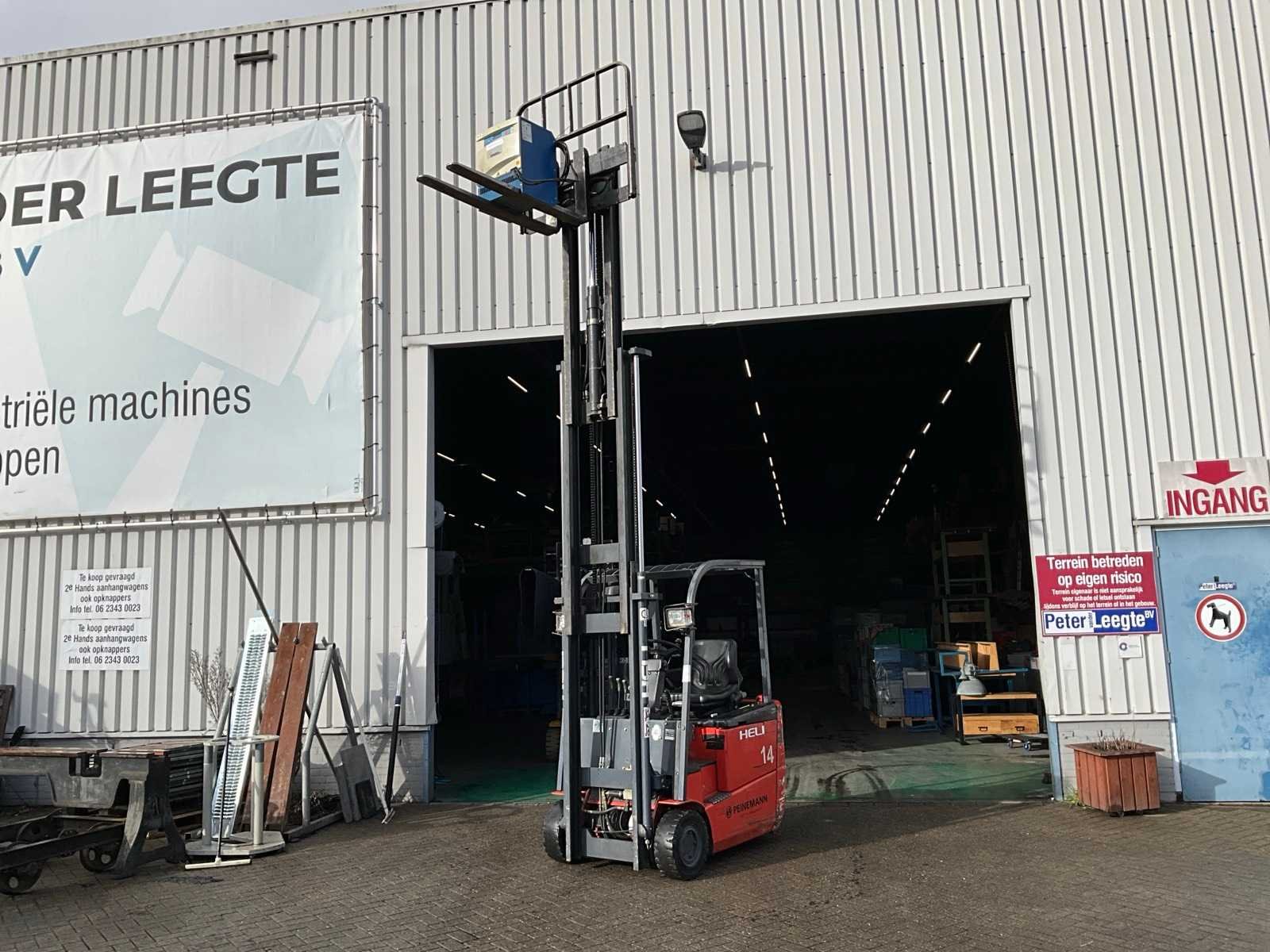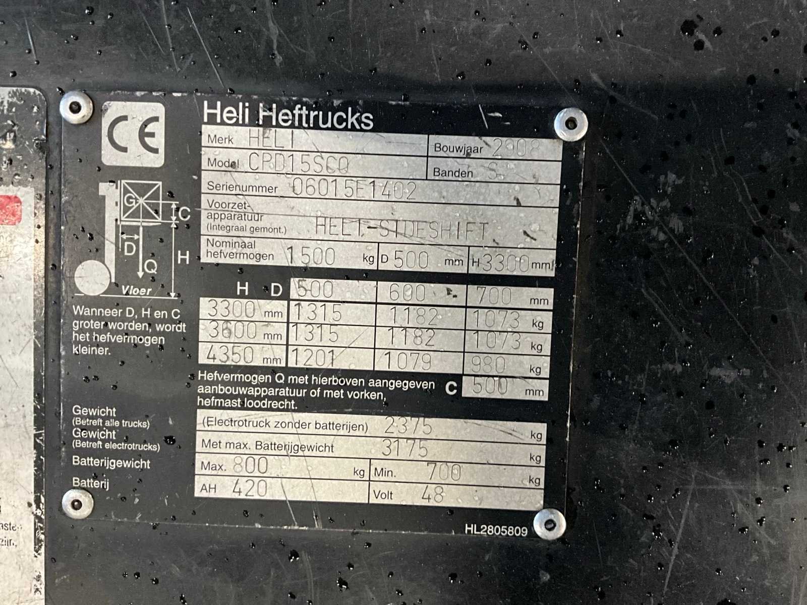 Merk: Heli Type: CPD15 Bouwjaar: 2008 Brandstof: Elektrisch Mast: Triple Soort band: Volrubber banden Aantal wielen: 3 Afgelezen urenstand: 3541 Accu lader: true Side-shift: true Hefvermogen: 1500kg Lepellengte: 1200mm Max. hefhoogte: 4350mm Vol rubber banden: true Minimale doorrijhoogte: 2050mm