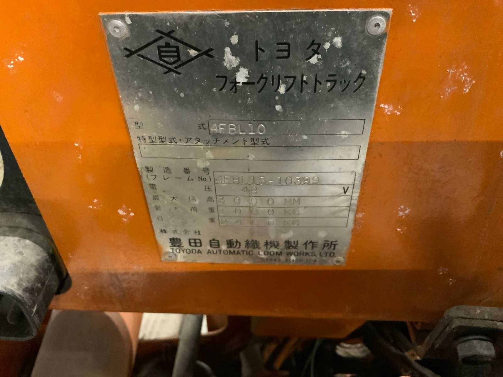Merk: Toyota Type: 4FLB10 Brandstof: Elektrisch Soort band: Volrubber banden Aantal wielen: 4 Accu lader: true Duplex mast: true Eigen gewicht: 2460kg Hefvermogen: 1000kg Lepellengte: 950mm Max. hefhoogte: 3000mm Totale afmeting L: 2900mm Totale afmeting Breedte: 1060mm Totale afmeting Hoogte: 2150mm