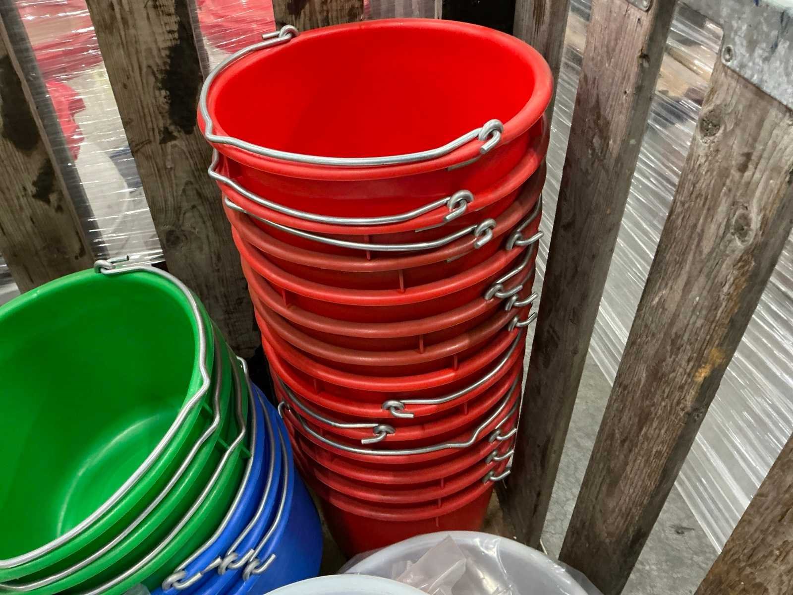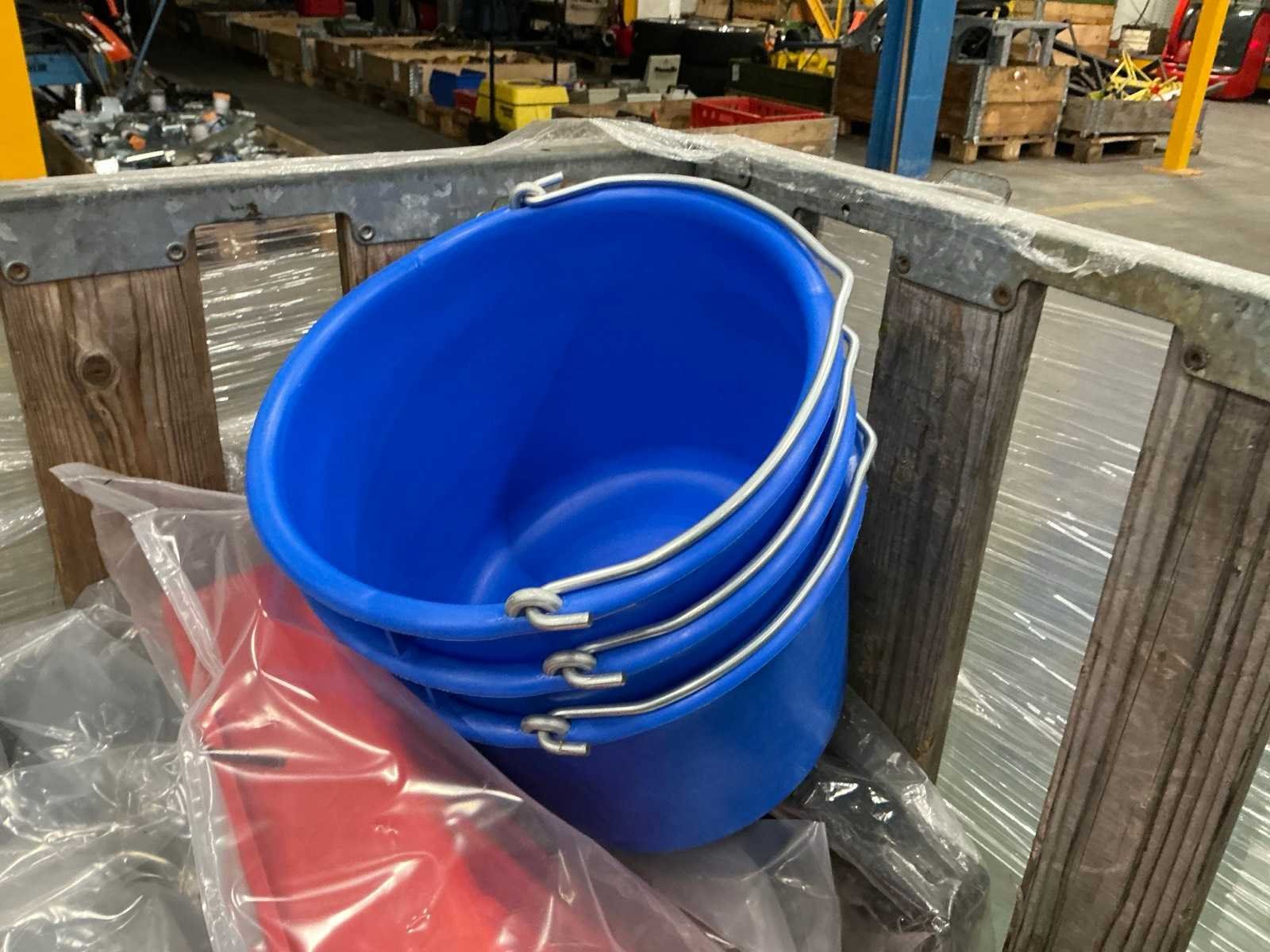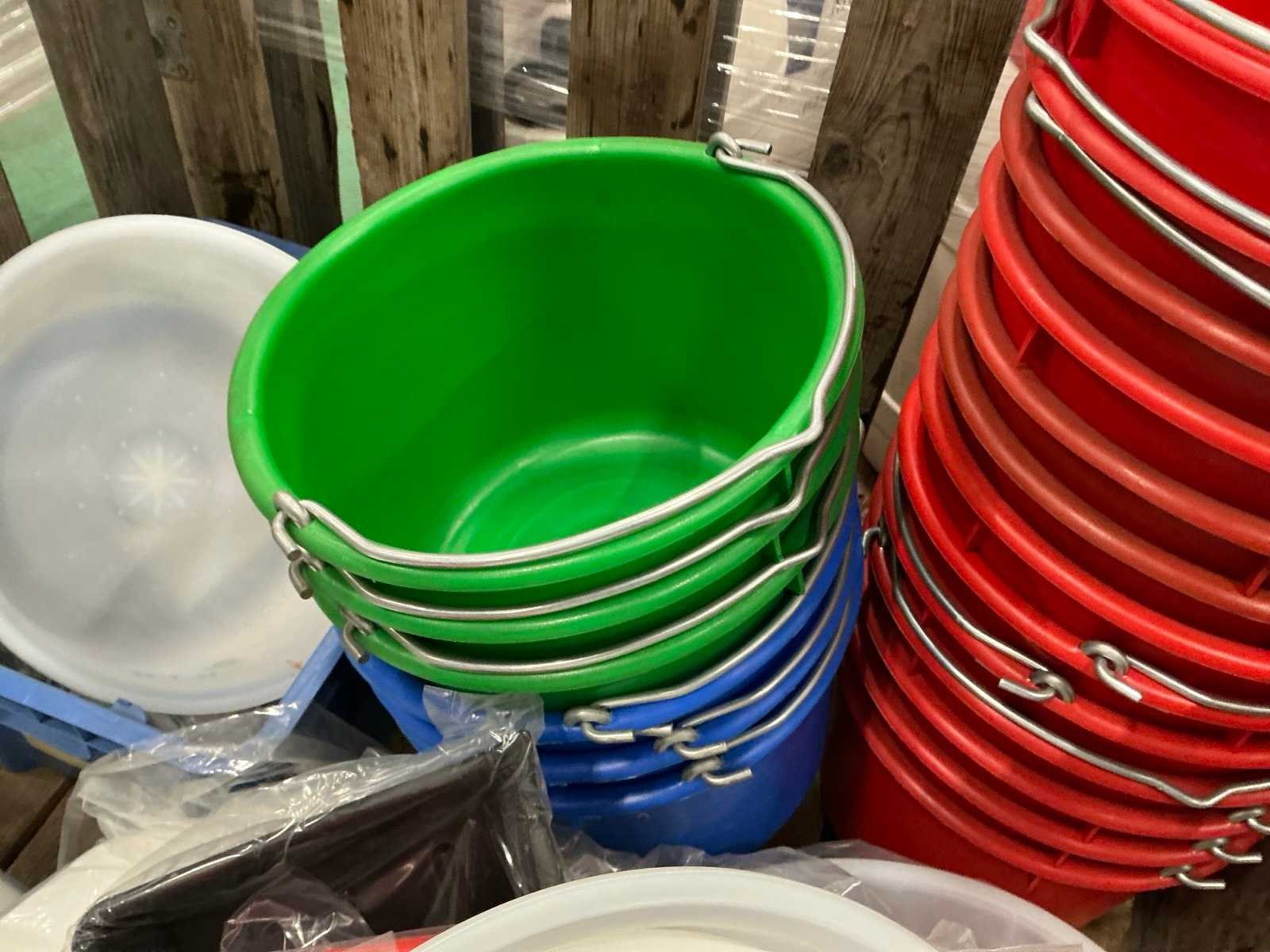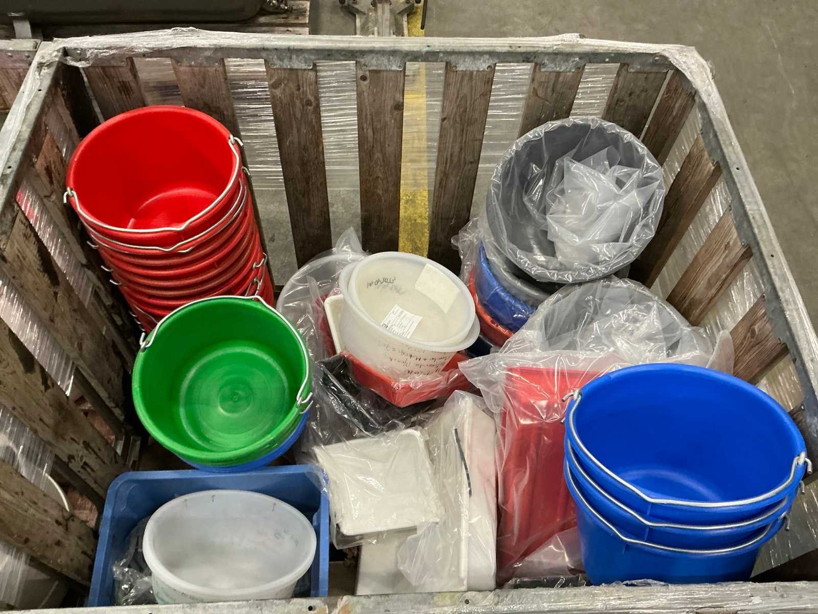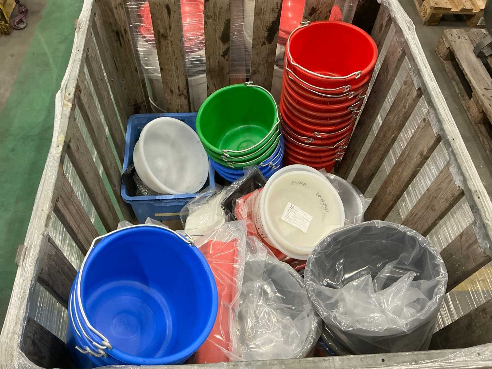 Circa 46 stuks diverse modellen en kleuren emmers en kunststof kratten; let op kavel wordt verkocht zonder palletbox.