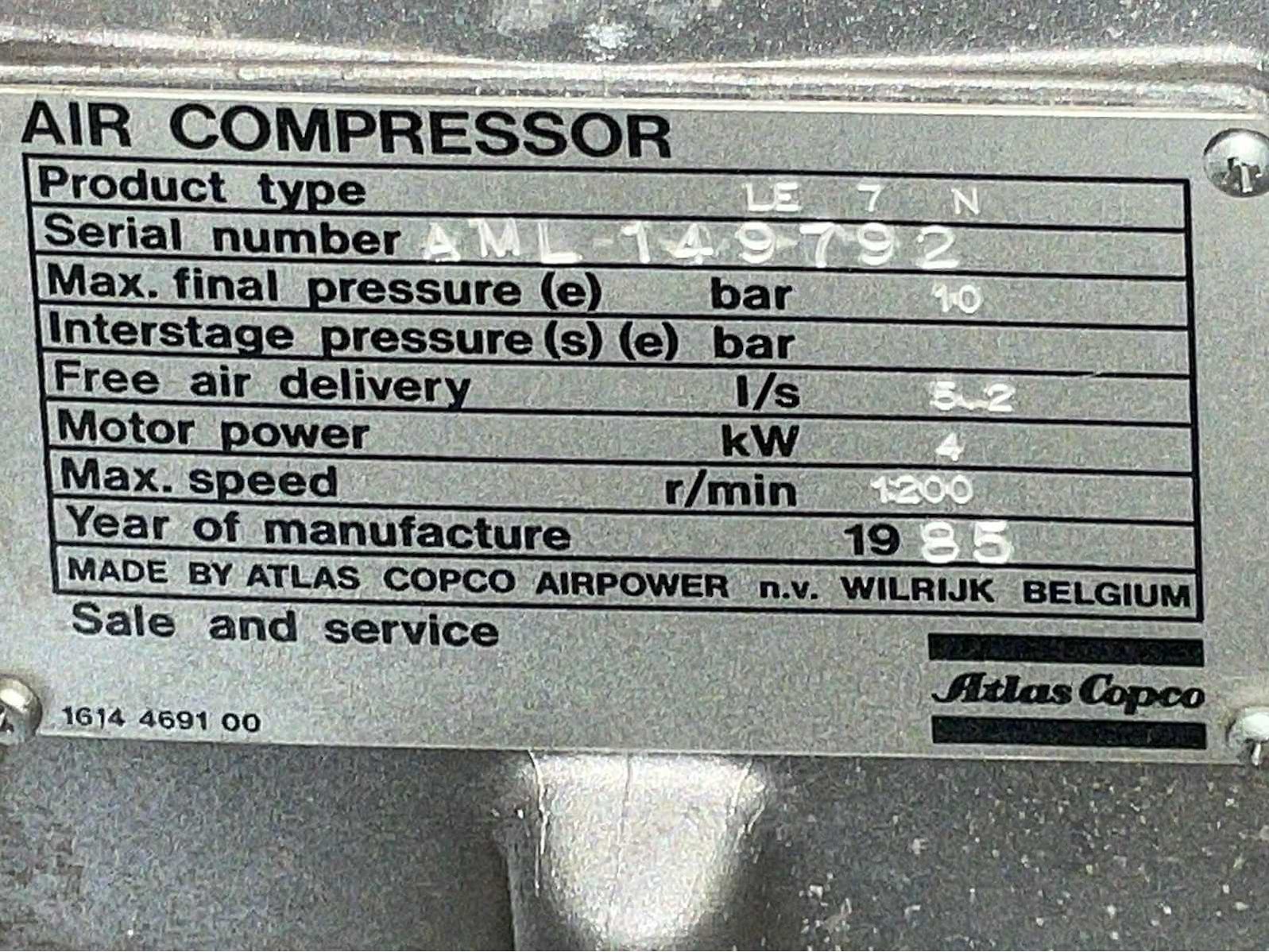 Merk: Atlas Copco Type: LE 7 N Bouwjaar: 1985 Capaciteit.: 10bar Vermogen: 4kW Buffertank inhoud: 250l Aansluiting: 380V Totale afmeting L: 1300mm Totale afmeting Breedte: 560mm Totale afmeting Hoogte: 1170mm