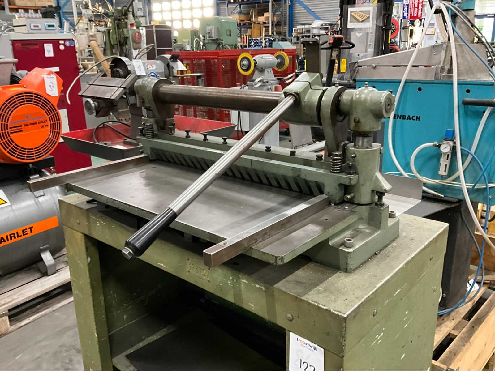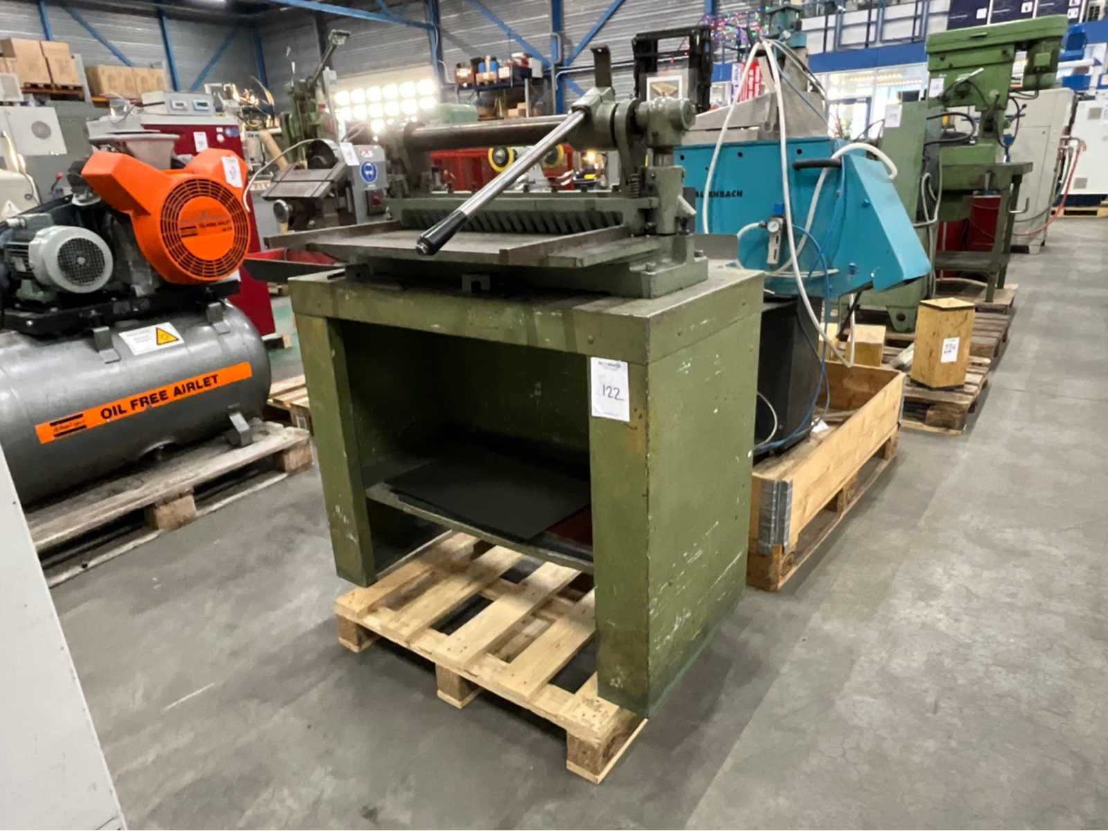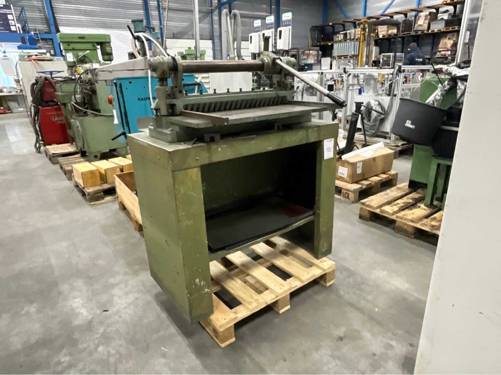 Maximale capaciteit 0,5 mm; werkbreedte 600 mm; regelbare achteraanslag; handbediend; Totale afmeting L: 960mm Totale afmeting Breedte: 760mm Totale afmeting Hoogte: 1200mm