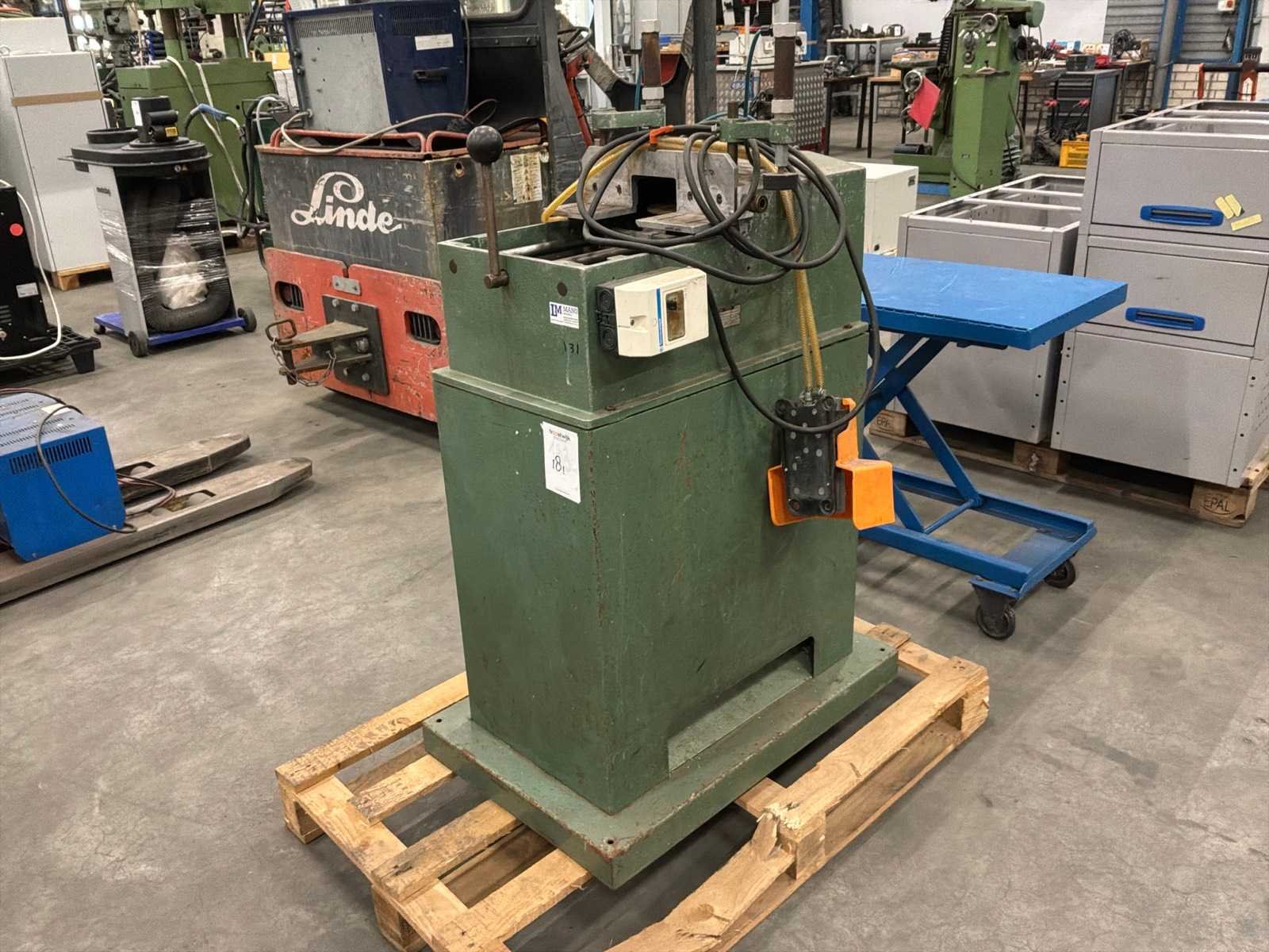 Voorzien van voetbediening Merk: Haffner Type: GL179 Serienummer: 947 Zaagblad Ø: 160mm Verstekhoek max.: 45° Aansluiting: 380V Afmeting l: 750mm Afmeting b: 460mm Afmeting h: 1230mm