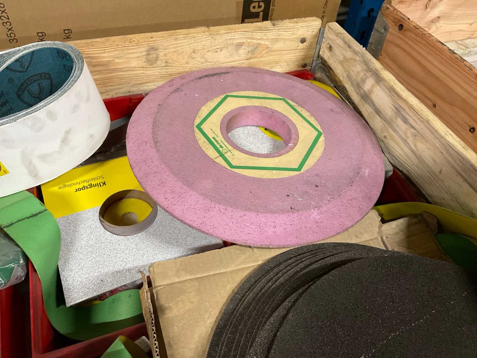 Waaronder diverse slijpschijven, slijpstenen, kettingen, schuurband, kunststof afdopmaterialen en kunststof ton ø circa 50 cm hoogte circa 70 cm; zonder palletbox;
