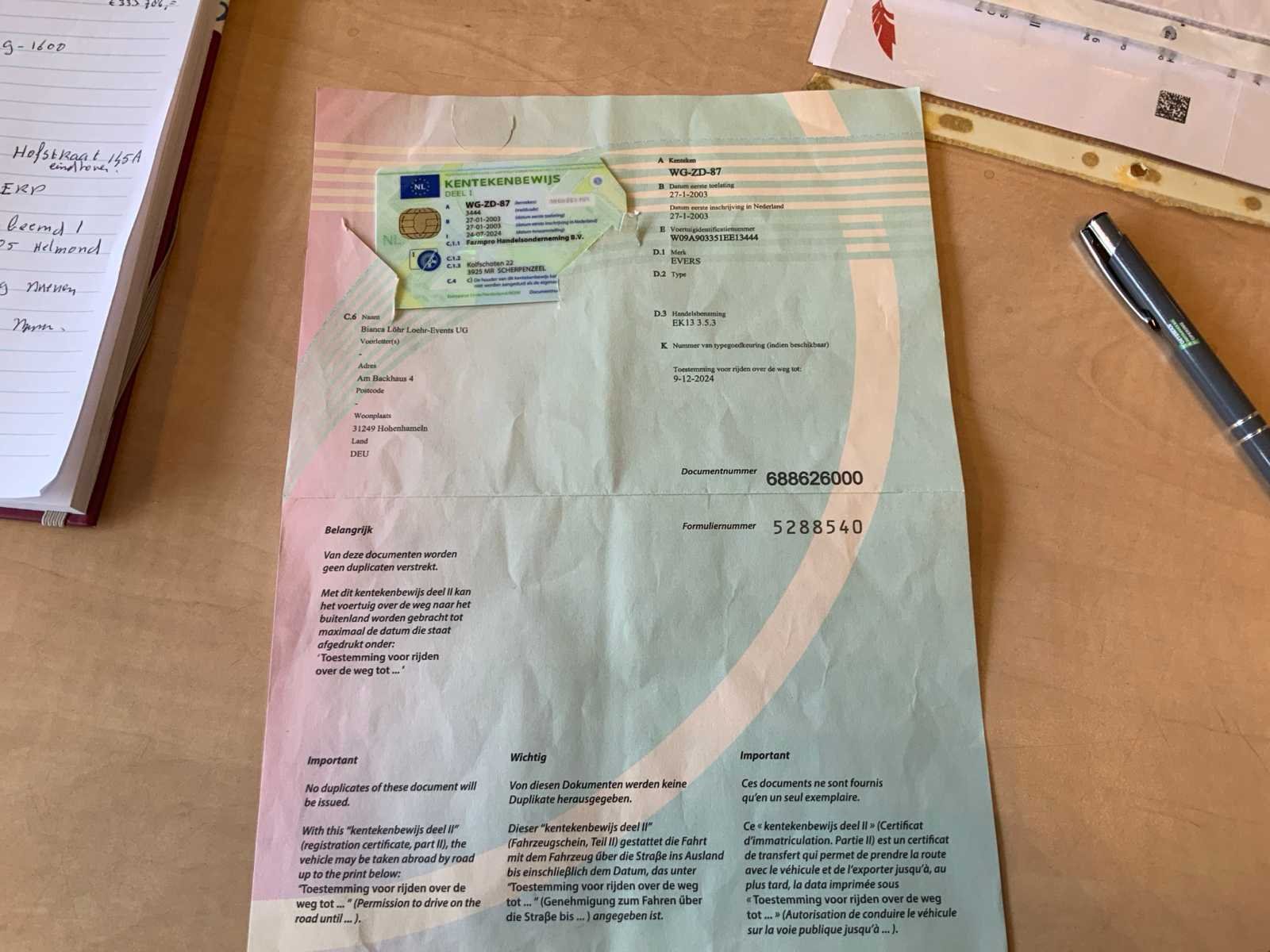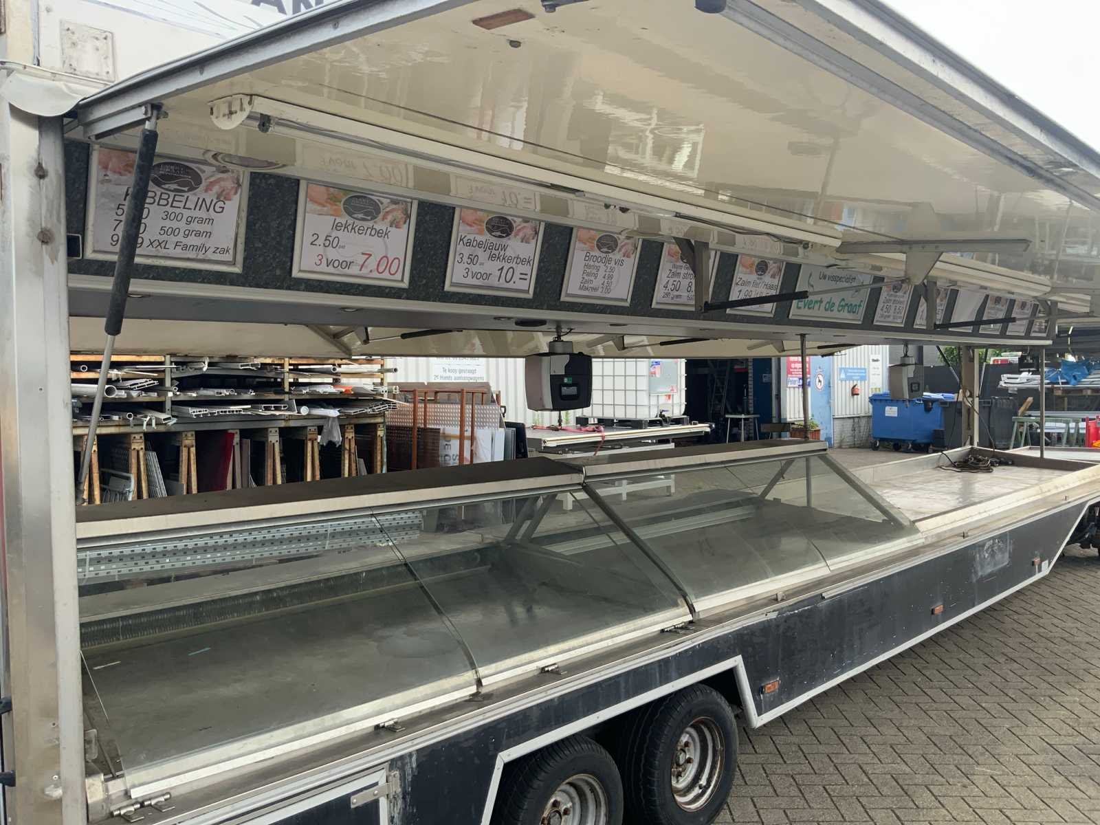 Inclusief toonbank met koeling, verlichting, 2 Avery Berkel digitale hangweegschalen, type: IM500, weegvermogen: min. 100 g / max. 15 kg, aansluiting 230 volt, voorzien van hydraulische radiografische mover met afstandbediening en tochtstroken Merk: Evers Type: EKB 353 Bouwjaar: 2002 Chassisnummer: W09A903351EE18444 Aantal assen: 3 Ledig gewicht: 4600kg Laadvermogen: 800kg Datum eerste toelating: 2003-01-27 Datum eerste toelating (NL): 2003-01-27 Kenteken: WG-ZD-87 Hoogte: 302cm Lengte: 900cm Breedte: 157cm