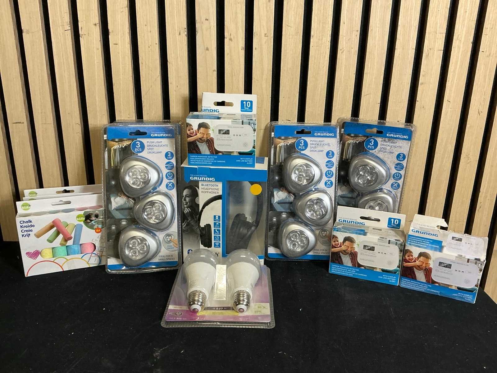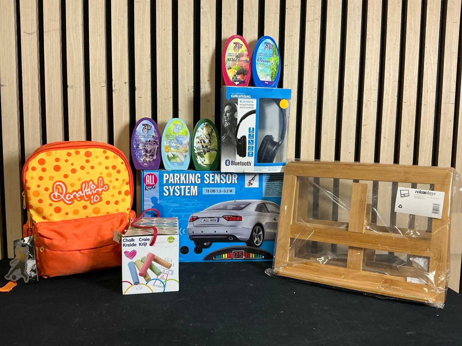 1e: Kinder rugtas 2e: Krijt 3e: Bluetooth koptelefoon 2x 4e: Airfresheners 5x 5e: Parking sensoren 6e: Tafel tennis bats 10x 7e: Grundig druklampjes 3x 8e: 2X koolstofmeter