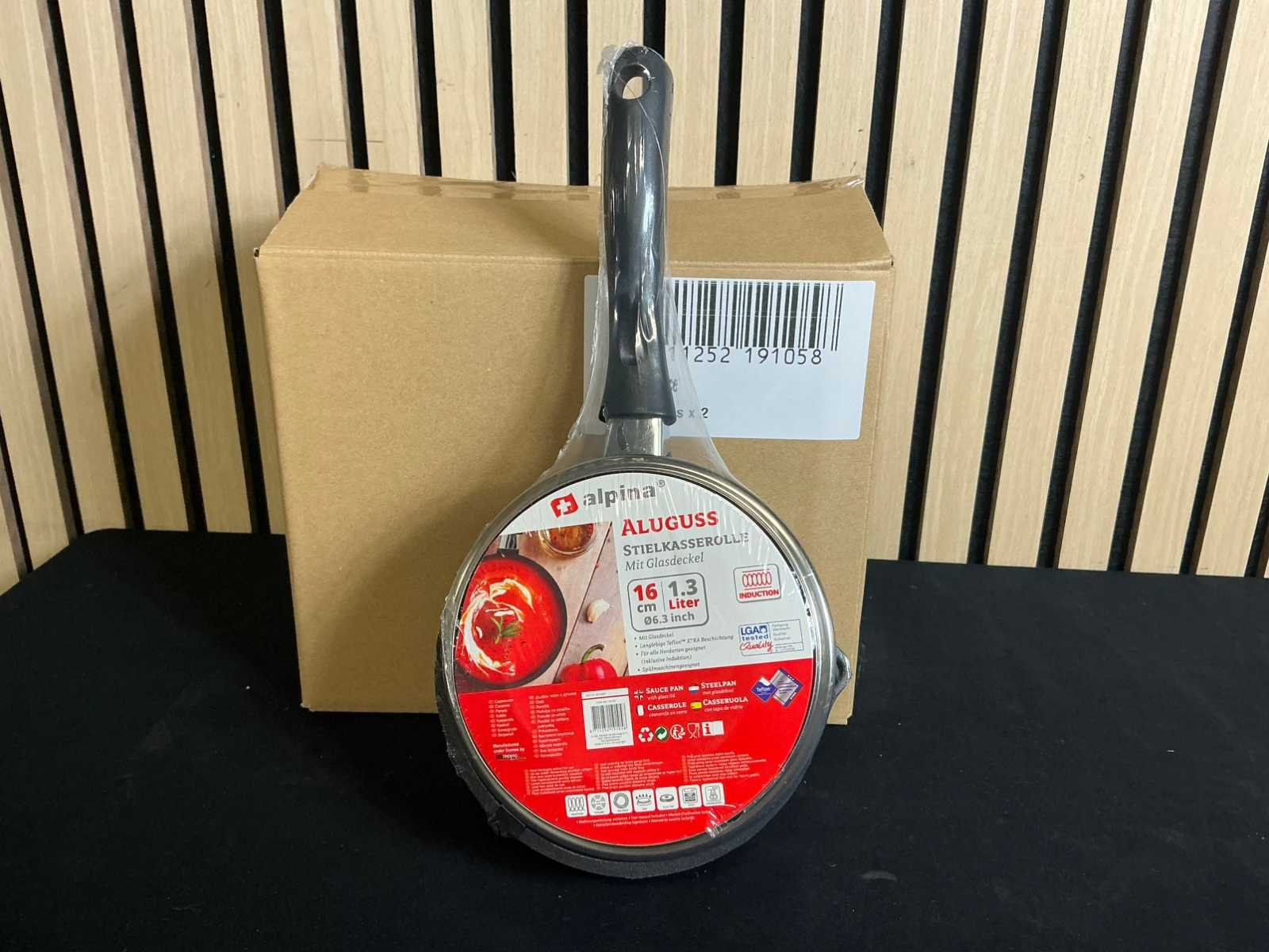 Product zit ongebruikt in de originele verpakking Afmetingen: Ø 16 cm x 8,5 cm Inhoud: 1,3 liter Vaatwasmaschinebestendig Geschikt voor alle soorten warmtebronnen Merk: Alpina Kleur: Zwart