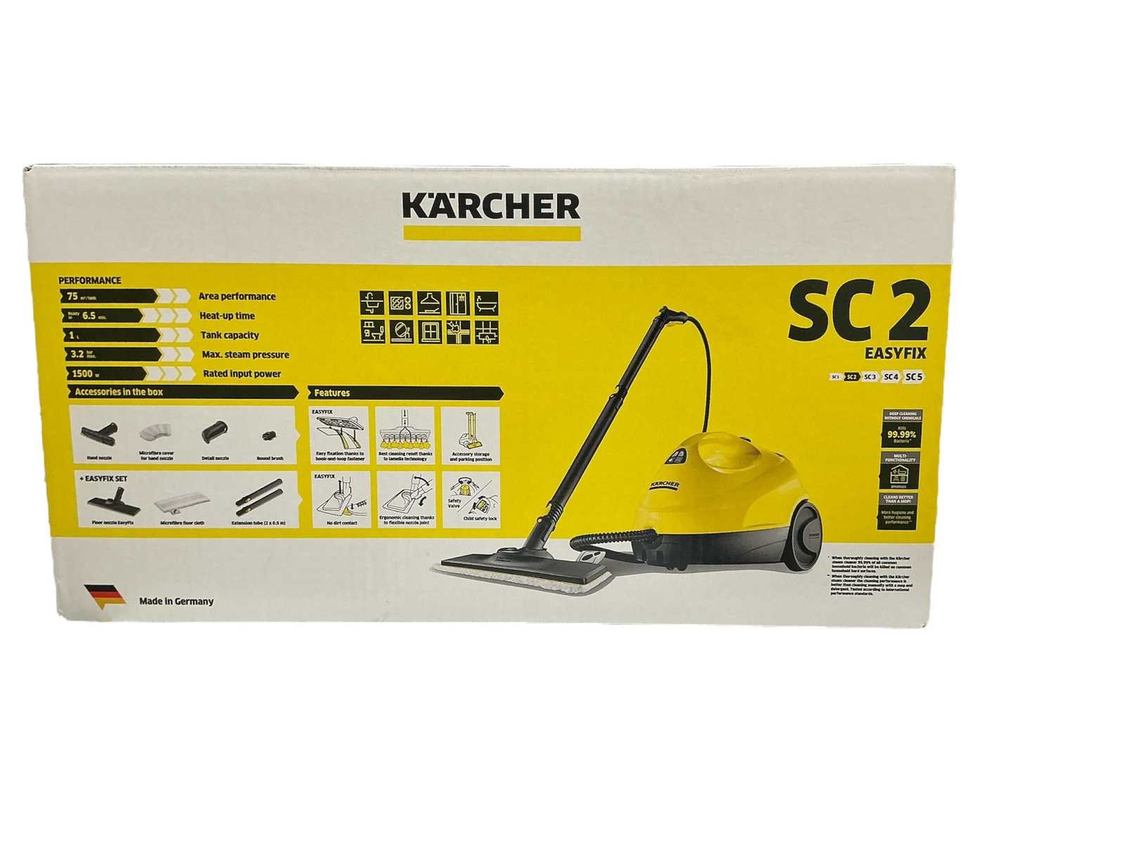 Product zit ongebruikt in de originele verpakking Merk: Kärcher Model: SC2 easyfix Kleur: Geel