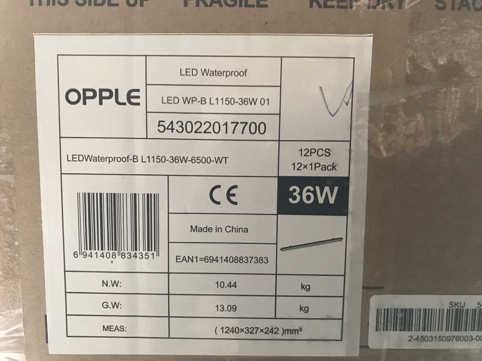LED: ja; vermogen: 36W; lichtopbrengst:4500 lm; kleurtemperatuur: 6500 K; gemiddelde levensduur: 30000 hr; beschermingsgraad (IP): 65; totale afmeting L: 1167 mm; totale afmeting H: 69mm; omschrijving: ongebruikt in de verpakking; loc. 17900 Merk: Opple Product type: L1150 Wattage: 36W Kleurtemperatuur: 6500