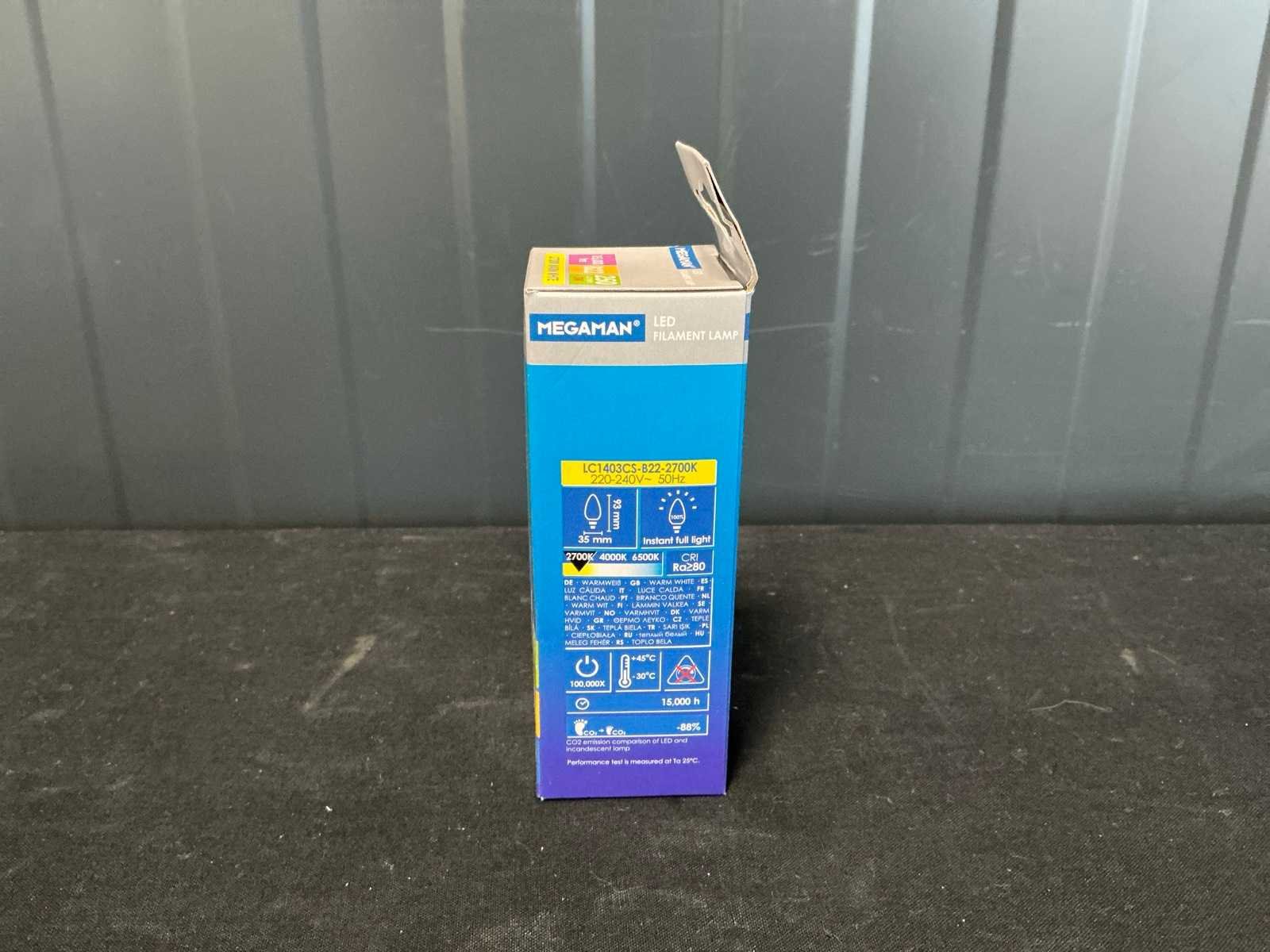 Product zit ongebruikt in de originele verpakking. Merk: Megaman Model: MM05765 Energielabel: A+ Fitting: B22 Kleurtemperatuur: 2700k