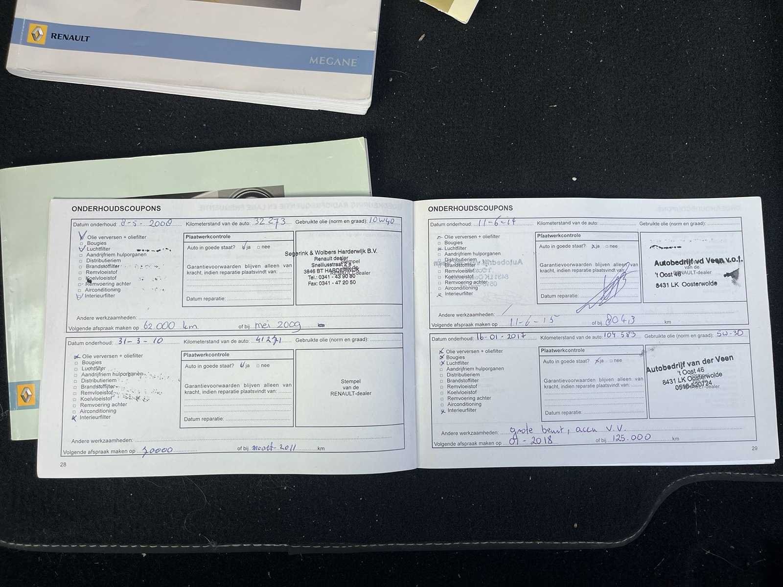 Kenteken: 95-XF-KL Merk: Renault Model: Mégane Coupé-Cabriolet Type: 1.6-16V Exception Bouwjaar: 2007 Afgelezen kilometerstand: 167583km Cilinderinhoud: 1598cc Vermogen (kW): 82kW Brandstof: Benzine Chassisnummer: VF1EM1R0H37640547 NAP status: Logical Datum eerste toelating: 2007-05-04 APK vervaldatum: 2026-03-01 Vermogen (pk): 110hp Aandrijving: FWD Aantal zitplaatsen: 4 Maximaal trekgewicht ongeremd: 650kg Maximaal trekgewicht geremd: 1200kg Kleur: zwart Transmissie: Handgeschakeld (5) Emissieklasse: 4 Aantal deuren: 2 Aantal sleutels: 1 Ledig gewicht: 1295kg Bruto BPM (NL): 8011€ Aantal cilinders: 4 Carrosserie: Cabriolet Nationaliteit documenten: Nederlands Onderhoudshistorie: Aanwezig danwel digitaal Carfax Link: https://was.carfax.eu/v0/api/ccdid/5100016408/svc/201/vinreg/95XFKL/checksum/eyJhbGciOiJIUzI1NiIsInR5cCI6IkpXVCJ9.eyJleHAiOjE3NzczMDcxMDB9.Mghb9vNtmMoMtoowtpVEdHTV9N3wgcz_mXR5cm8hLvY Start en rijdt: Start and drive startinformatie : Start en rijdt Self drive export possible : true Airconditioning: true Navigatie: false LED-koplampen: false
