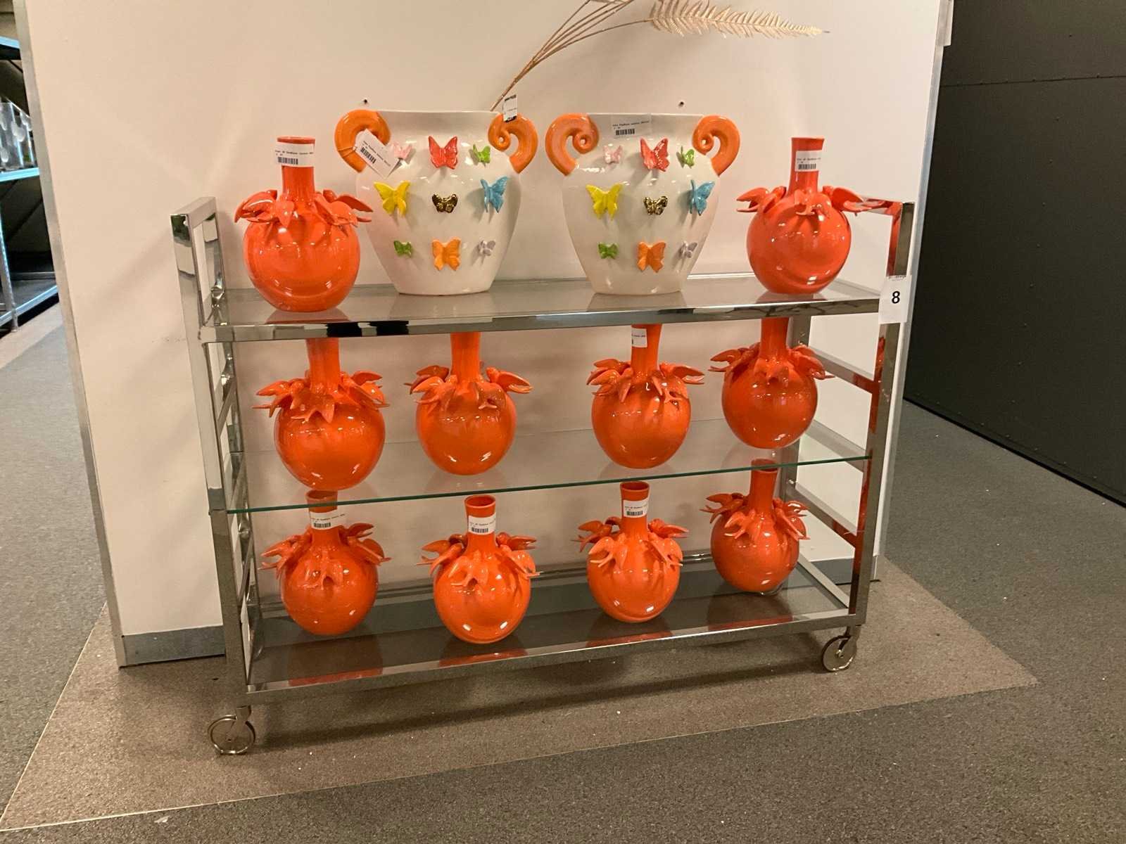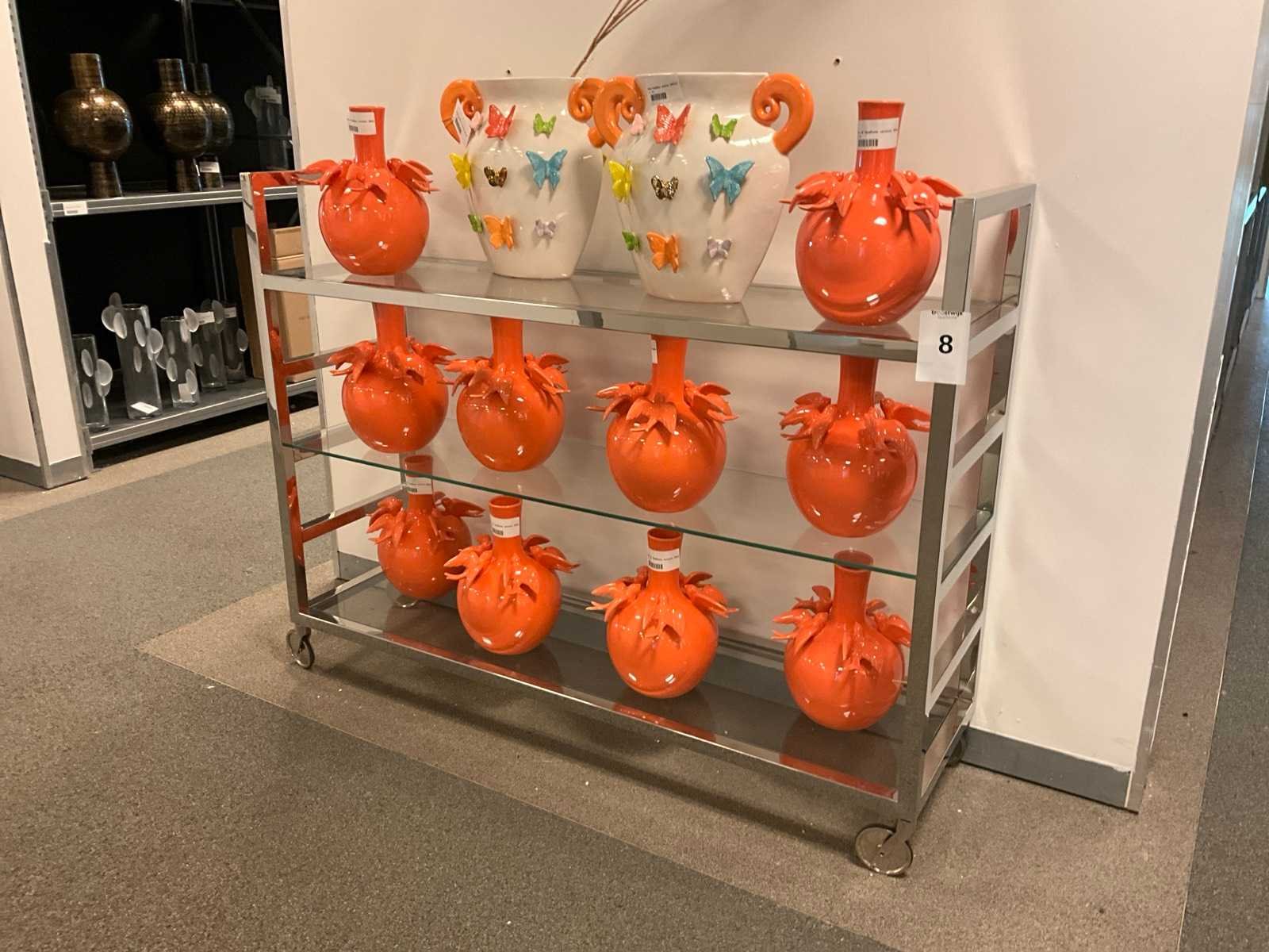 Afmetingen 10x 25x25x32 cm en 2x 41x12x37 cm; inclusief verrijdbaar presentatierek, afmeting 140x40x109 cm