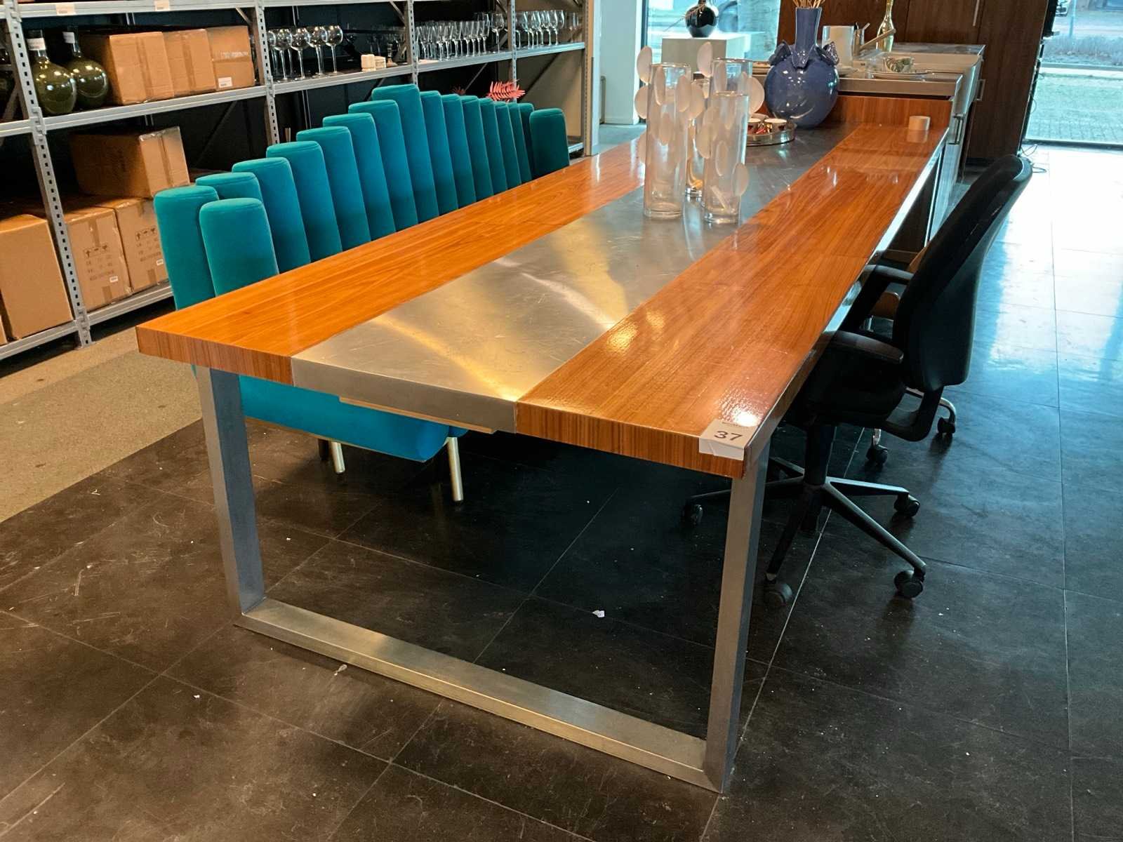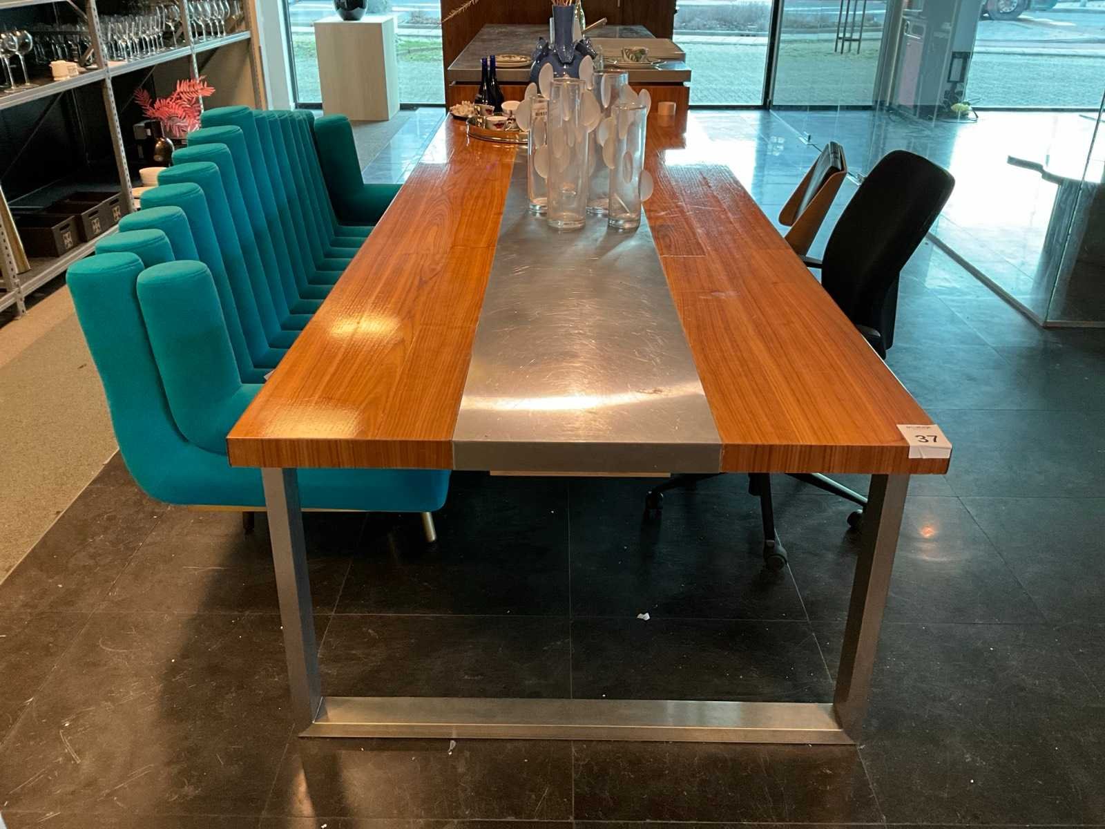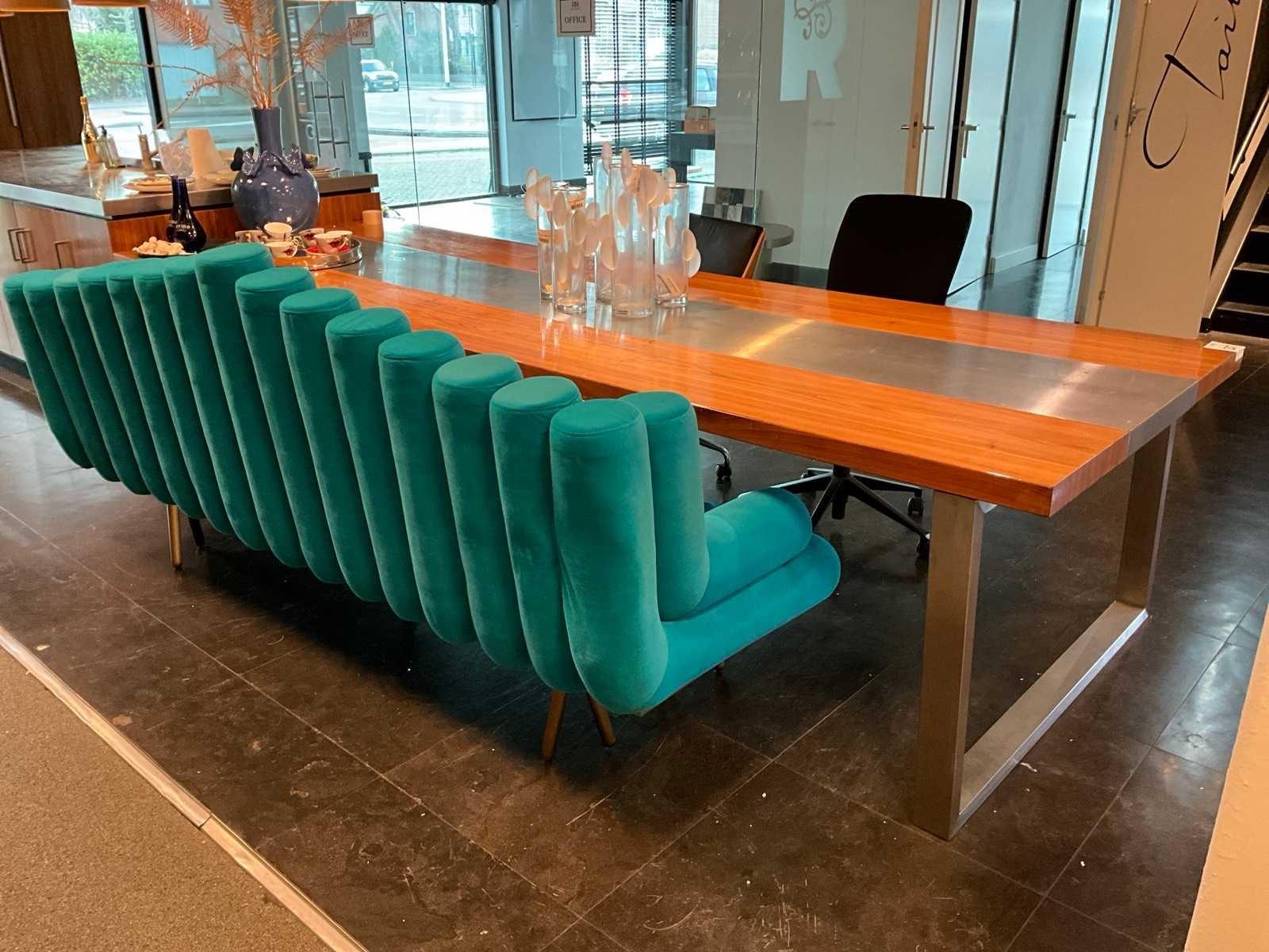 Bestaande uit eetkamertafel 350x120x78 cm; eetkamerbank 240x103x76 cm en 2 diverse stoelen