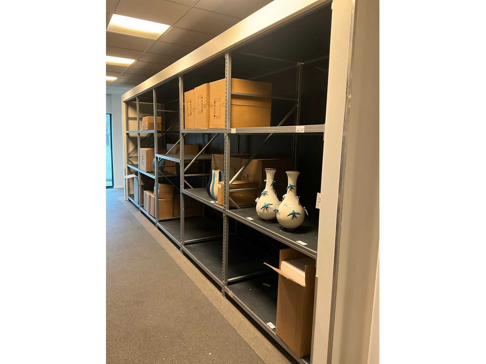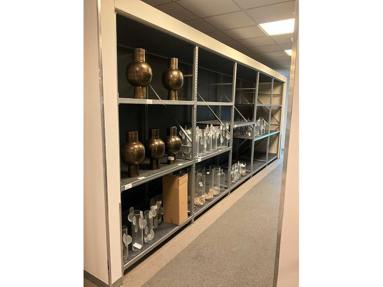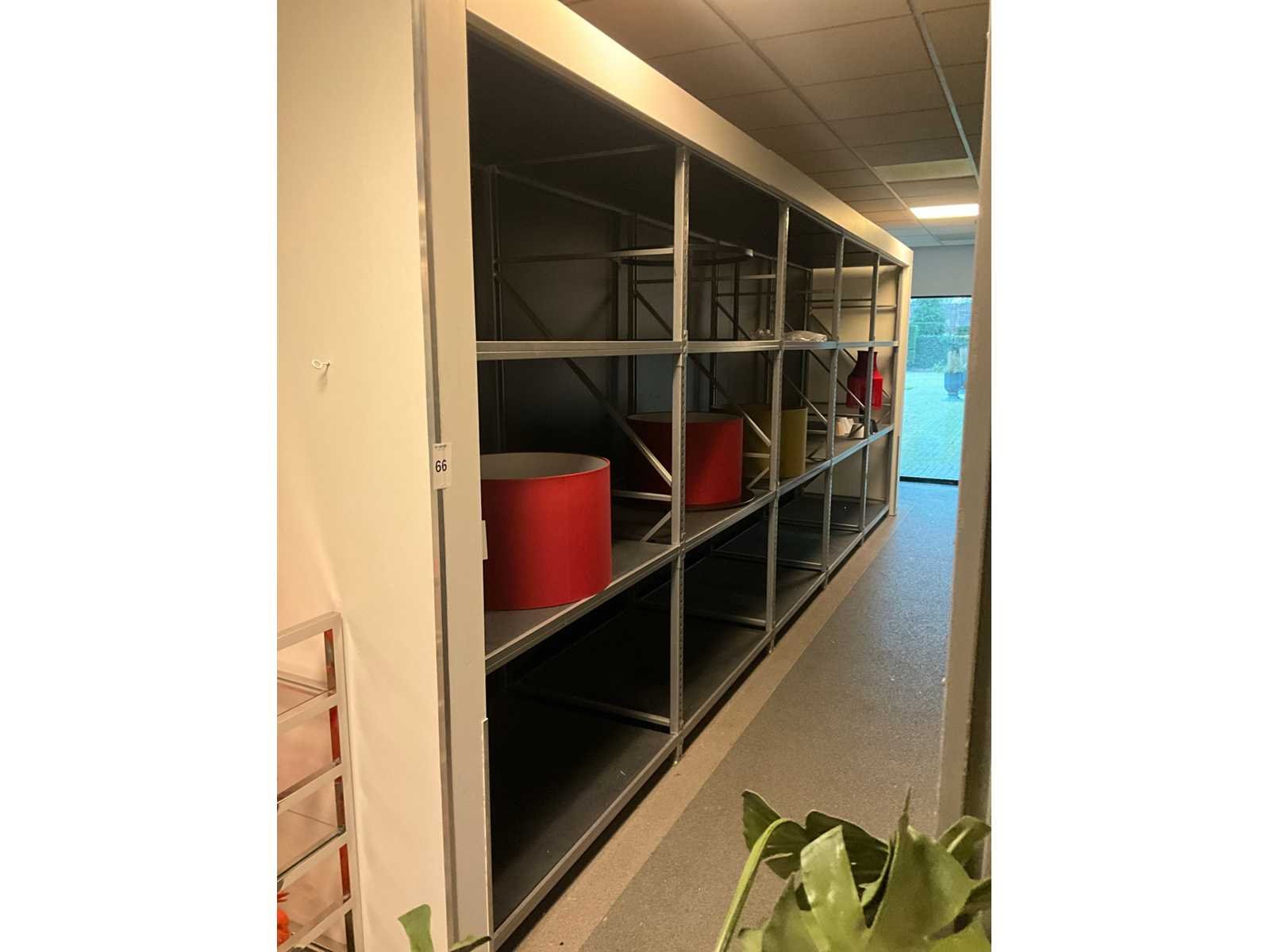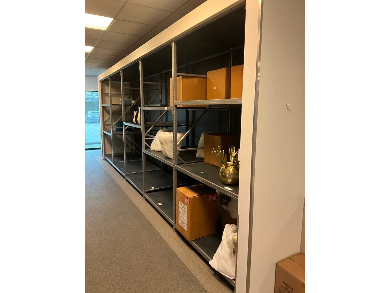 Let op, inhoud en houten ombouw niet inbegrepen; dit kavel kan uitsluitend afgehaald worden op dinsdag 31-03-2026 Aantal secties: 50 Sectie afm. b: 1250mm Sectie diepte: 900mm Aantal staanders: 60 Aantal liggers: 370 Aantal legborden: 185 Demontabel: true Totale afmeting Hoogte: 250cm