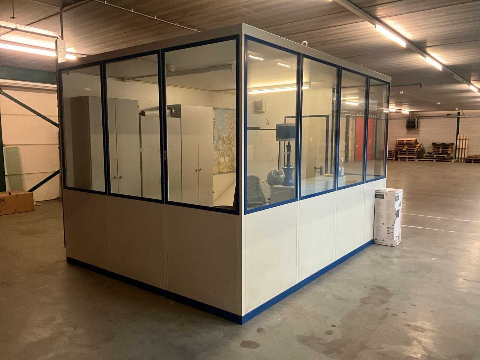 Voorzien van bureautafel; stoelen; archiefkasten; landkaart; whiteboard; kachel; brandblusser; verlichting; rookmelder en hijsogen boven op unit Totale afmeting L: 4050mm Totale afmeting Breedte: 3050mm Totale afmeting Hoogte: 2680mm