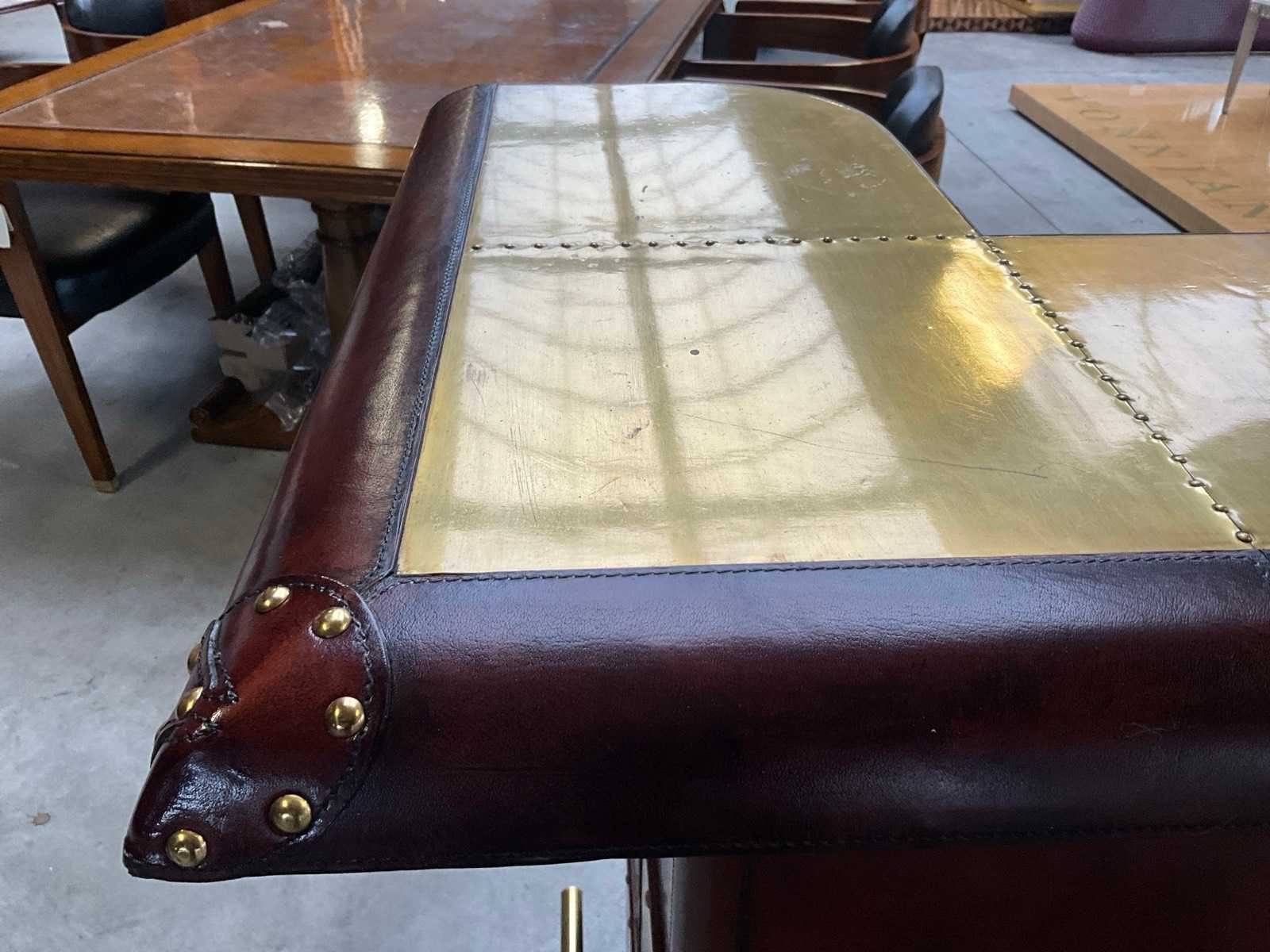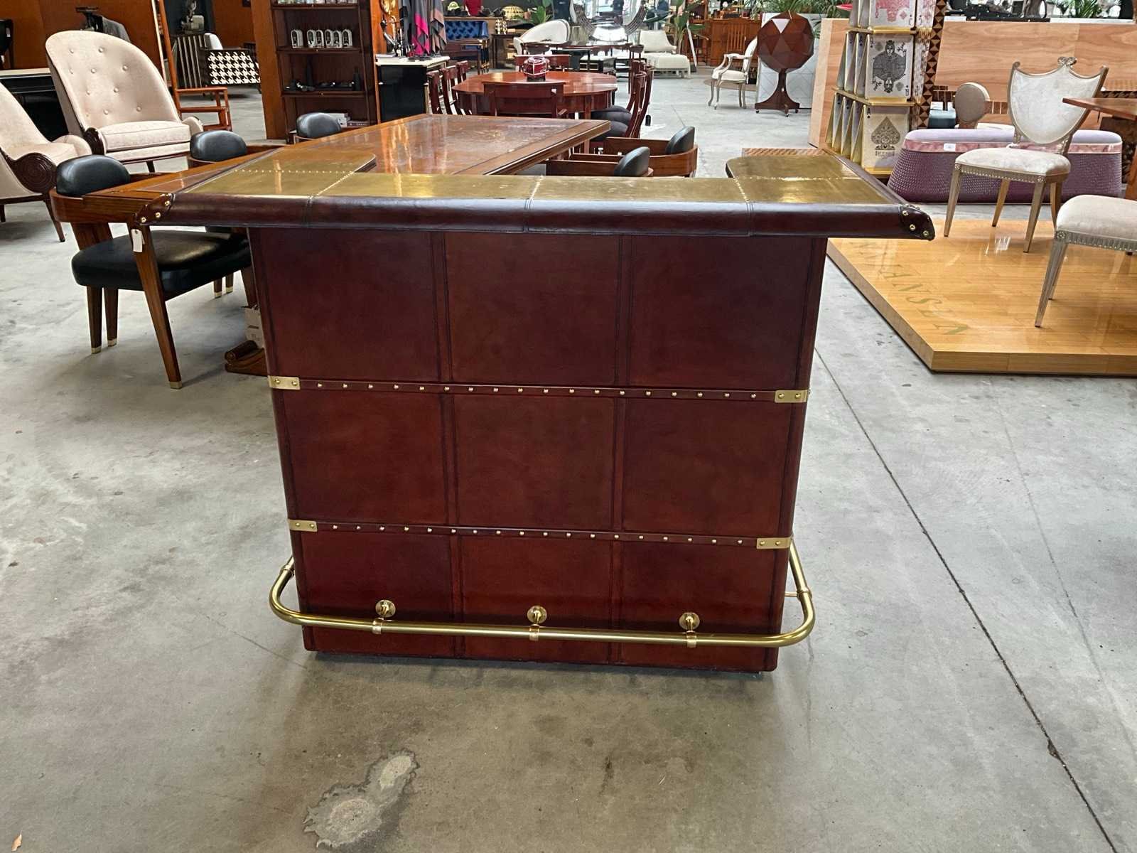 Merk: SFD Model: Bar Counter Materiaal: Hout / leer / messing Lengte: 61cm Breedte: 138cm Hoogte: 107cm