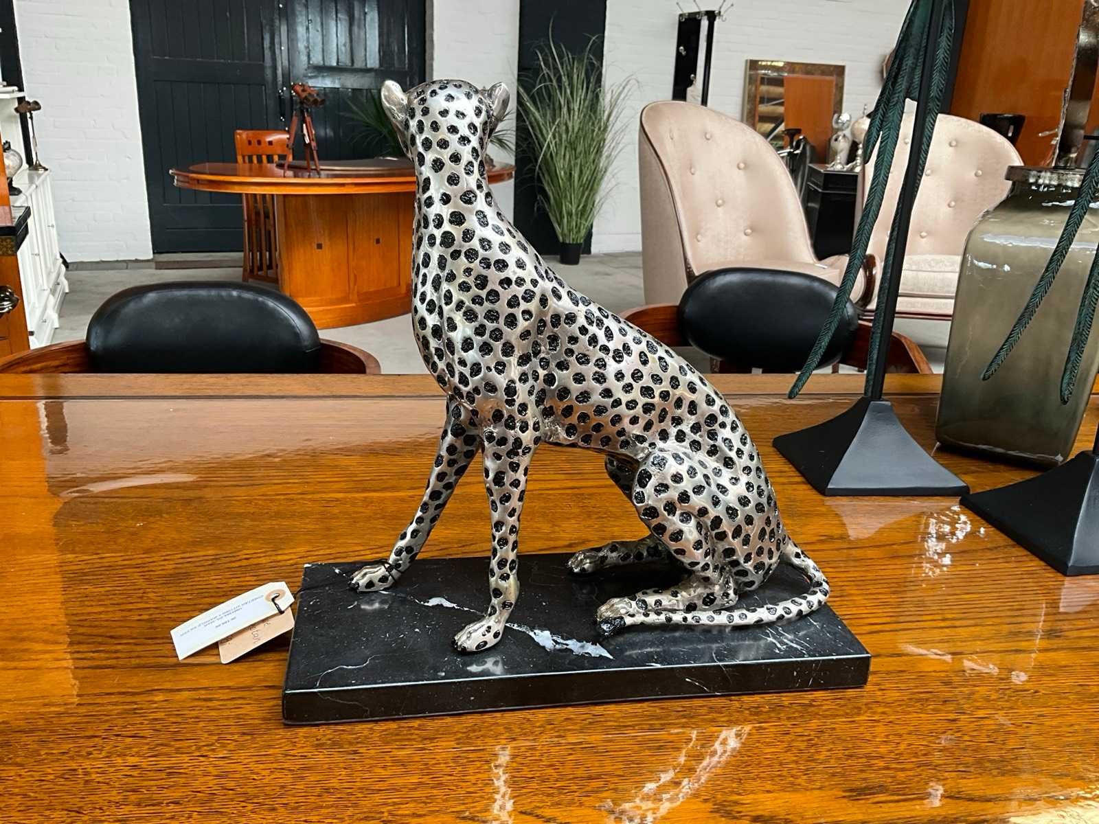 Model: Cheetah sitting Lengte: 37cm Breedte: 16cm Hoogte: 37cm Materiaal: Brons vernikkeld