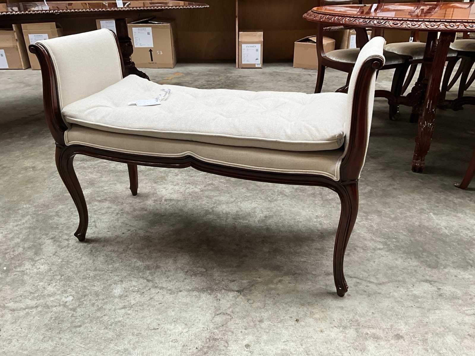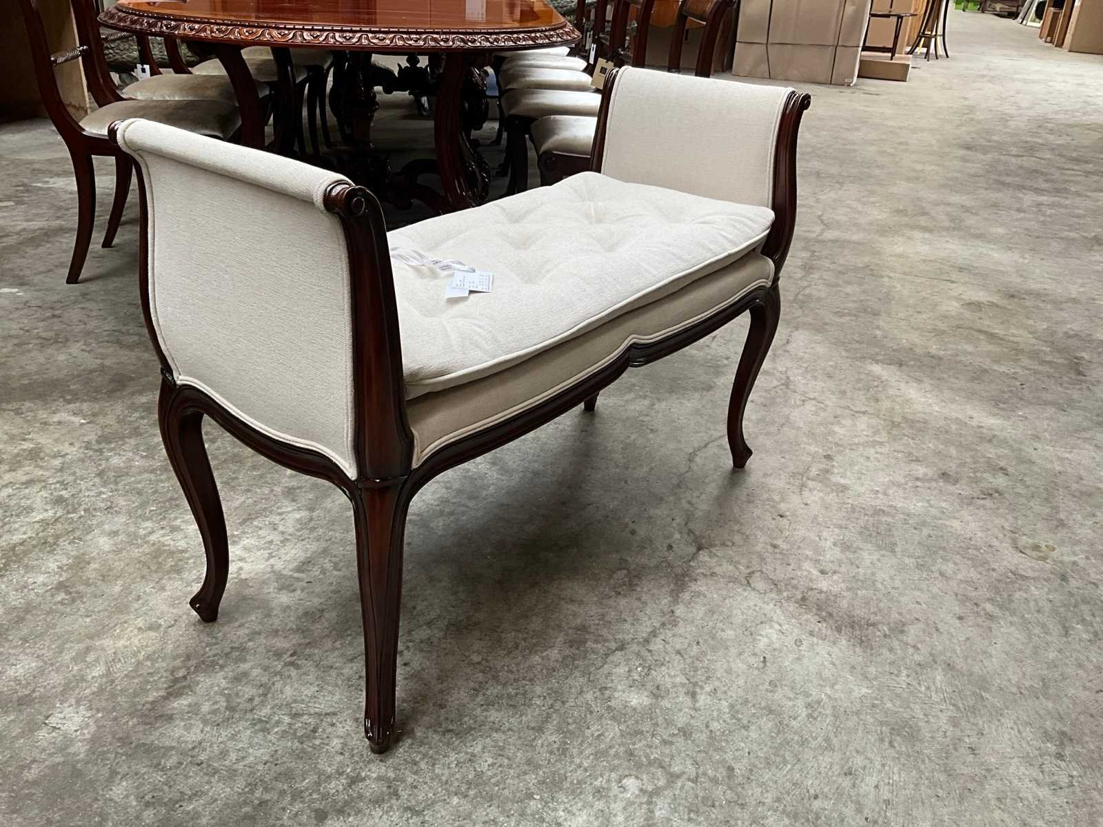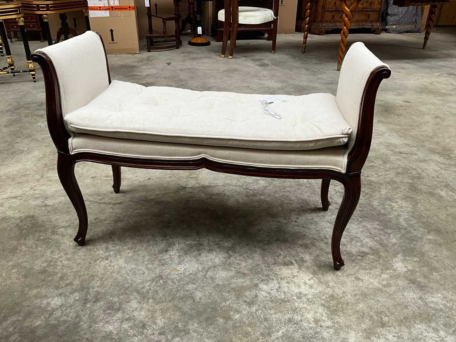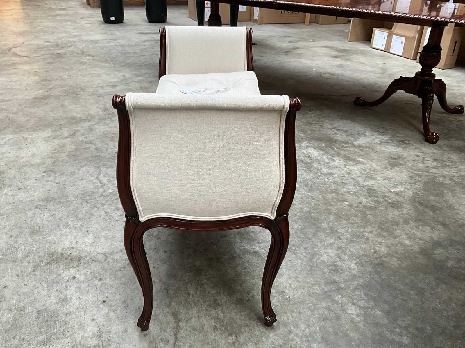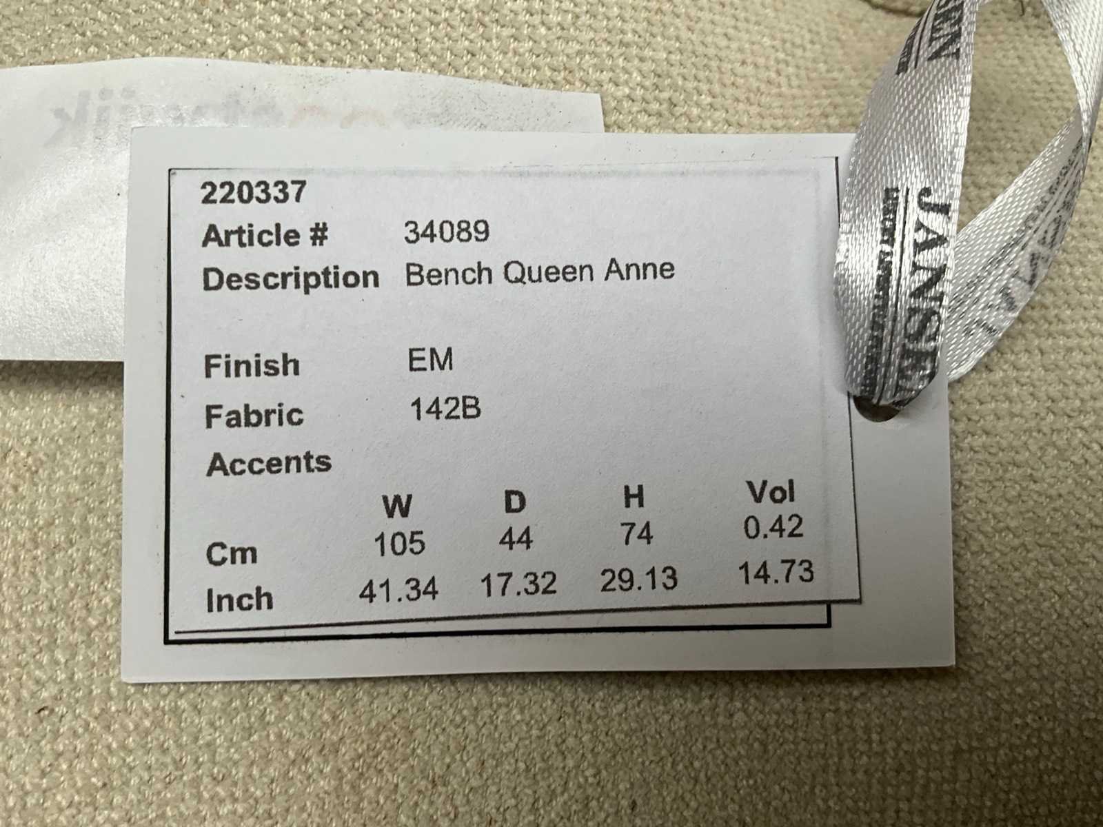 Merk: Jansen Furniture Model: Queen Anne Lengte: 46cm Breedte: 104cm Hoogte: 74cm Zithoogte: 53cm Diepte: 44cm Materiaal: Mahoniehout