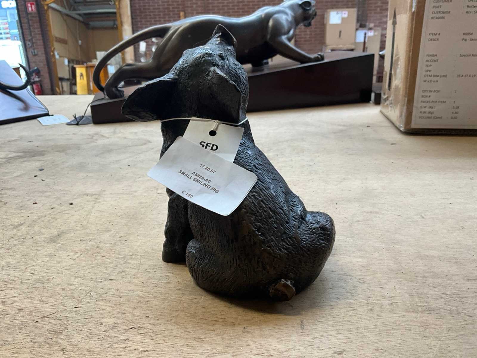 Model: Small smiling pig Lengte: 30cm Breedte: 8cm Hoogte: 17cm Materiaal: Brons